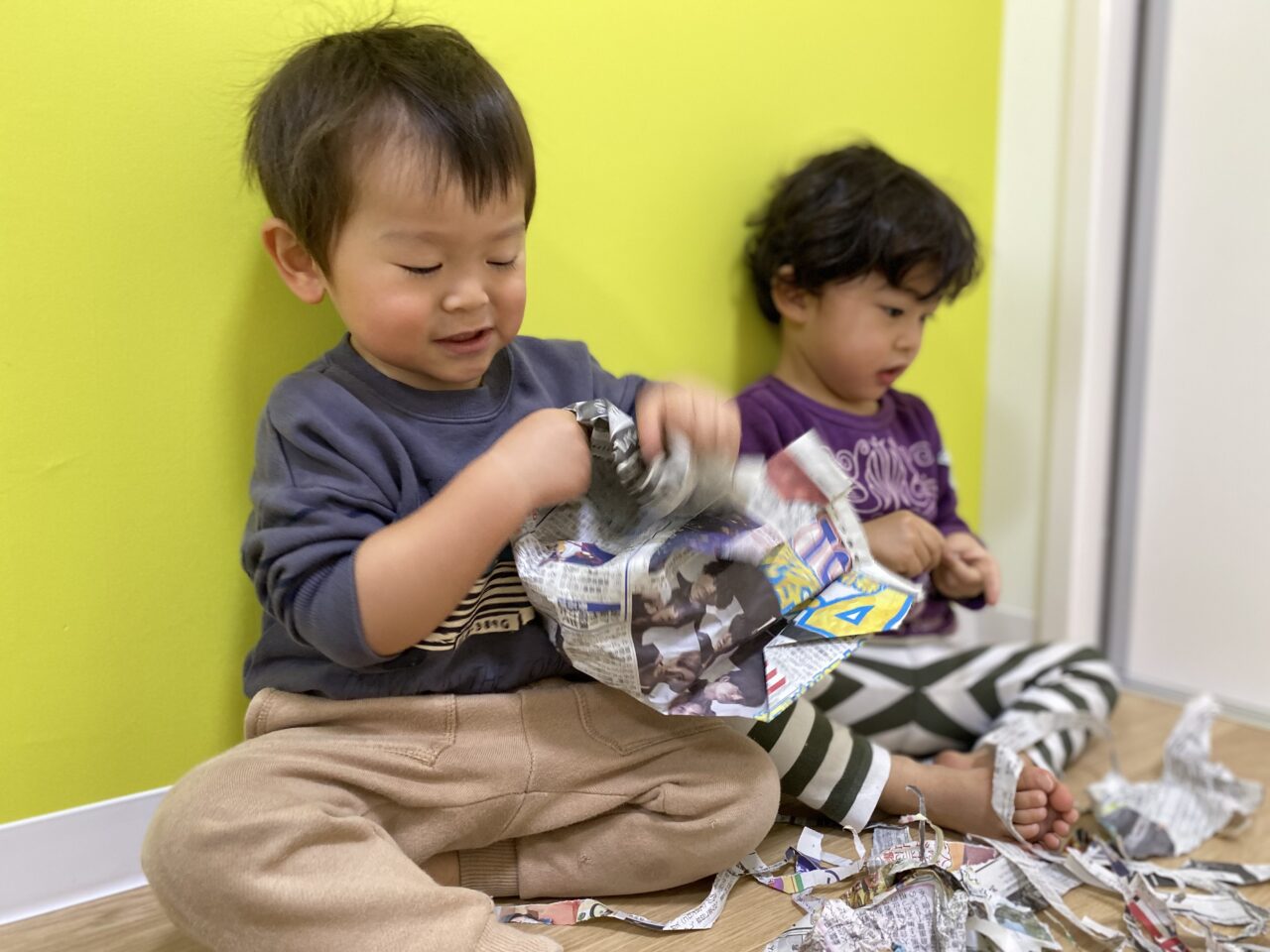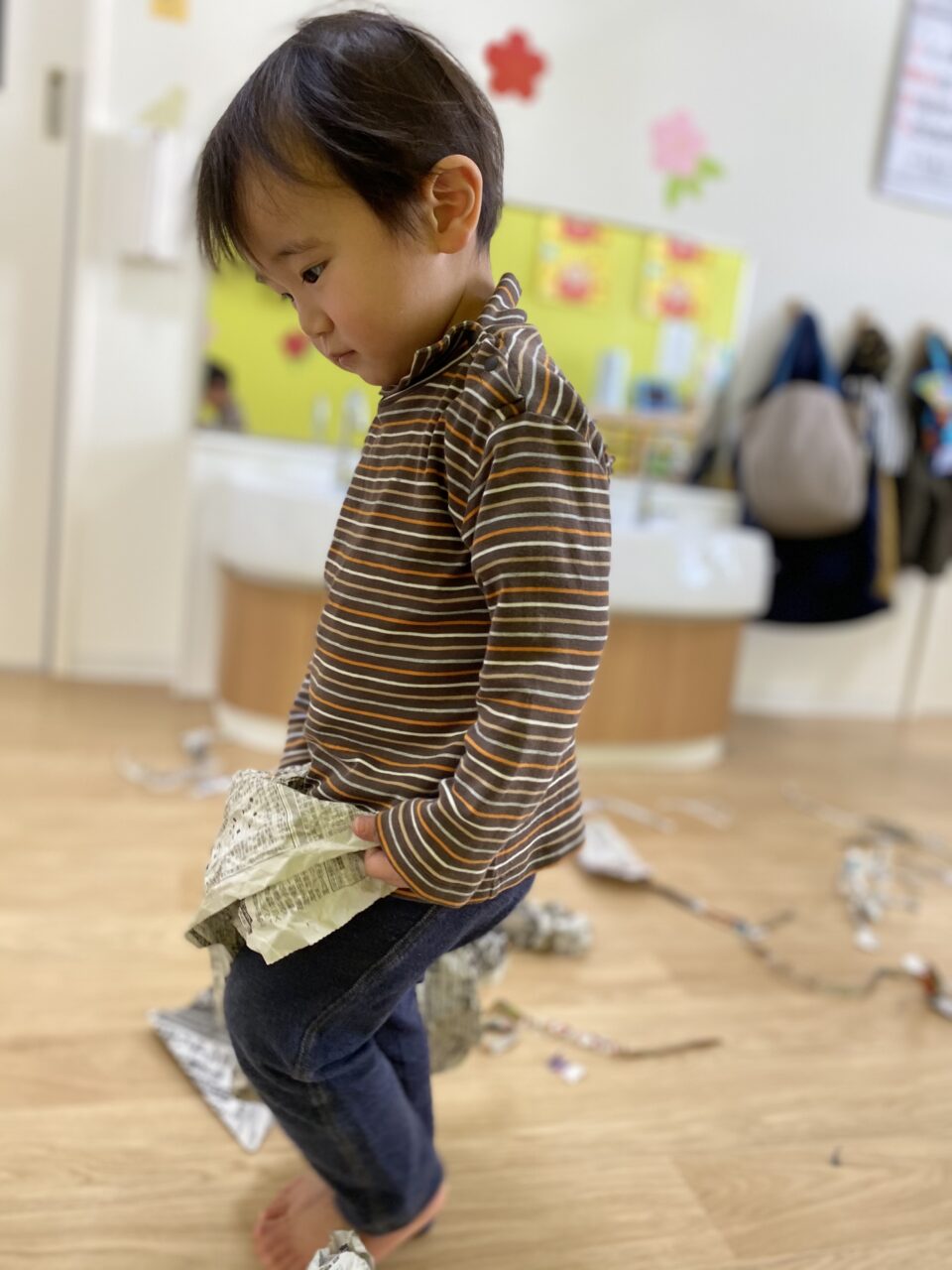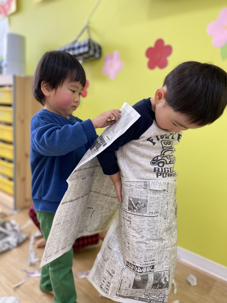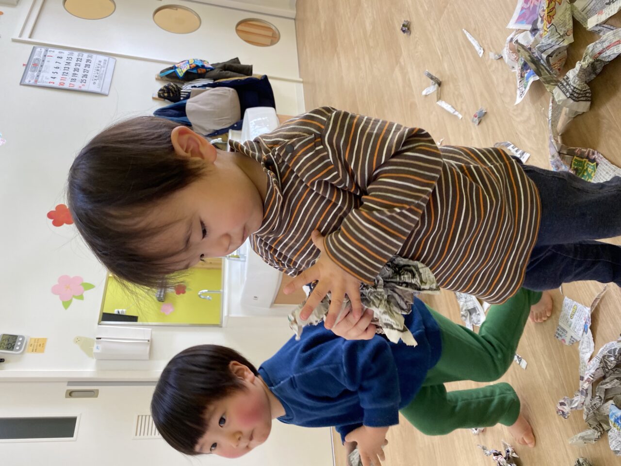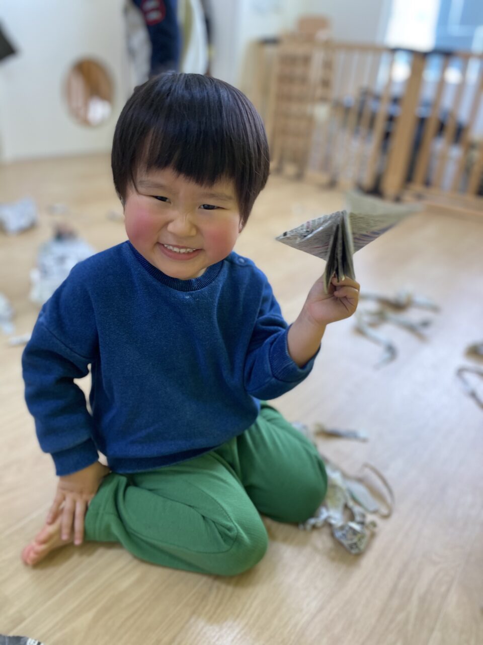 みんないい表情で遊んでますね✨新聞紙だけでも、お友達と先生と一緒だと無限の可能性がありますね❤️