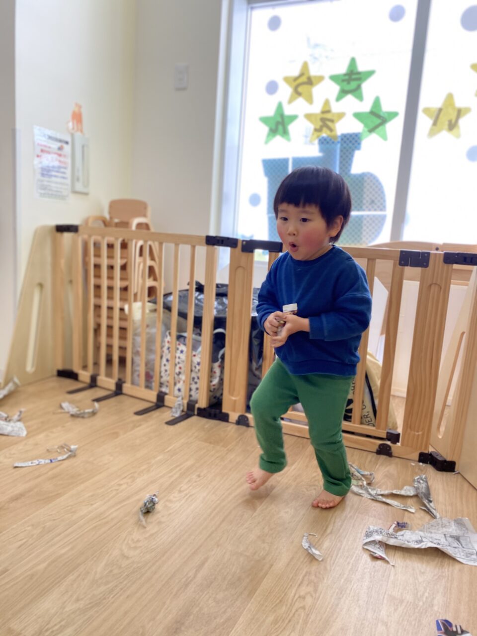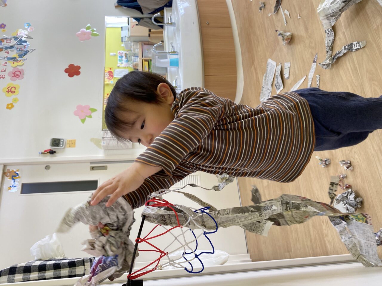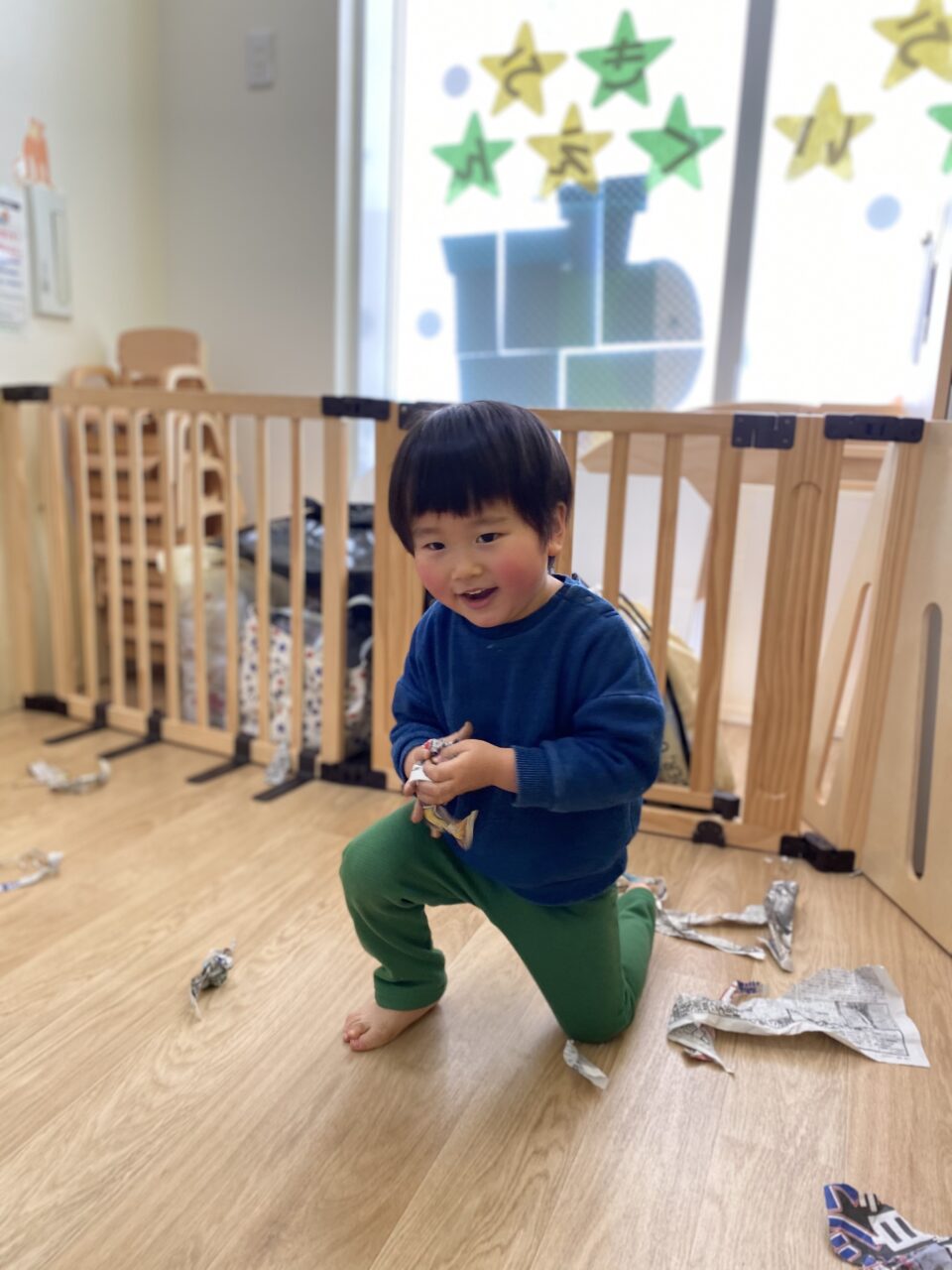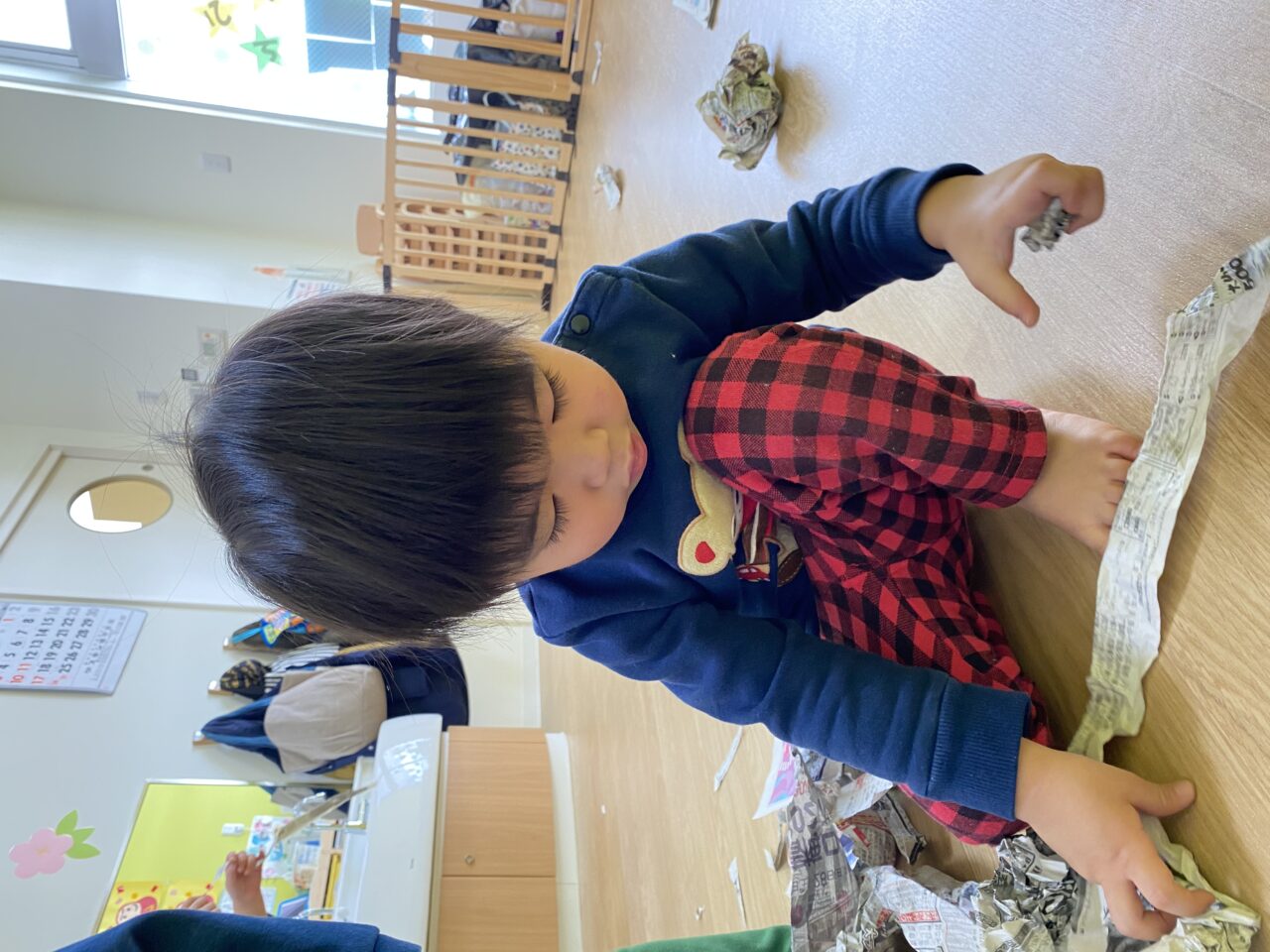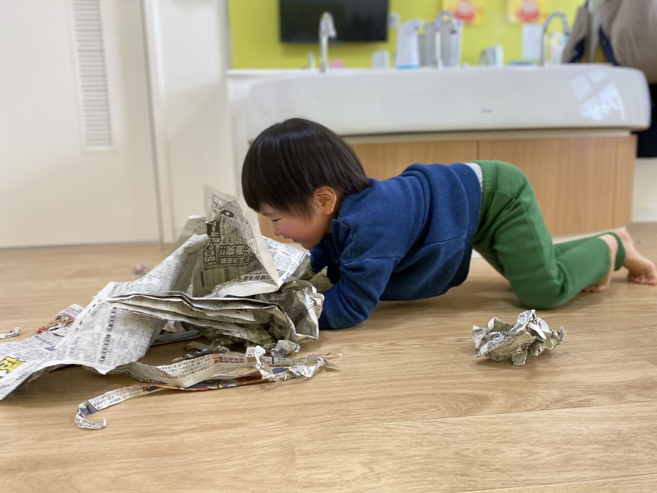 みんないい表情で遊んでますね✨新聞紙だけでも、お友達と先生と一緒だと無限の可能性がありますね❤️
