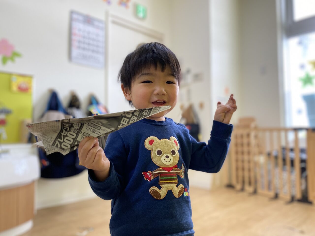 新聞紙を折って、保育士と紙飛行機作り!