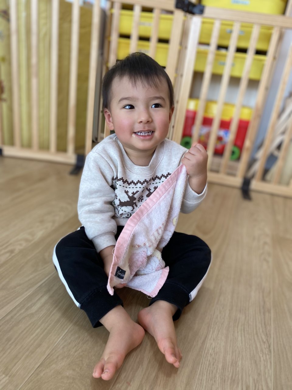 いないいないばあをして楽しんでいるところにカメラを向けるとはにかみ笑顔❤️
