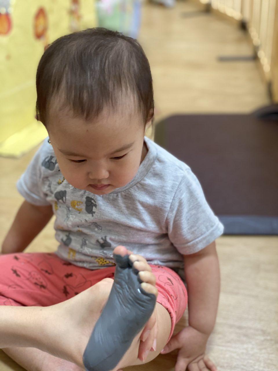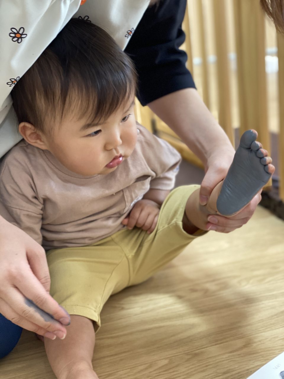 灰色の絵の具を足の裏に塗り塗り〜ぺったん?✨