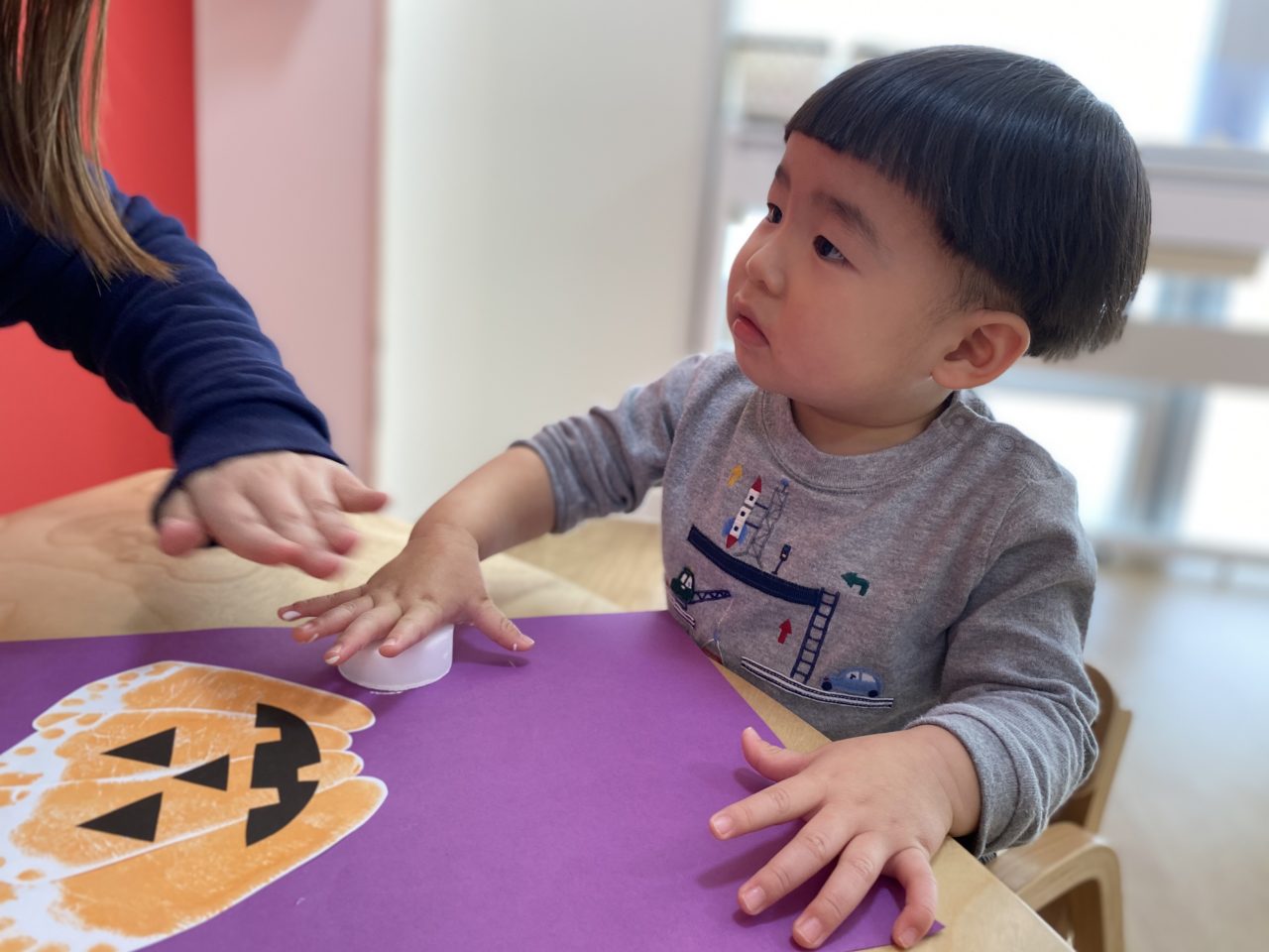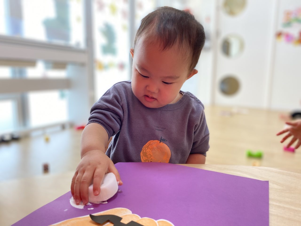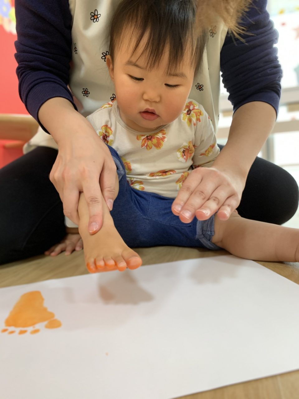 今回もかわいい足にオレンジの絵具を付けてぺったん!ぺったん♡!