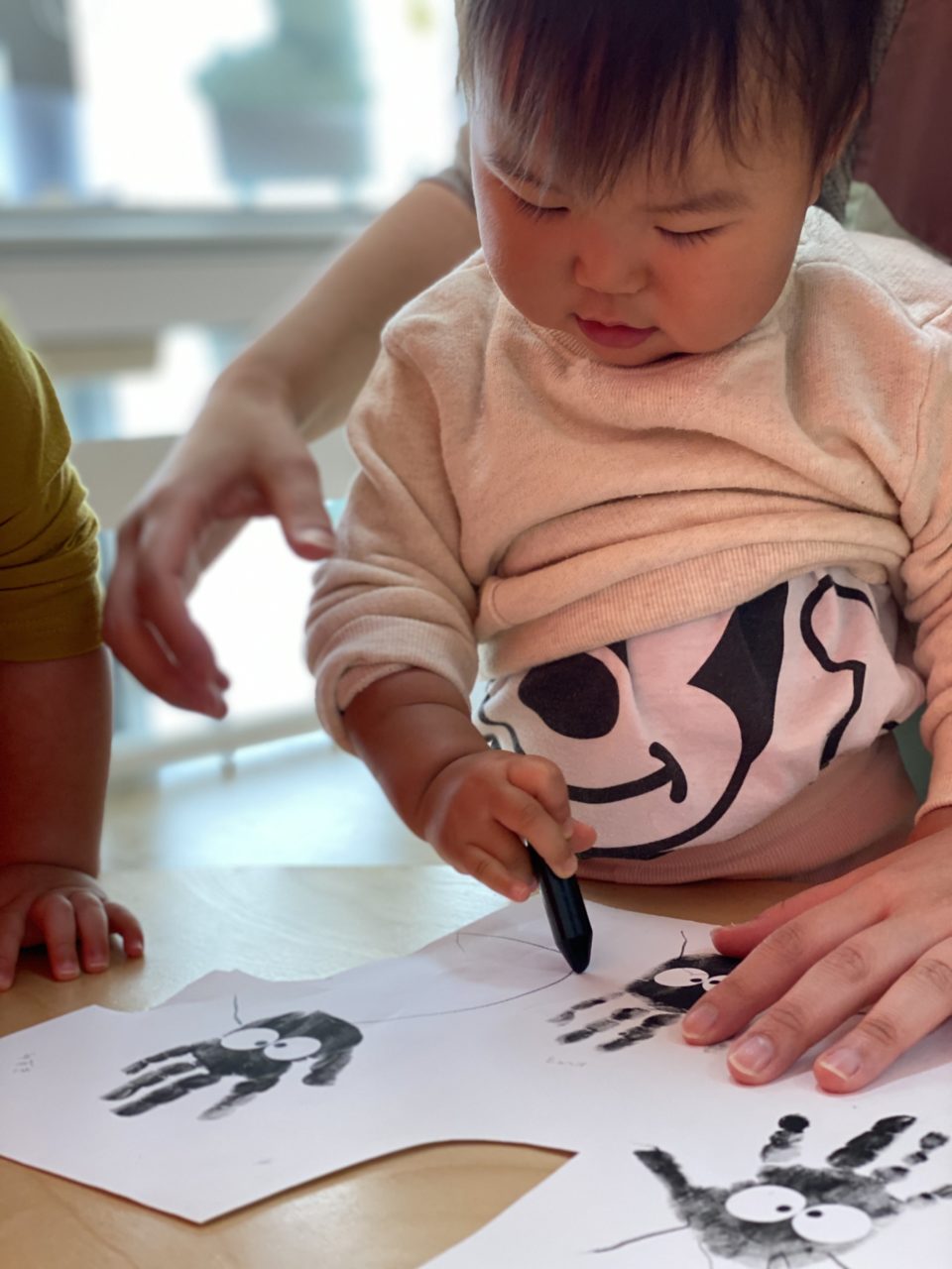次に黒い絵の具で手形をぺったんしたものに〜クレヨンで描き描き?✨