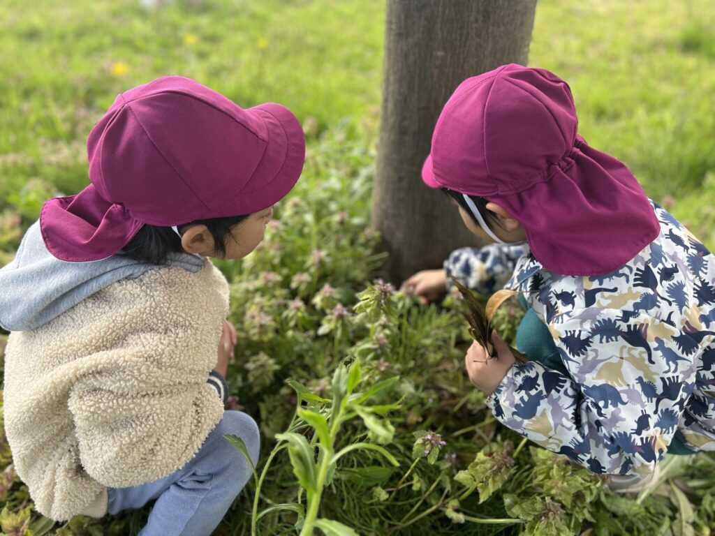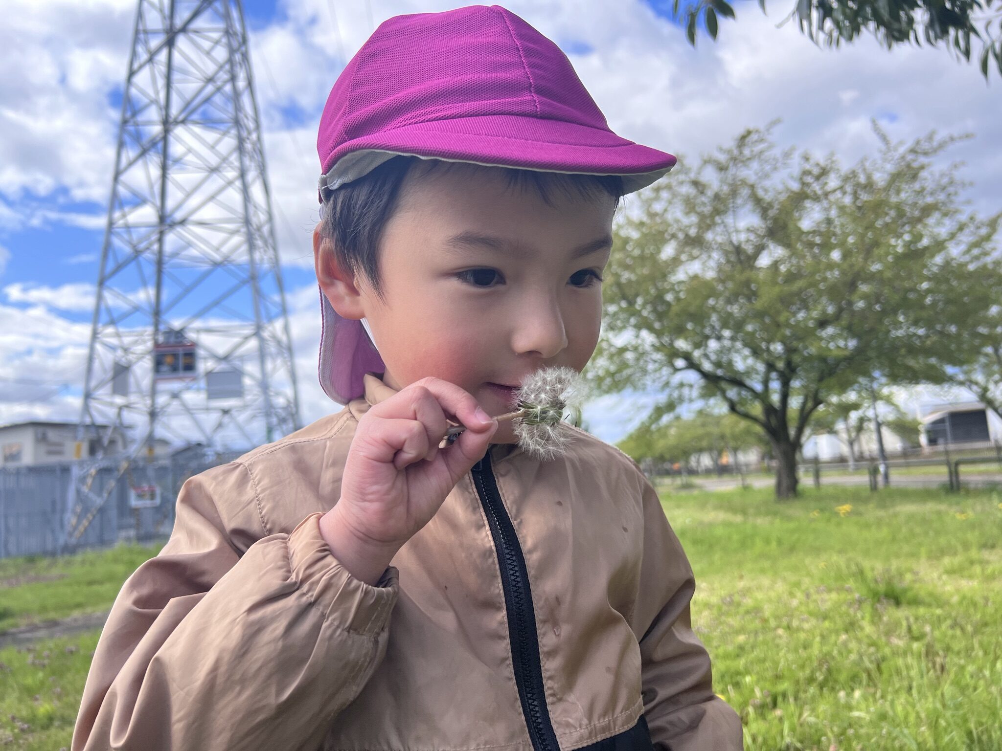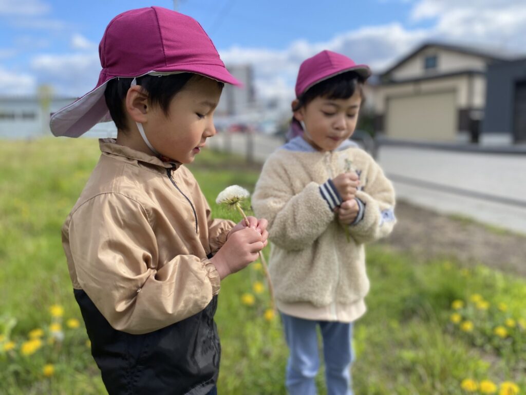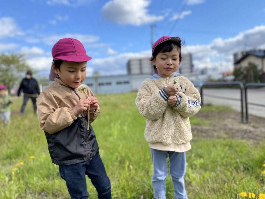 たんぽぽ、わたげ、葉っぱ、虫など広場にある自然物に夢中の子どもたち♡