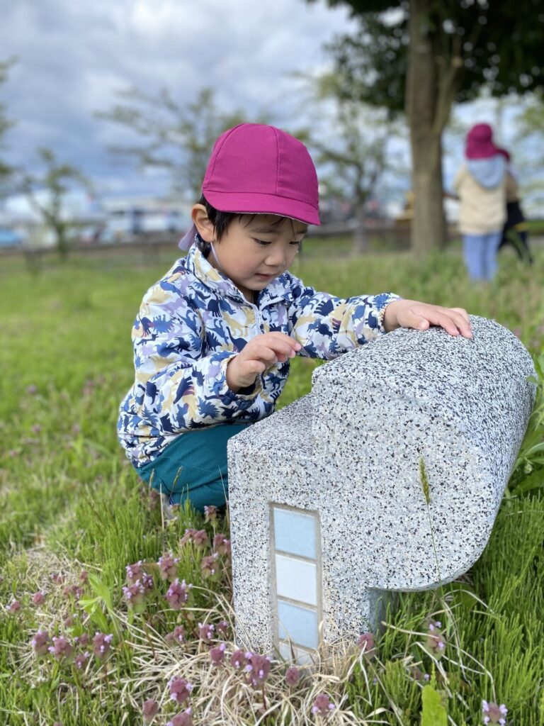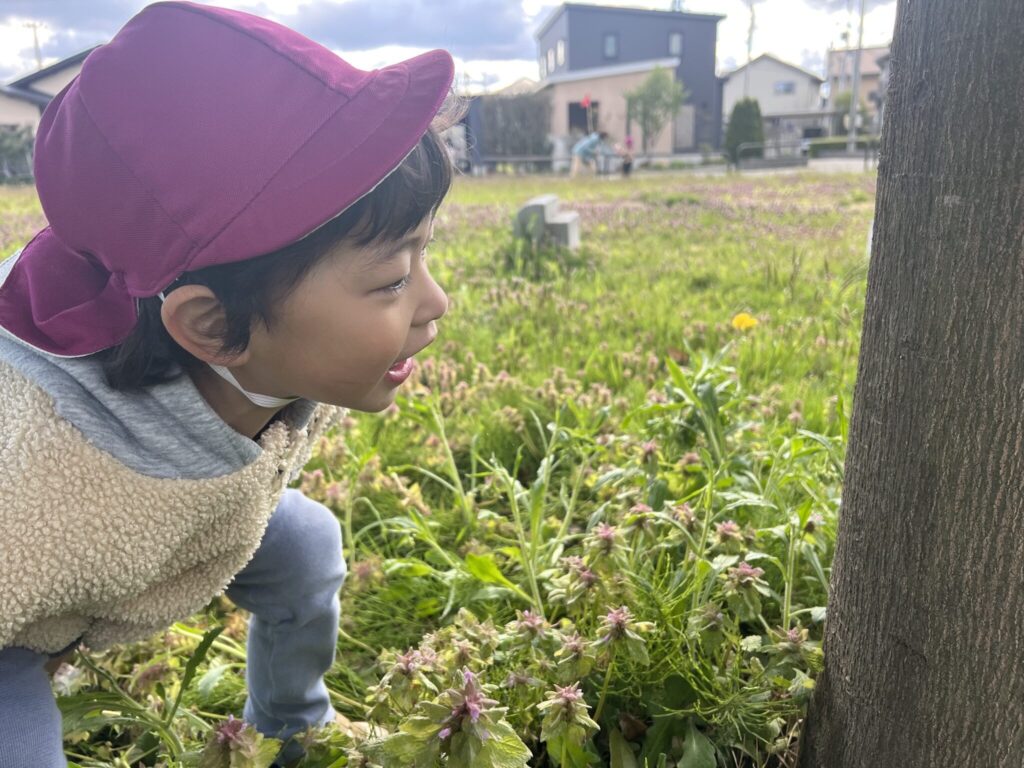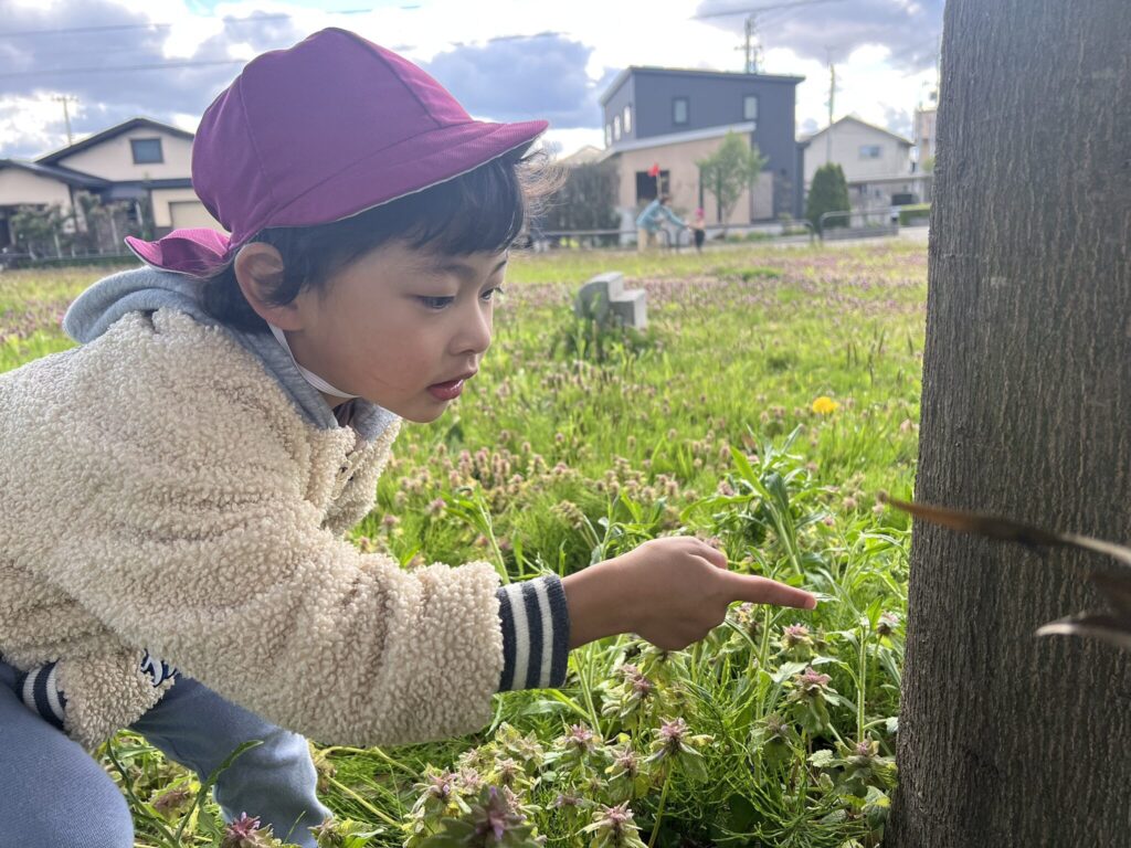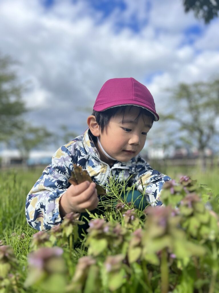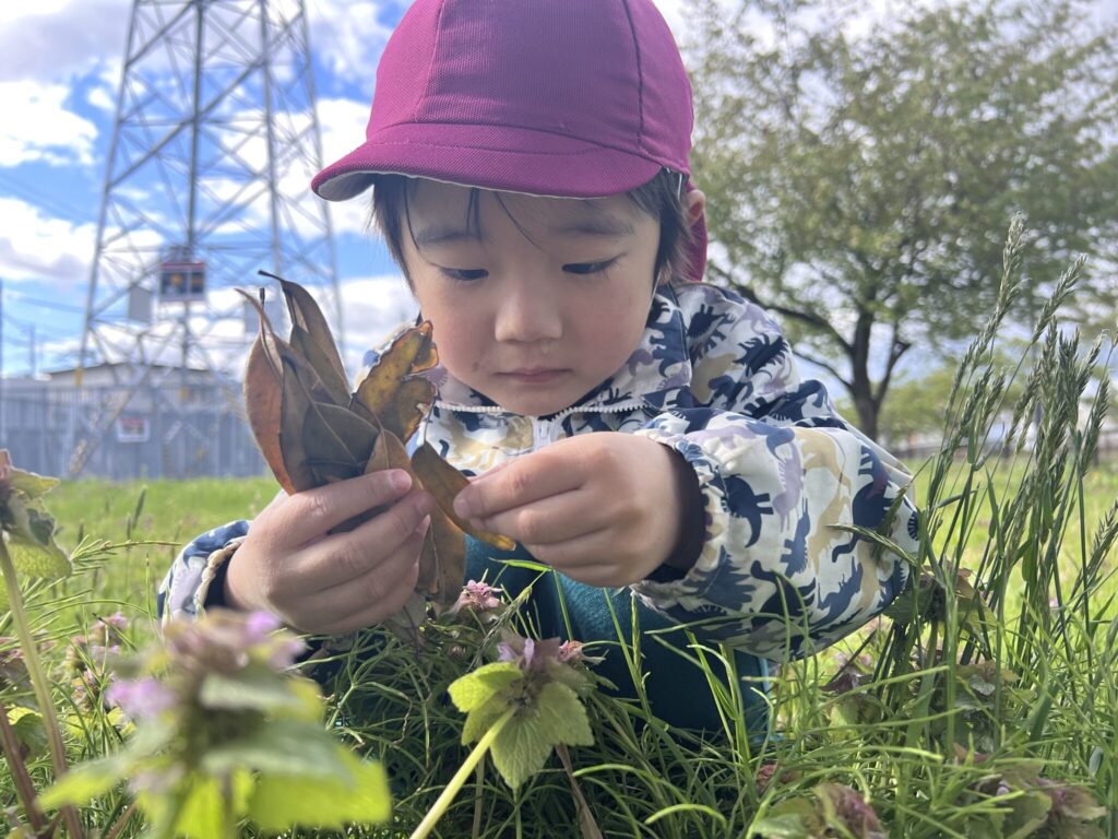 たんぽぽ、わたげ、葉っぱ、虫など広場にある自然物に夢中の子どもたち♡