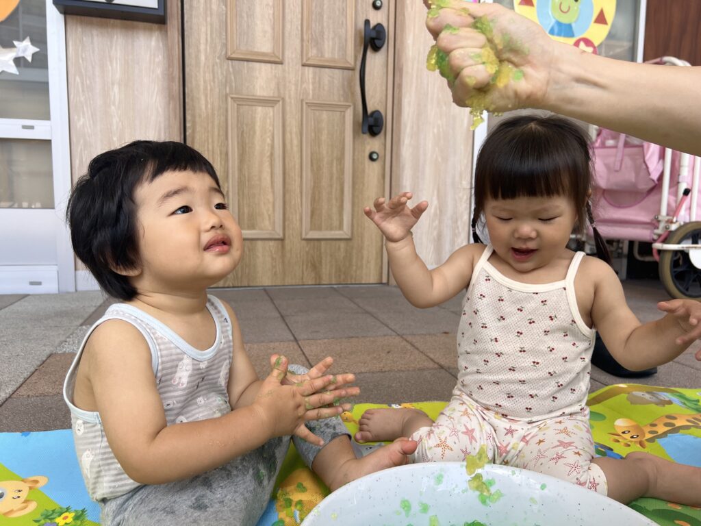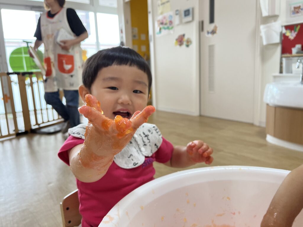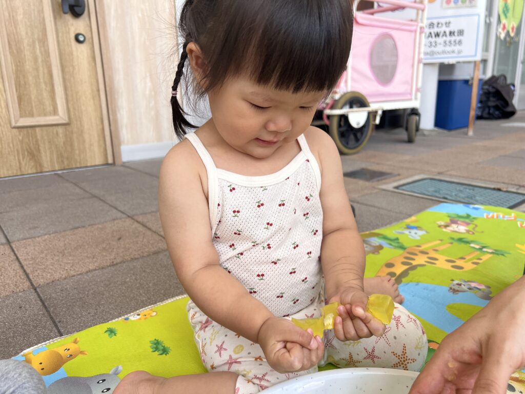 最初から楽しんで、腕の方まで寒天を伸ばす子も見られました?