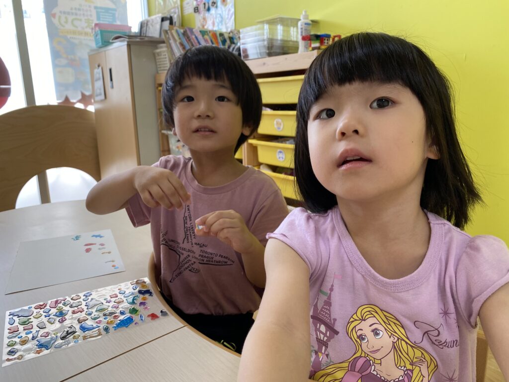 その後も集中してシールを貼ったり、お友達とお話したり、手を止め、お友達のお話をニコニコしながら聞いたりと時間いっぱい楽しんでいました♬