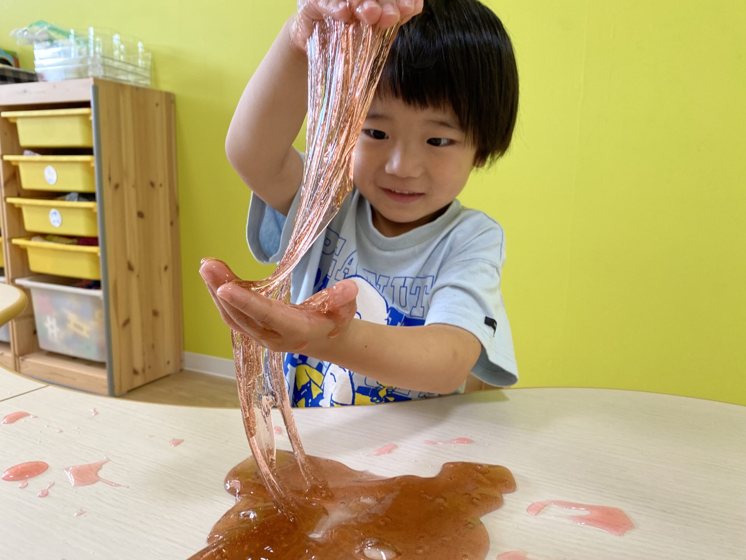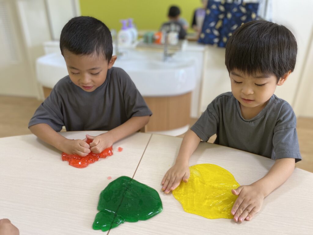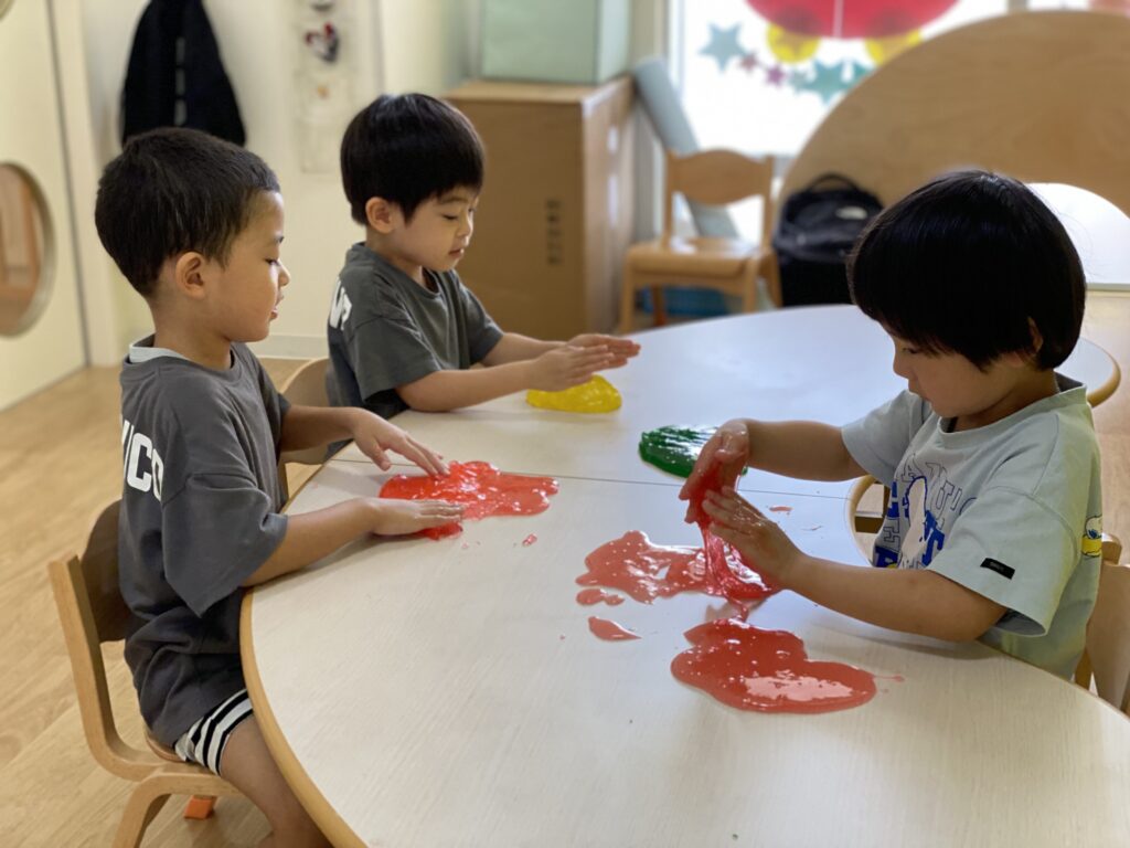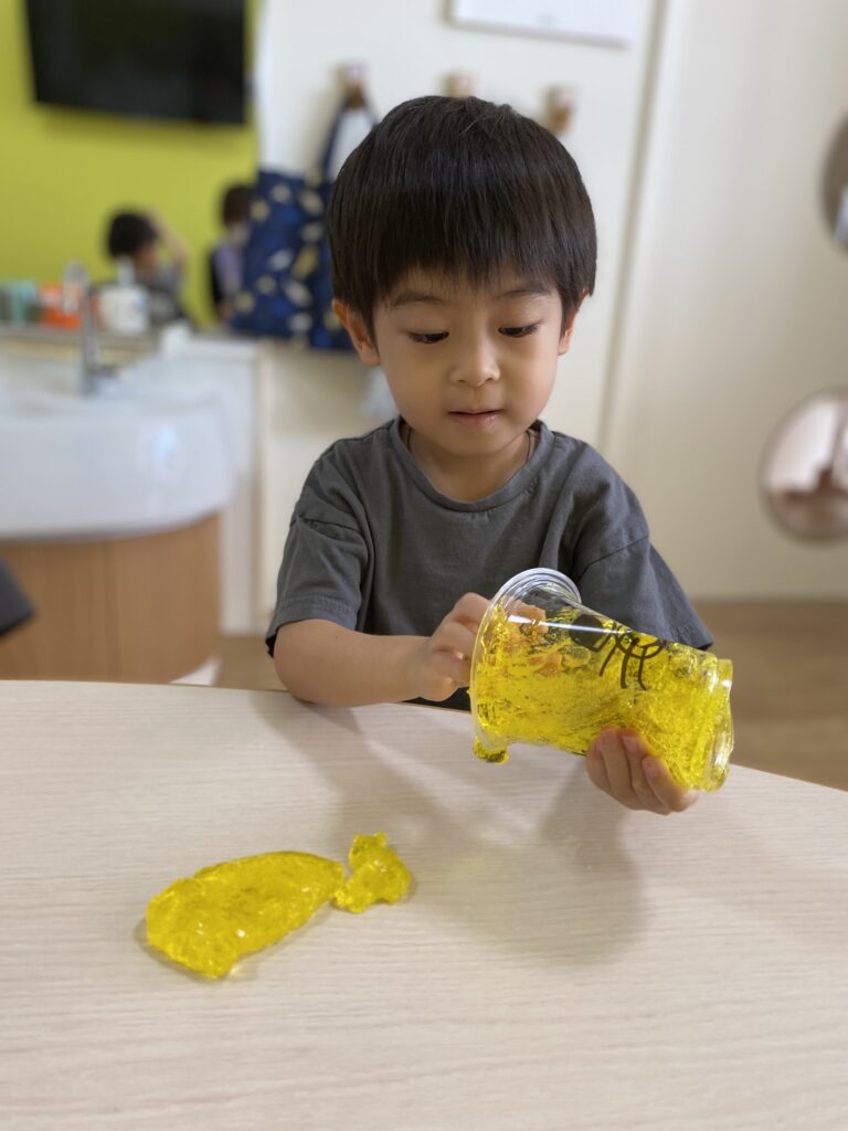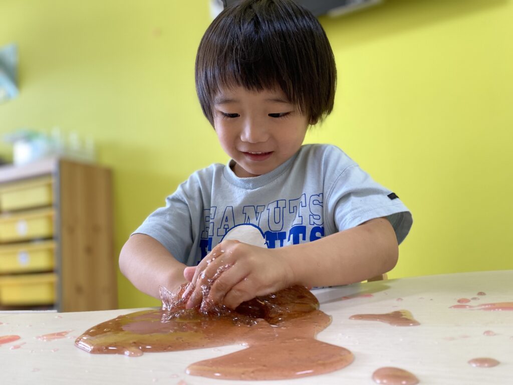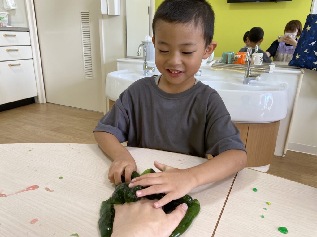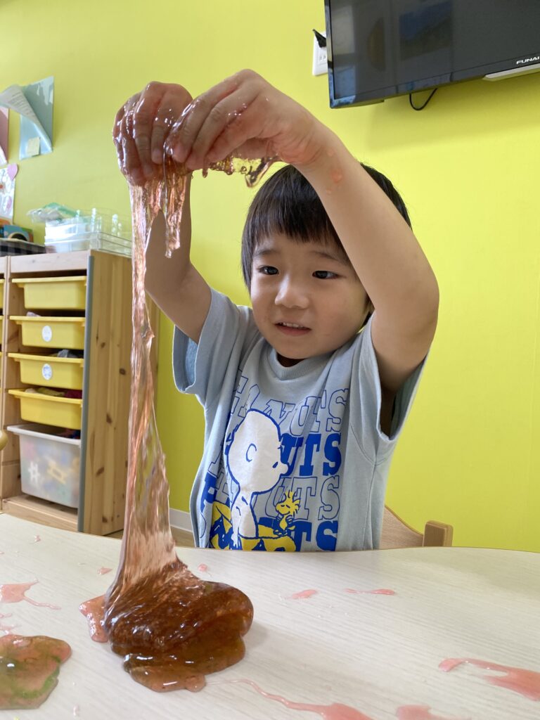 以前クラスでスライムの話をした時から『スライムで遊びた〜い✨』と毎回リクエストしていた3歳児のHくん??そして本日、Hくん念願のスライムで遊びました??