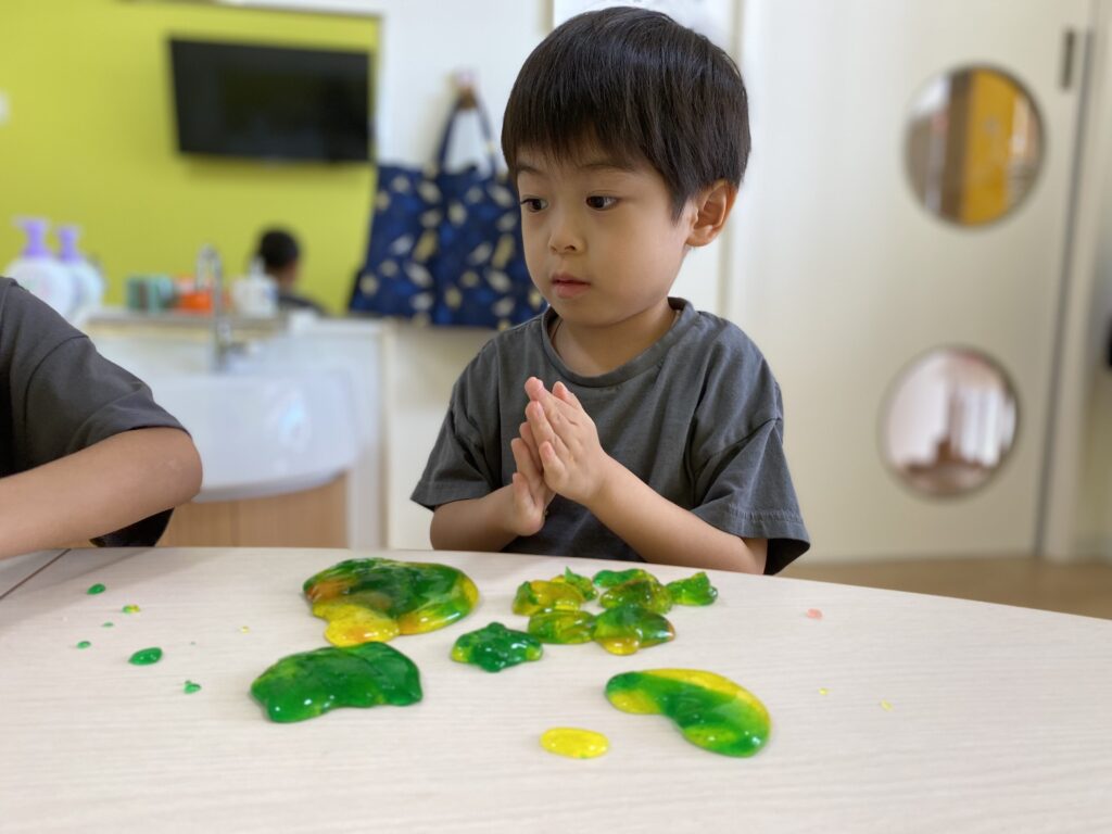 ここで保育士がお試し用に作った緑のスライムが見つかると