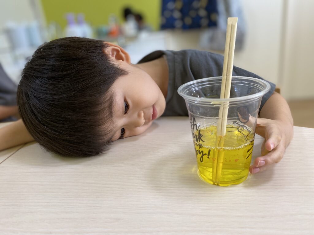 Hくんは色水をじ〜っと観察しています??