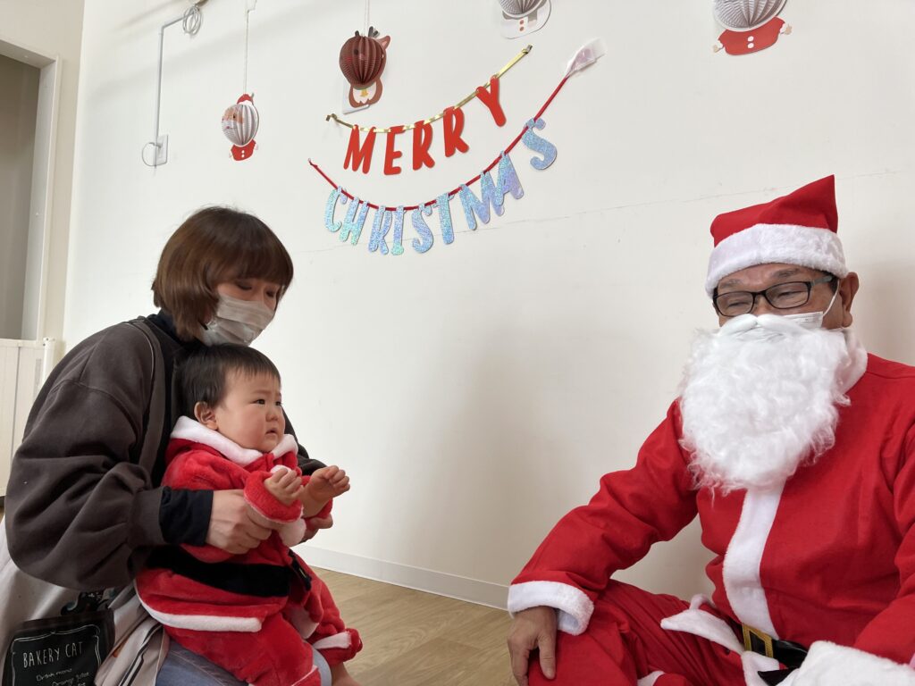 0歳児のお友だちは初めて見るサンタさんに少し驚いてしまったようです?
