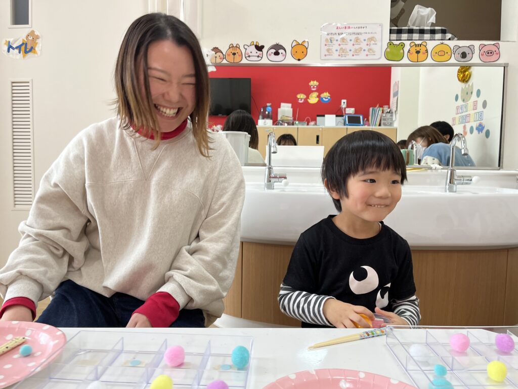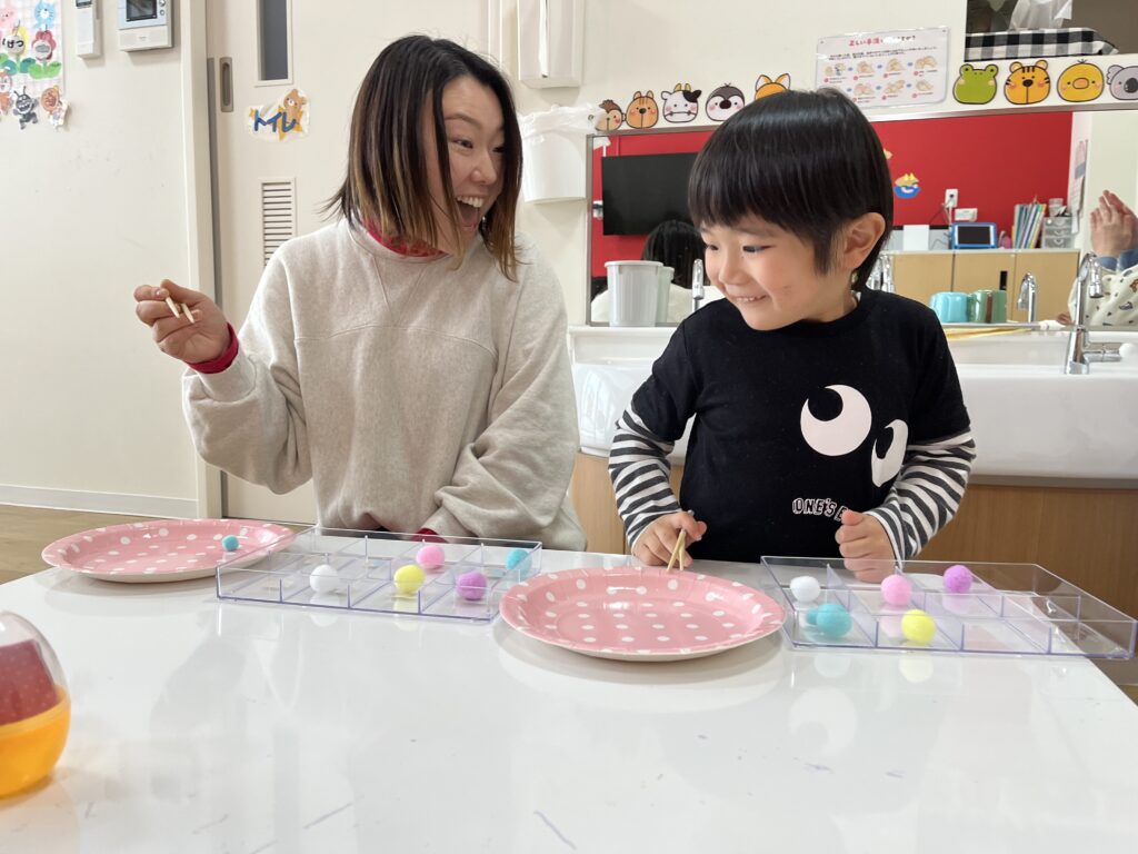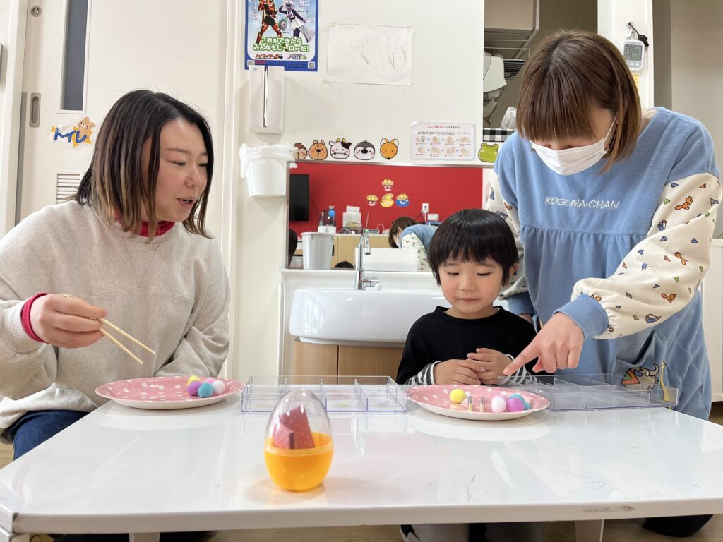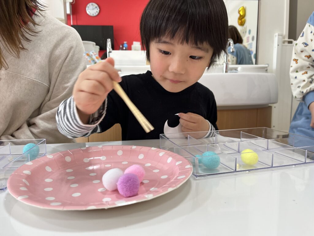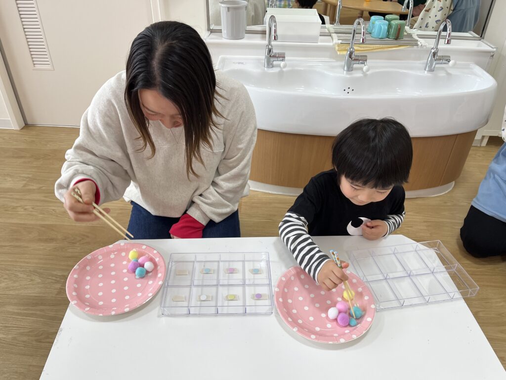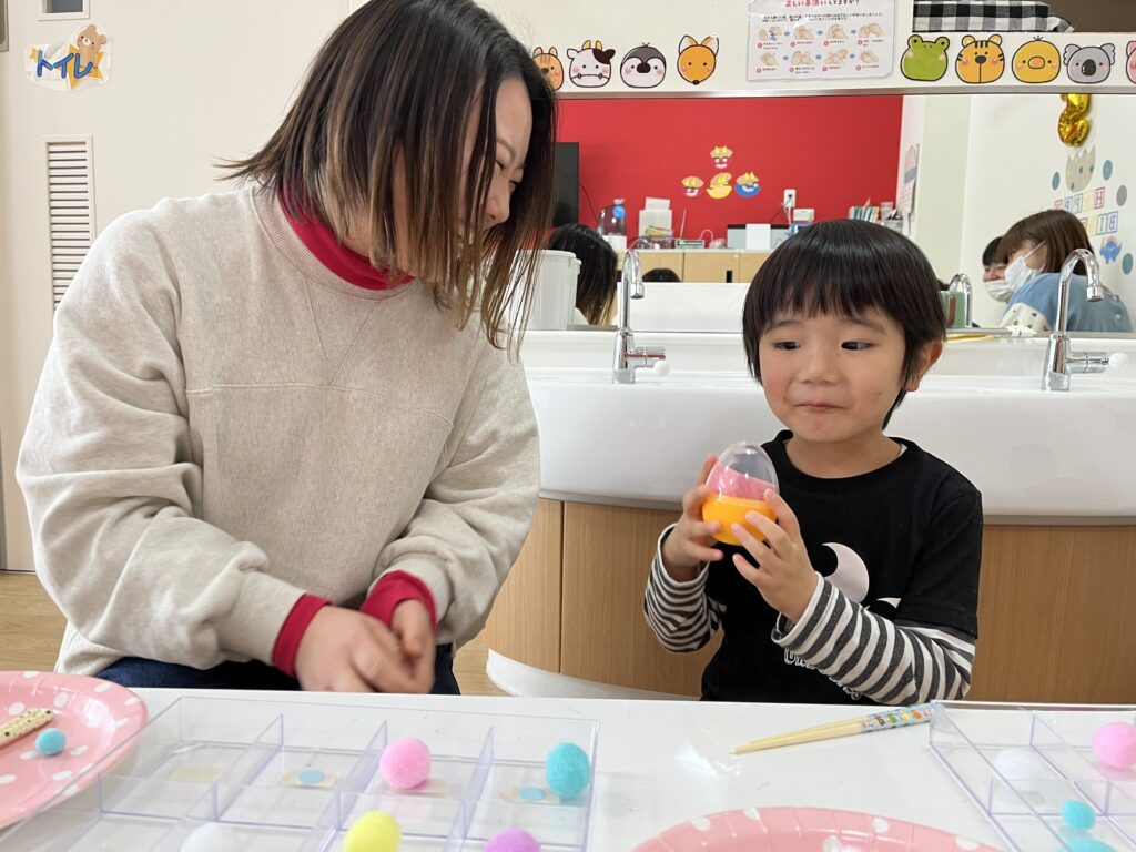 カラフルボールを箸を使ってケースに移動させます!美樹先生より先に移動できたら卵をGetできます?♬