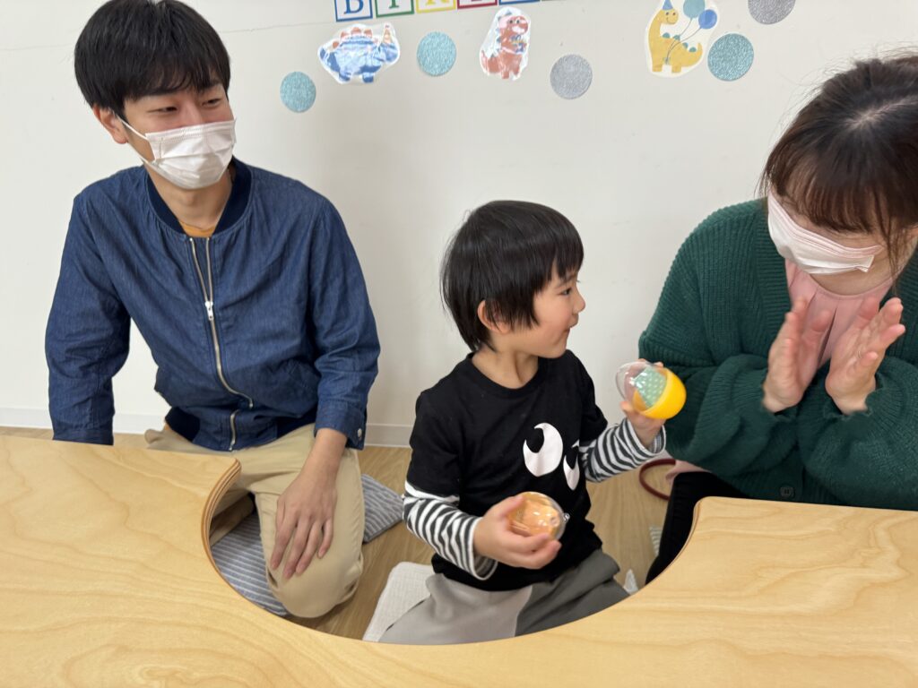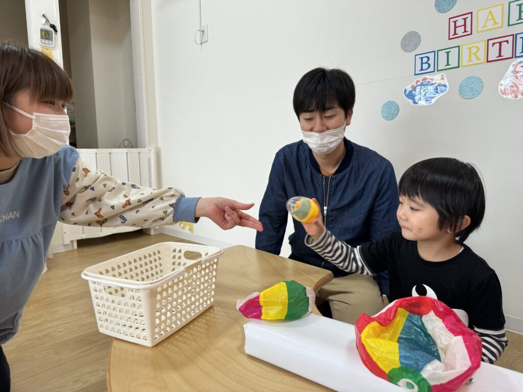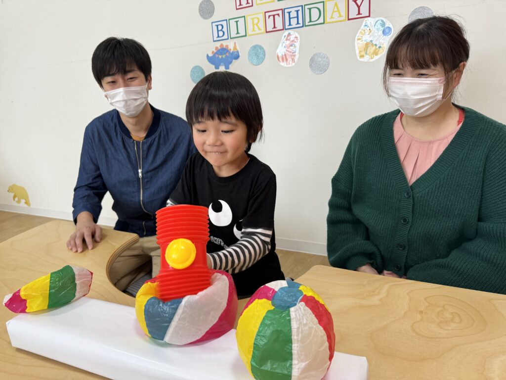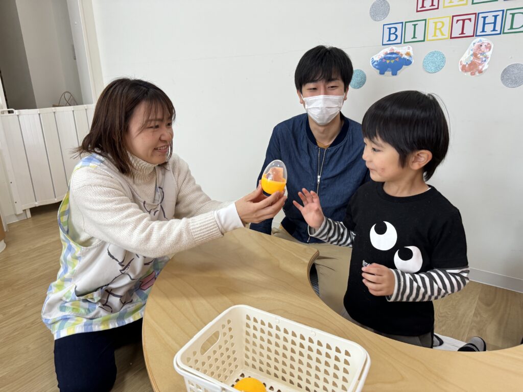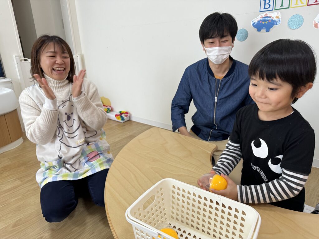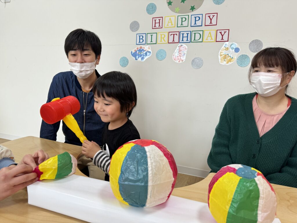 そして目の前にあるものに目がいきがち…という総合的に考え、真ん中に大きい紙風船を配置しましたが、思惑とは別に小さい紙風船、端っこを選んで、見事、一発で卵を当てたHくんでした?❤️笑