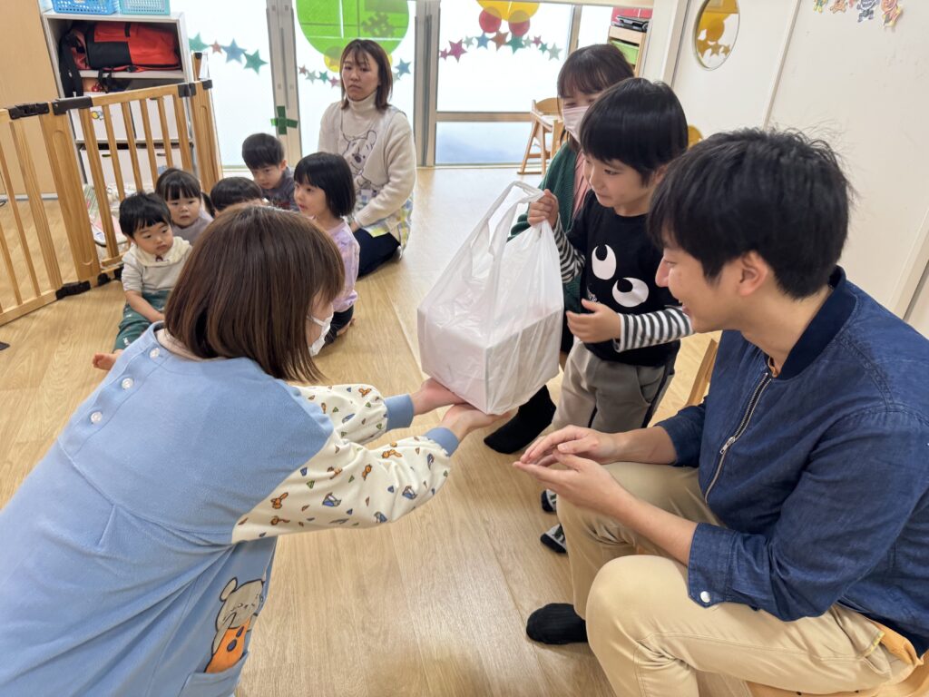 はらぺこおあむしが付いた袋を見て、早く開けたい様子のHくん、焦る気持ちが抑えられず、なかなか中身に辿りつけず…お父さんにお手伝いしてもらう場面も?☆