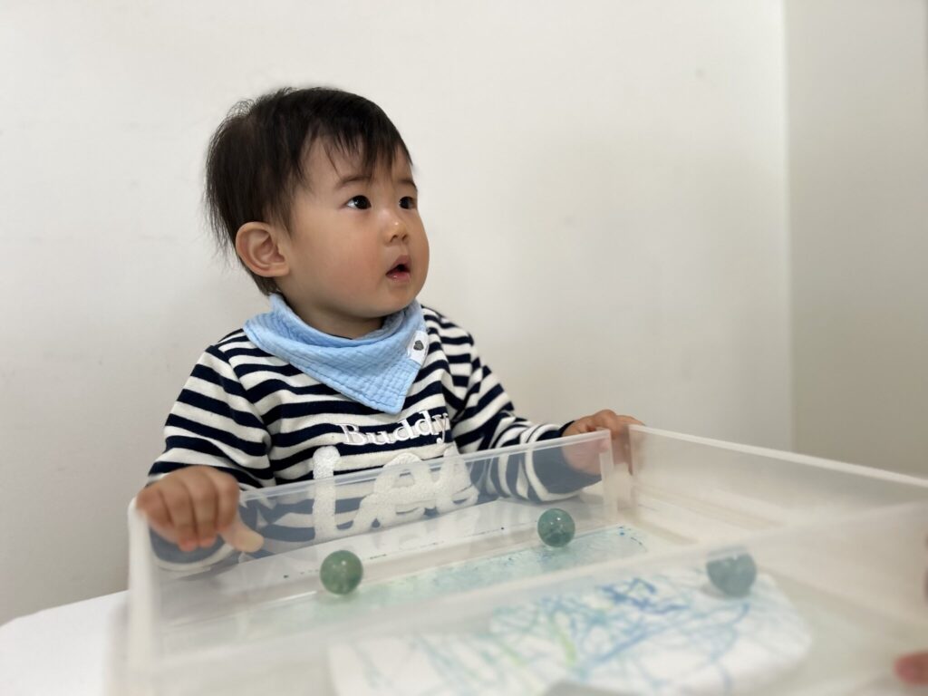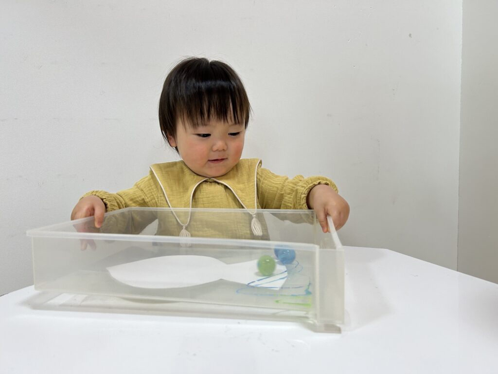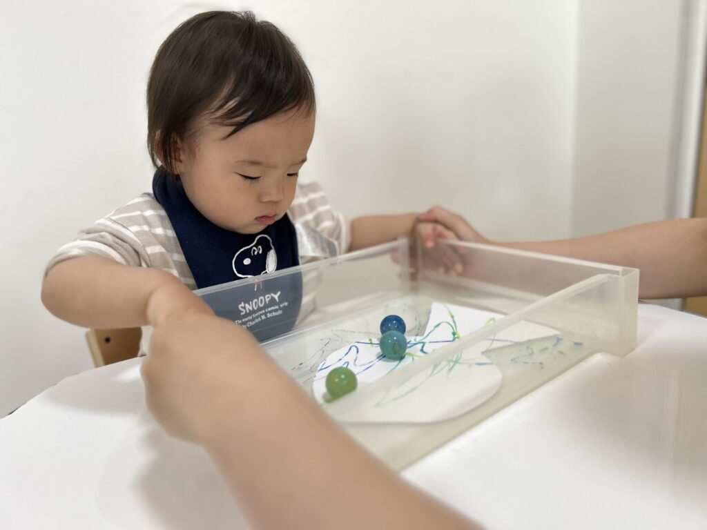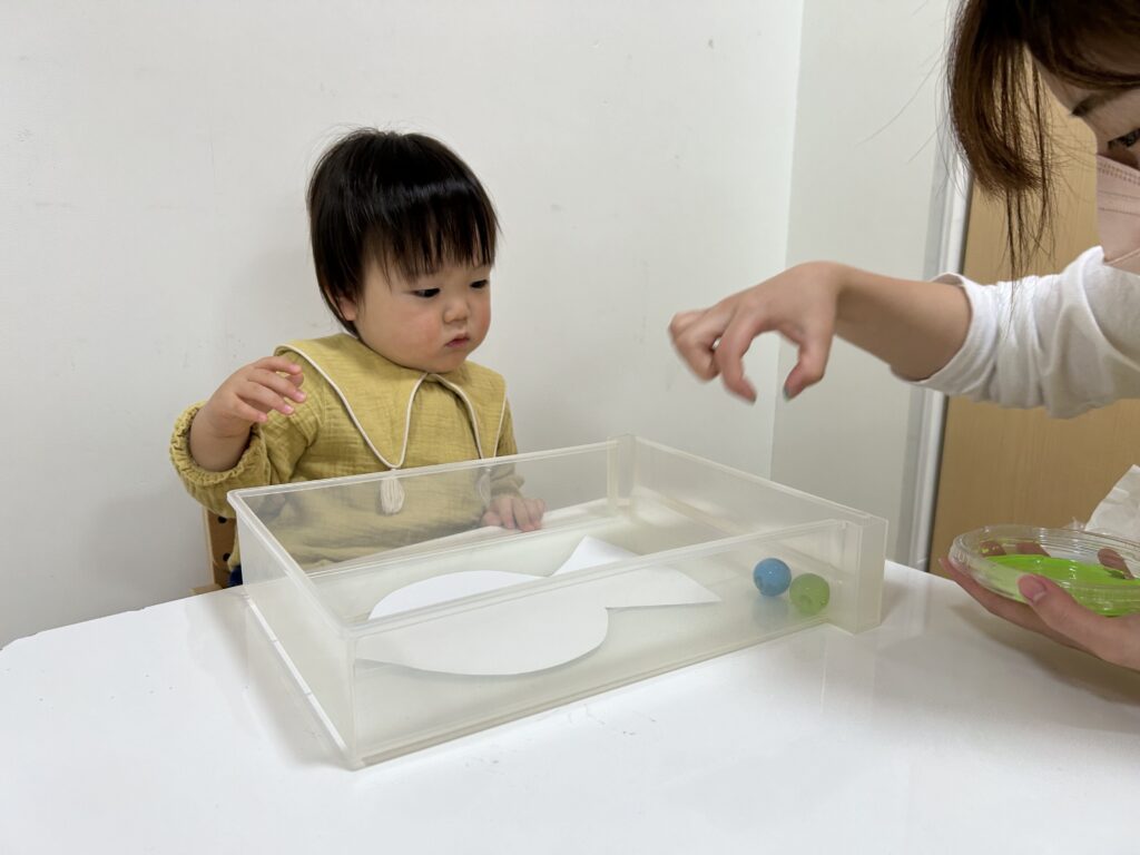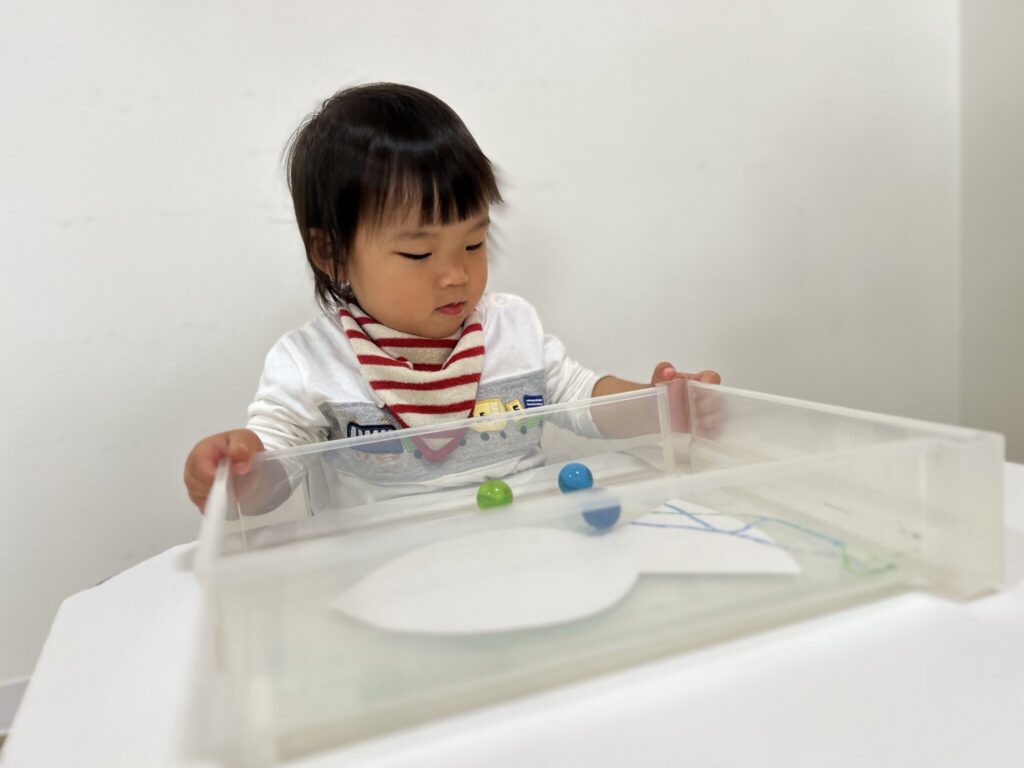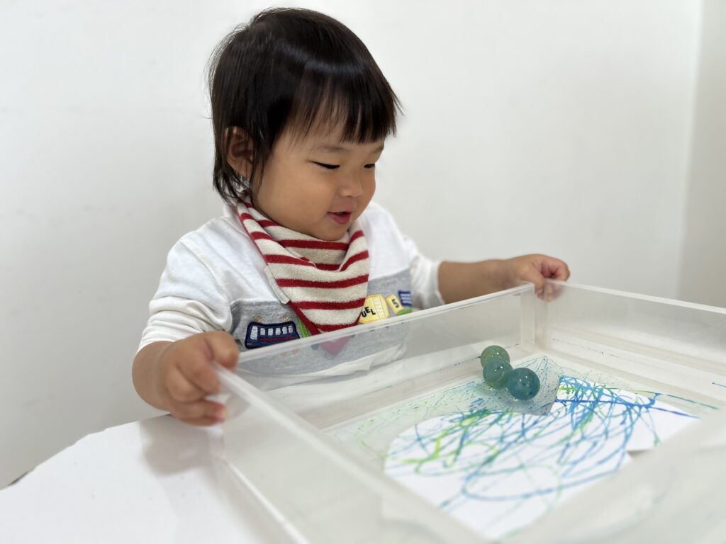 画用紙、ビー玉、トレー、3色の絵の具を用意して