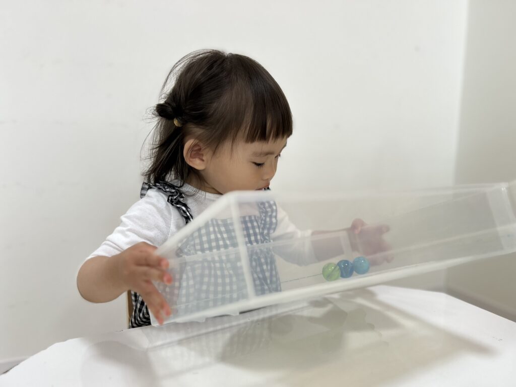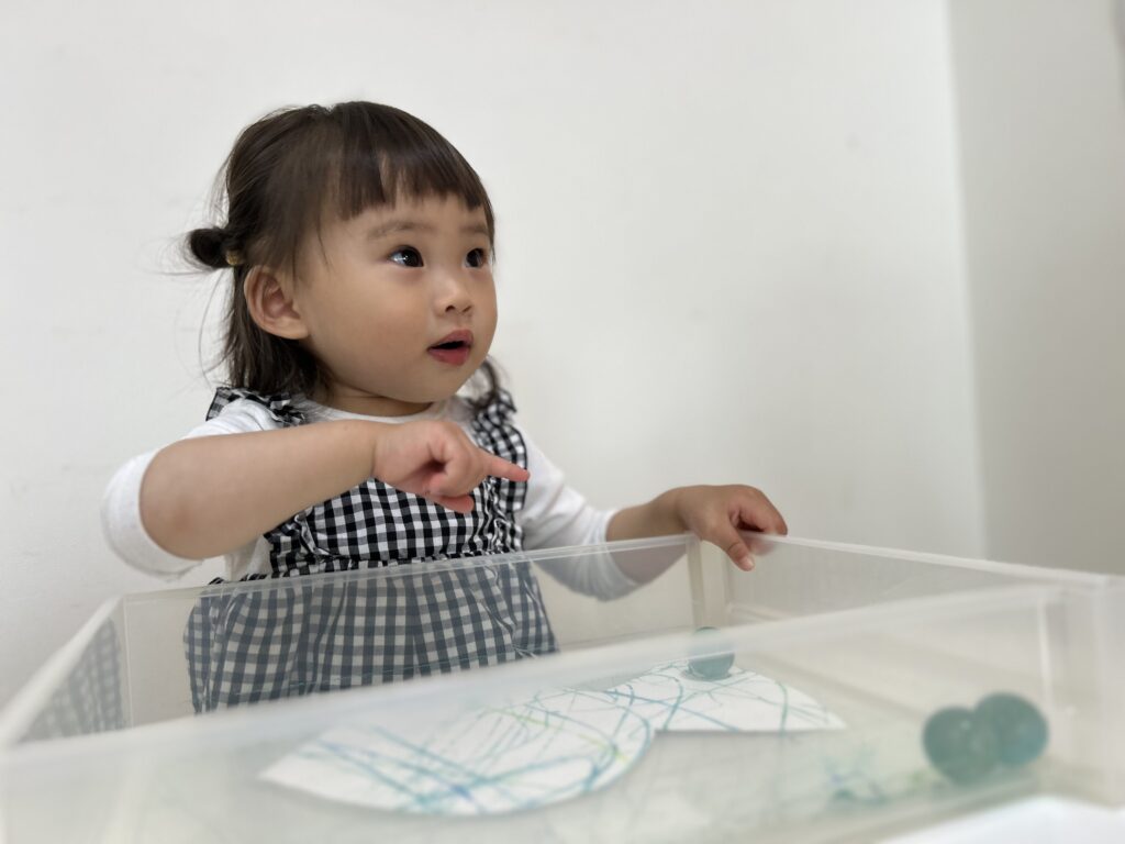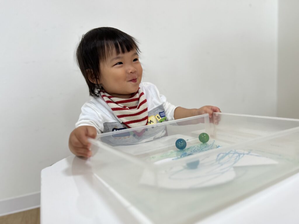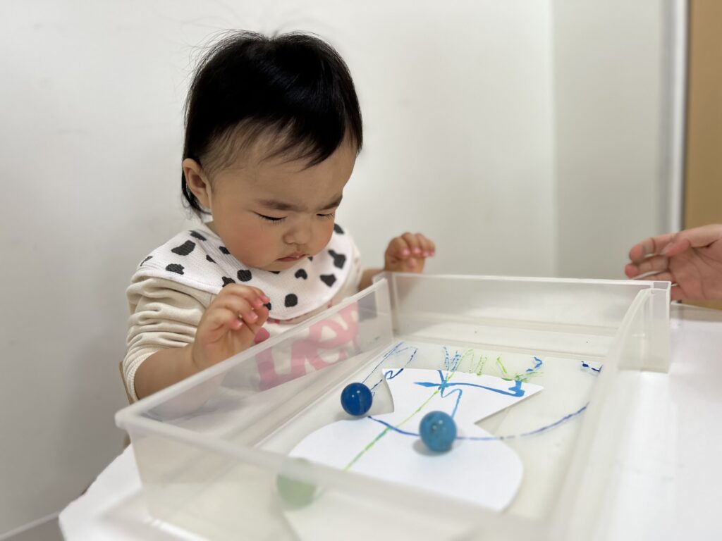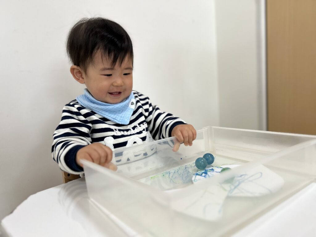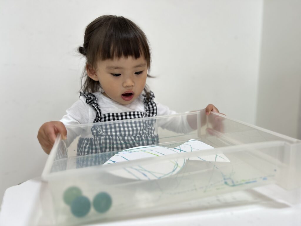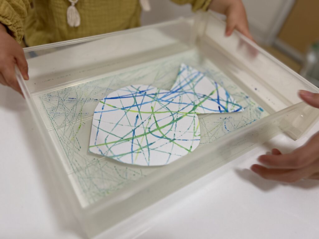 画用紙、ビー玉、トレー、3色の絵の具を用意して
