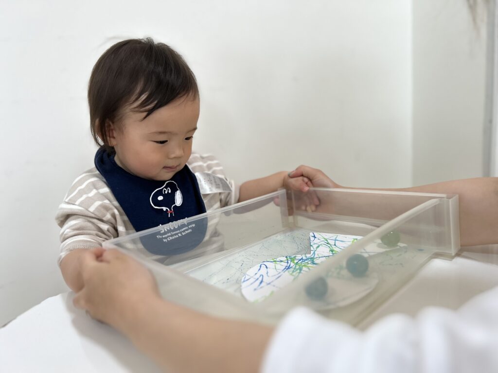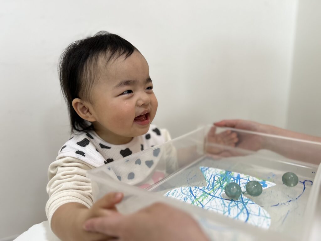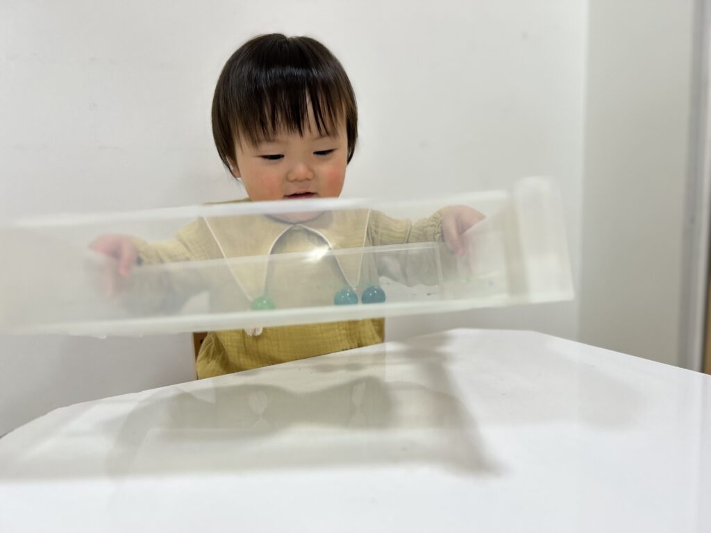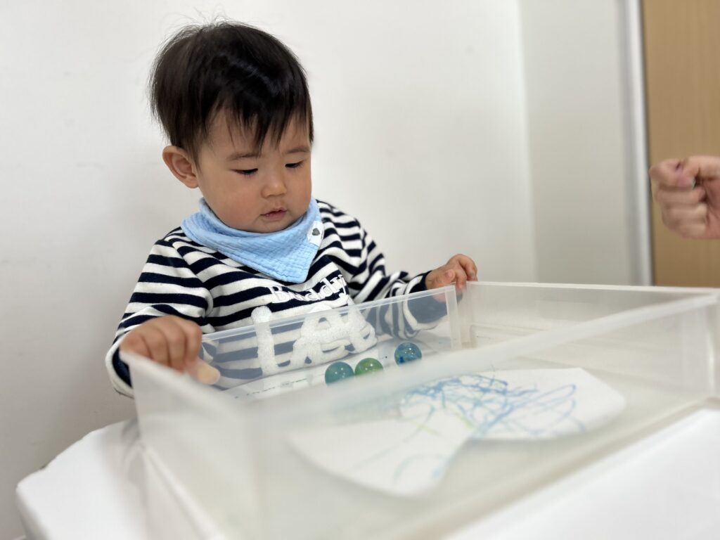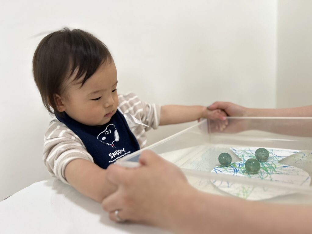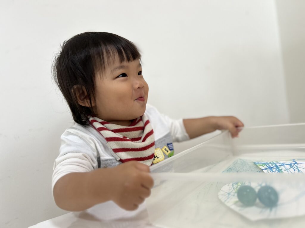 画用紙、ビー玉、トレー、3色の絵の具を用意して