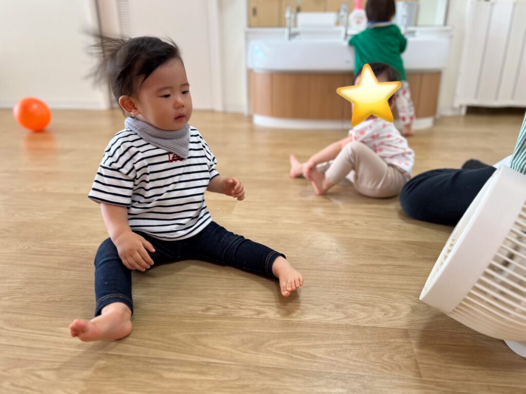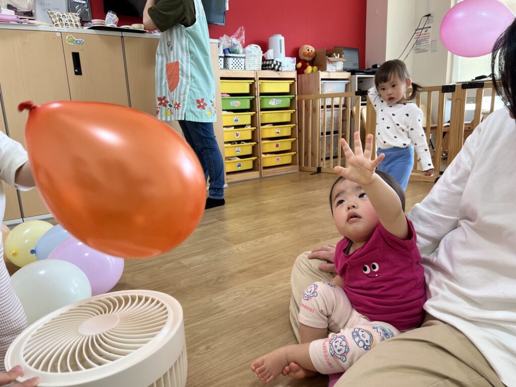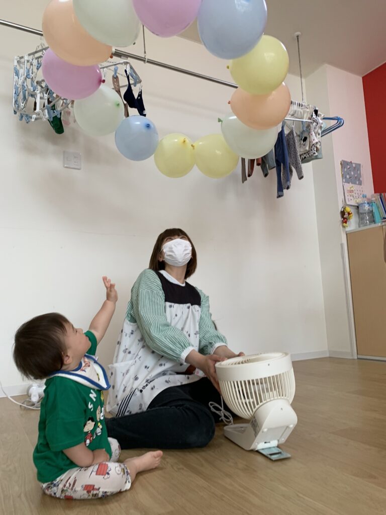 くっついていない風船をサーキュレーターの上の置いて、風船が上に向かって飛んでいくことを楽しんでいるお友達もいました😊🎈