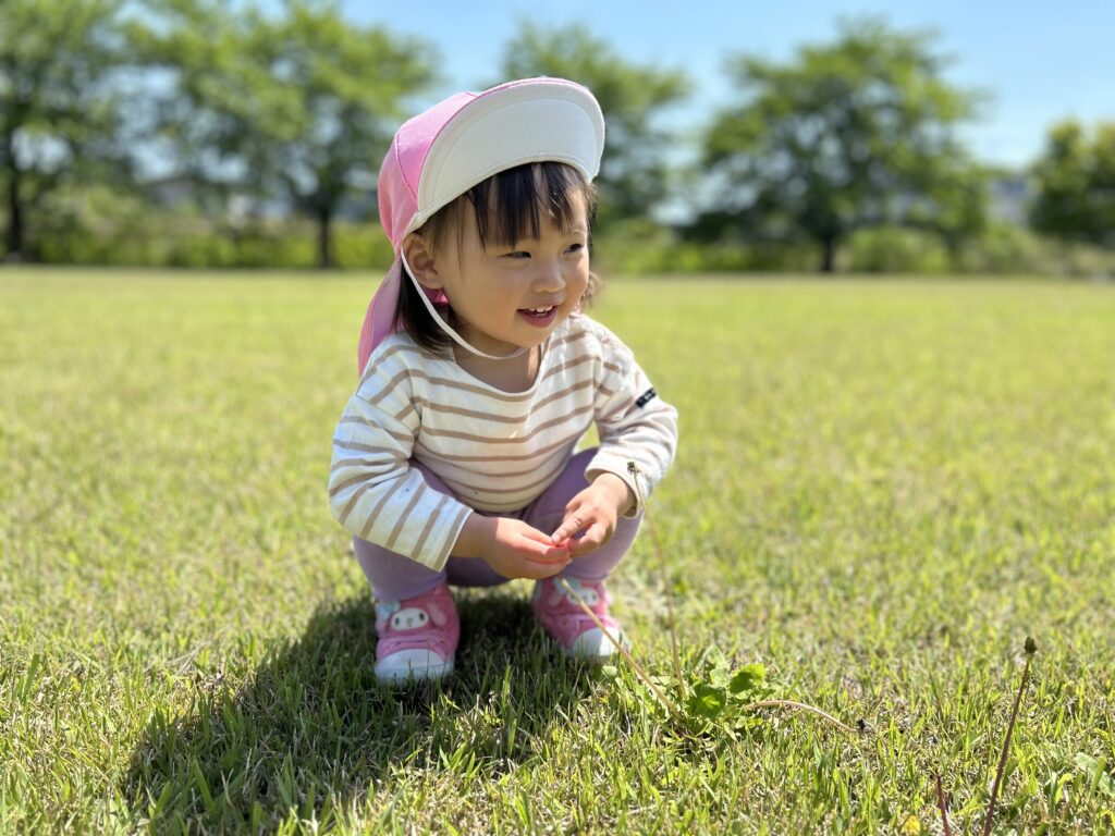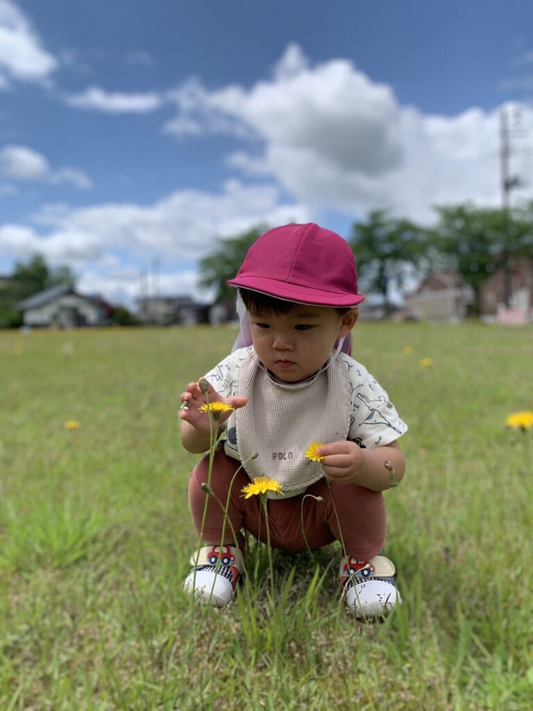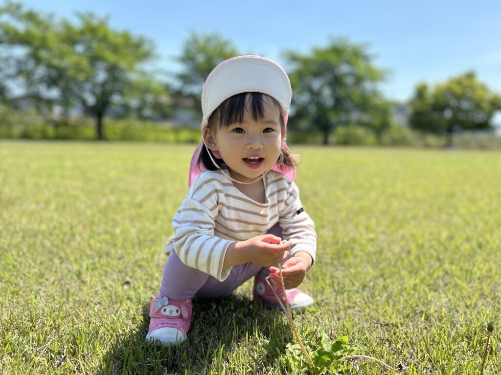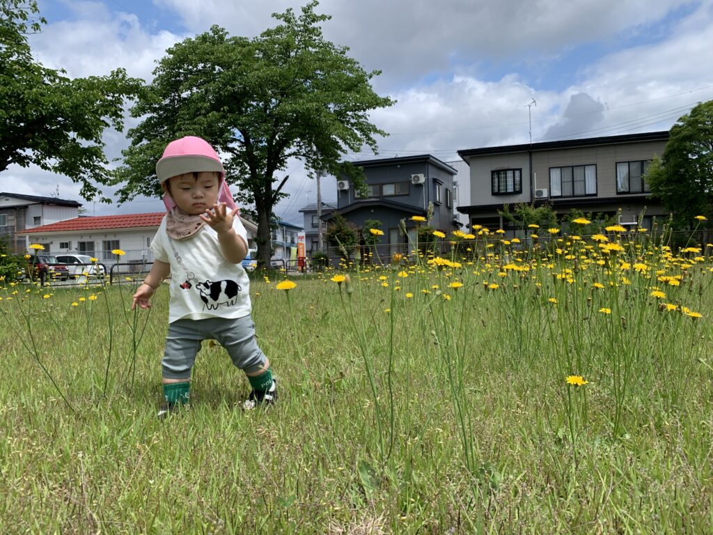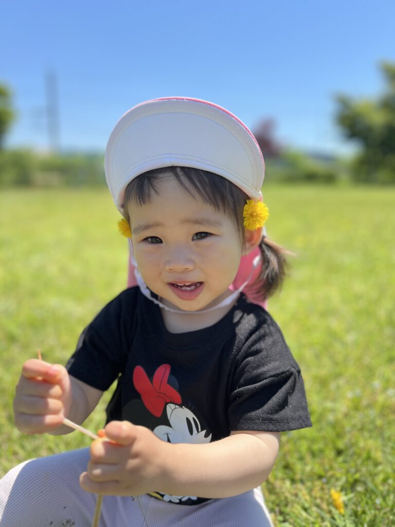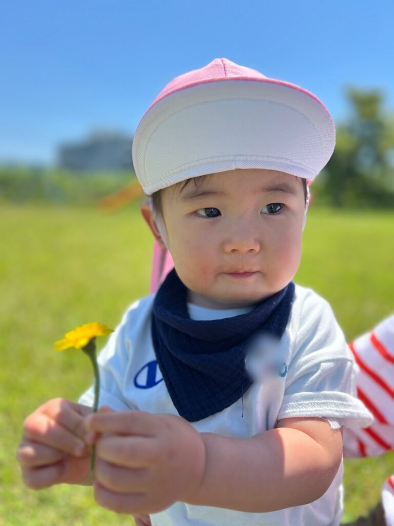 Iちゃんは公園内に咲いているたんぽぽを摘んで、保育士にプレゼント🎁♡