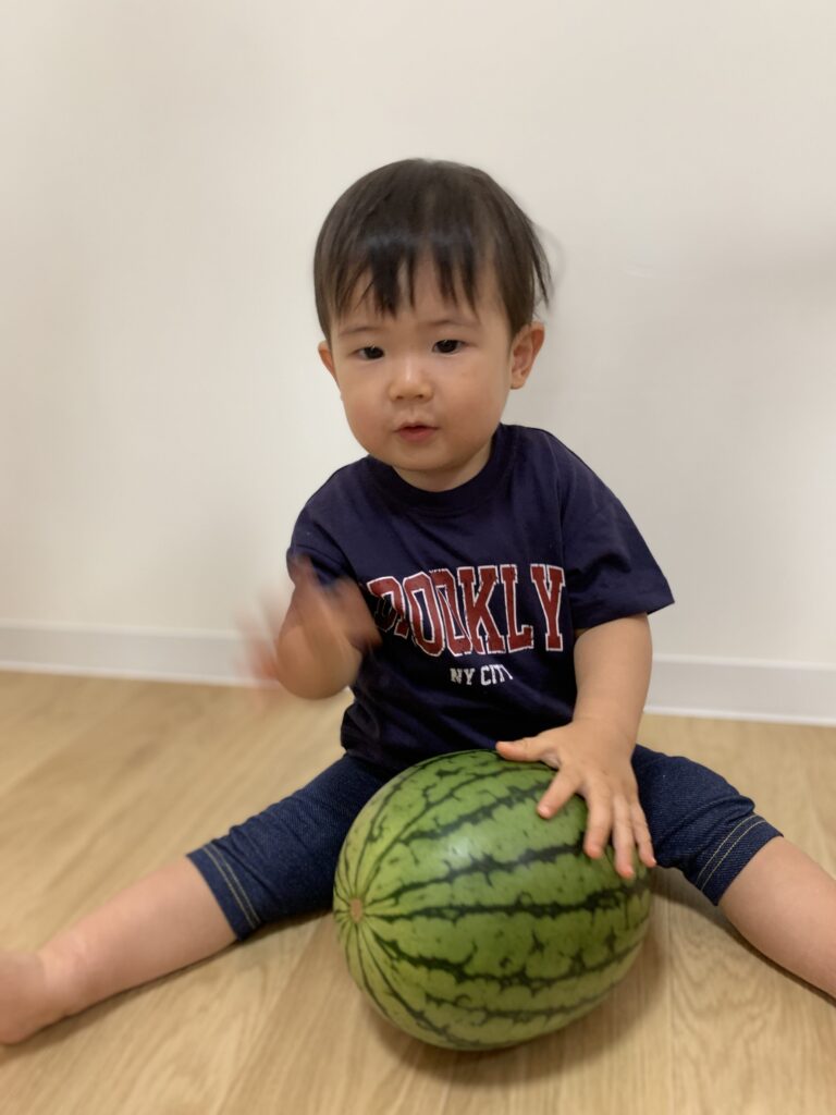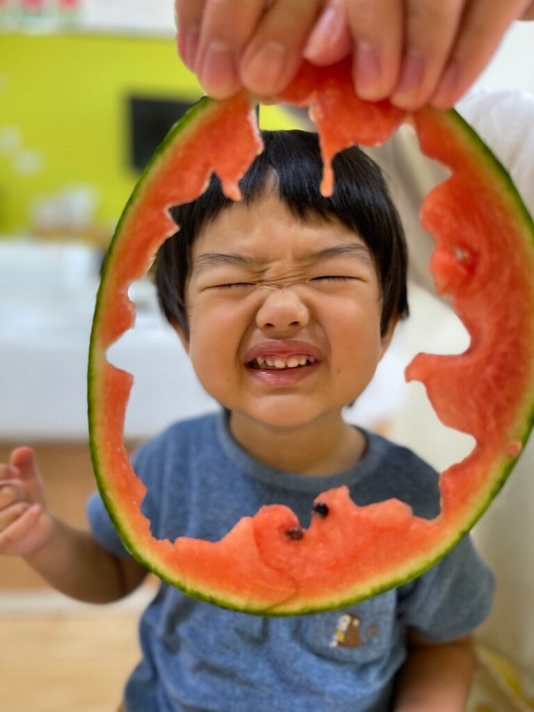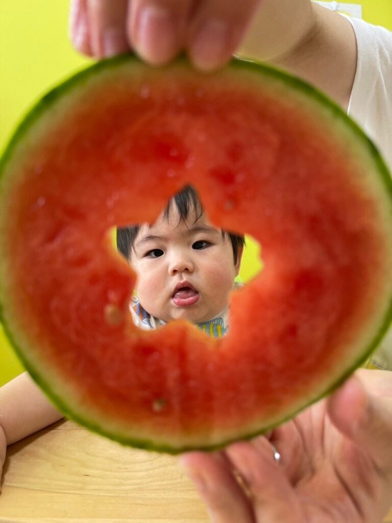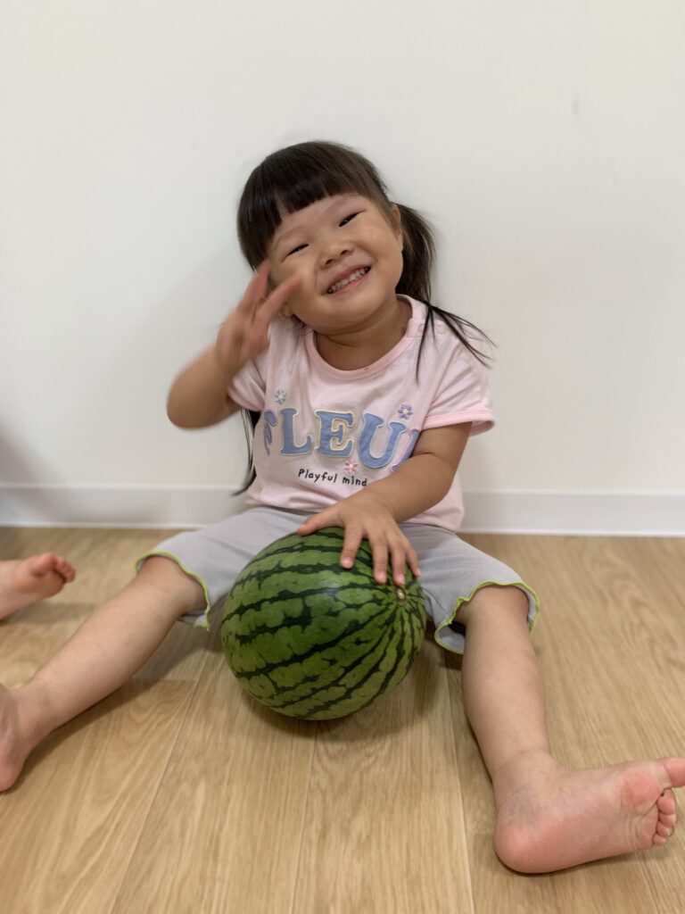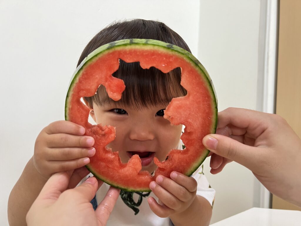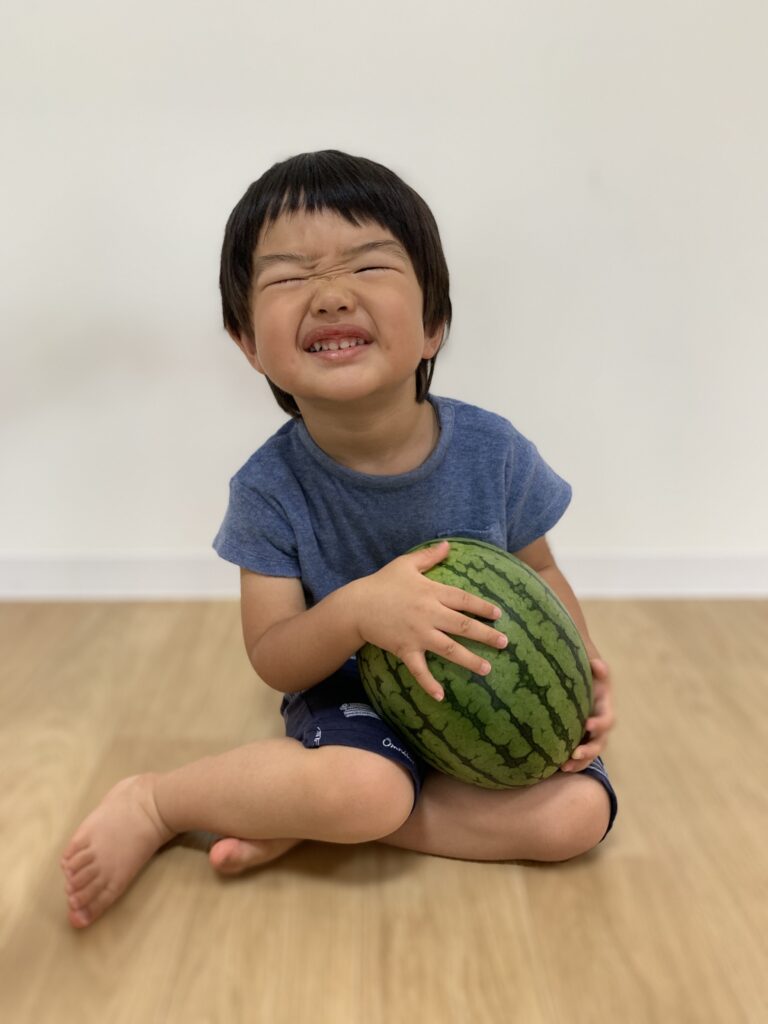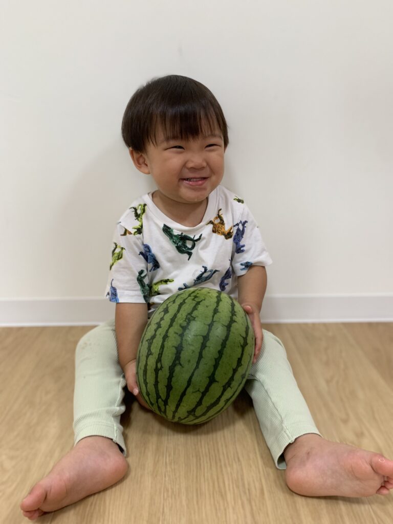 スイカを見せると「え!スイカだ!すごーい!」「触りたーい!」と興味津々だった子ども達⭐︎