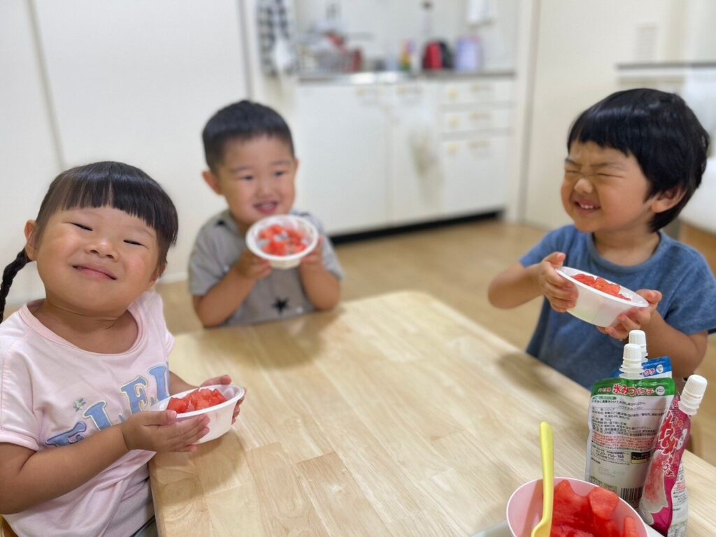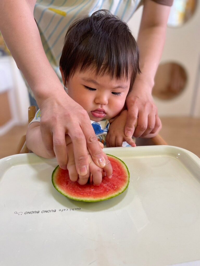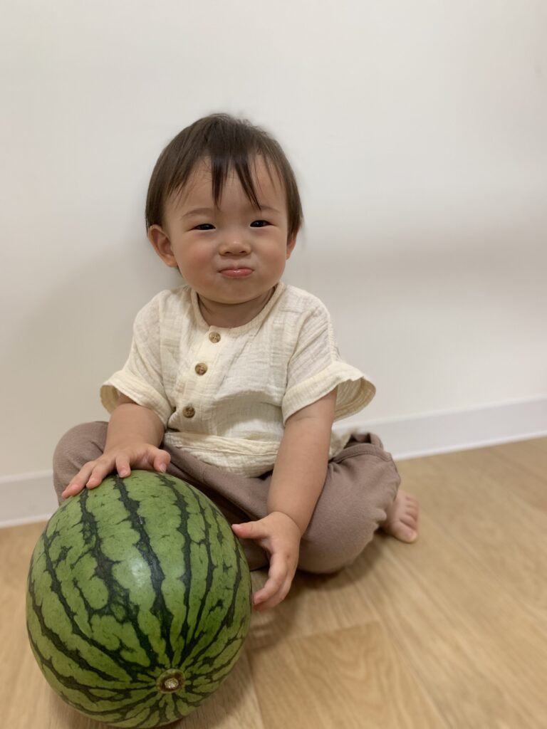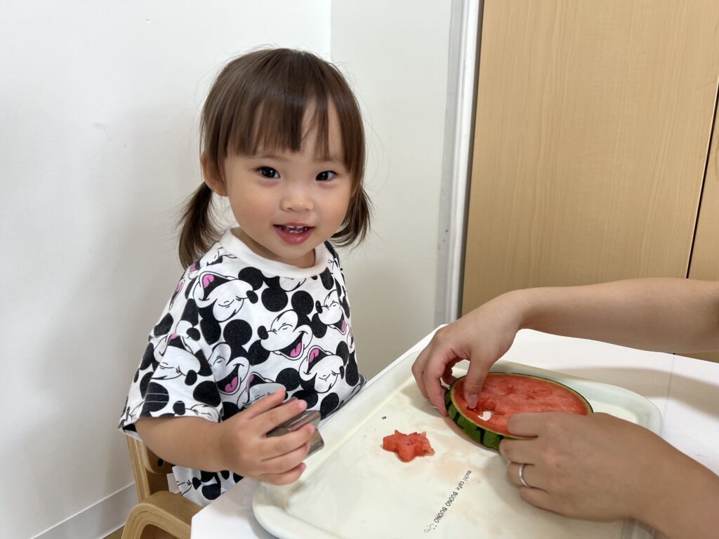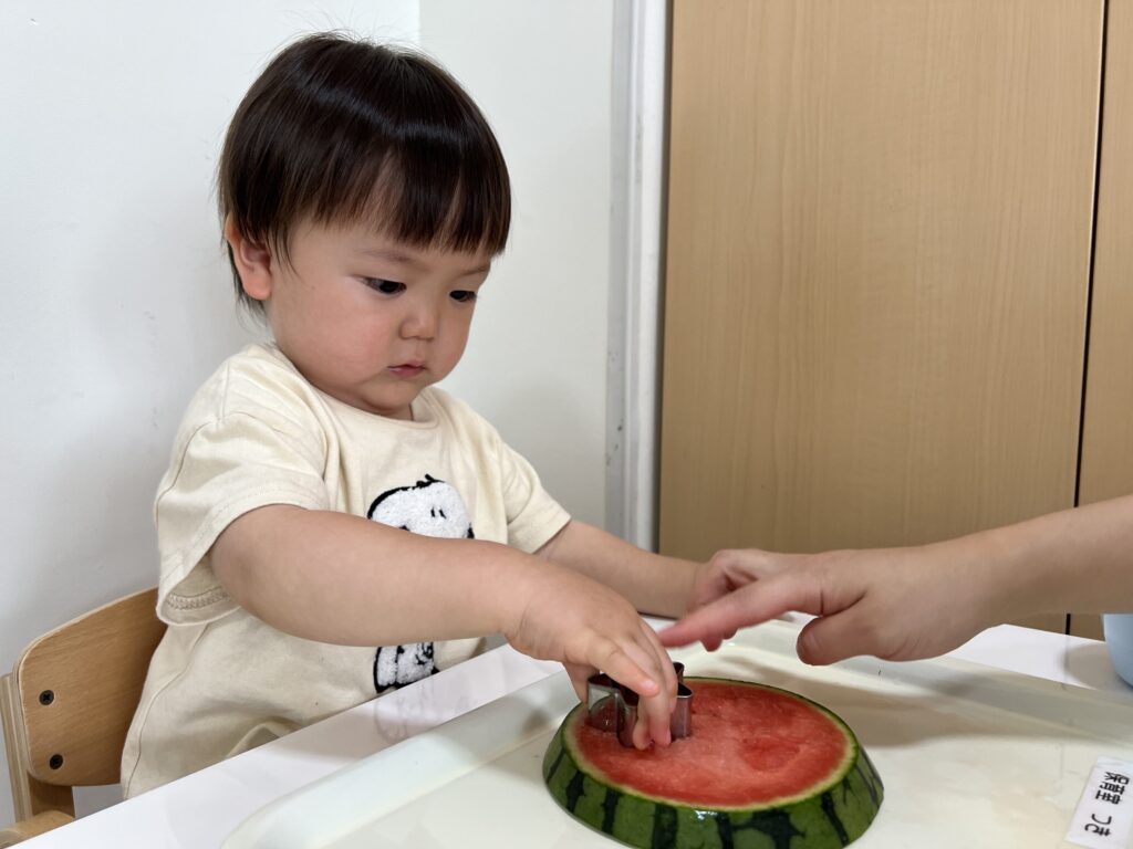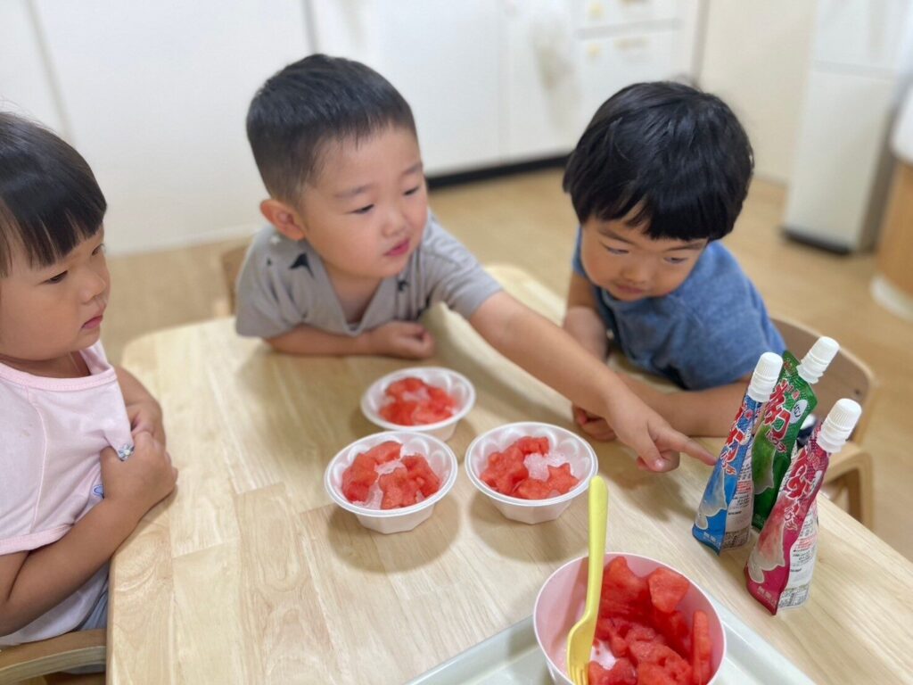 スイカを見せると「え!スイカだ!すごーい!」「触りたーい!」と興味津々だった子ども達⭐︎
