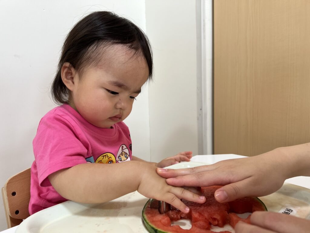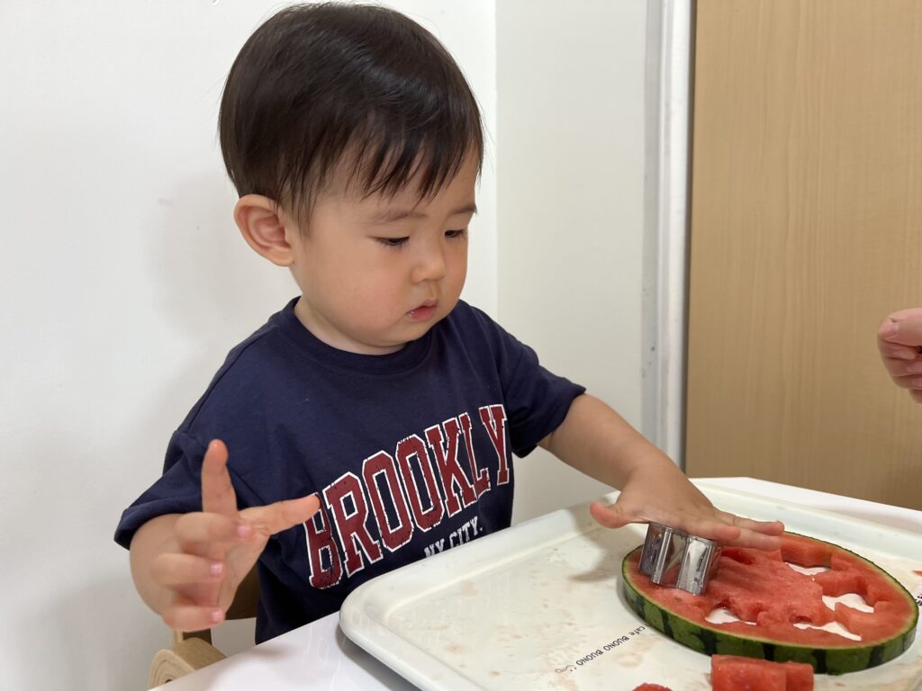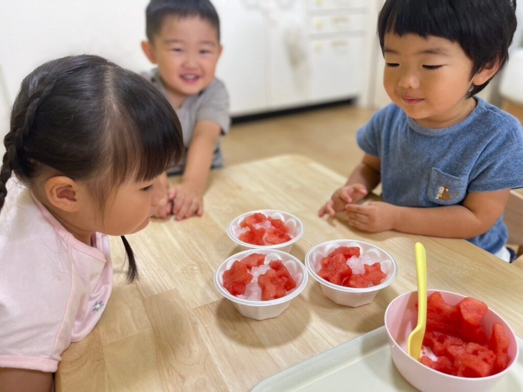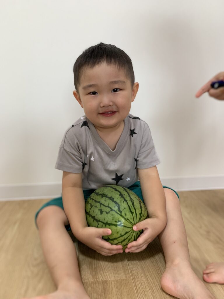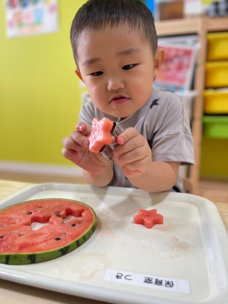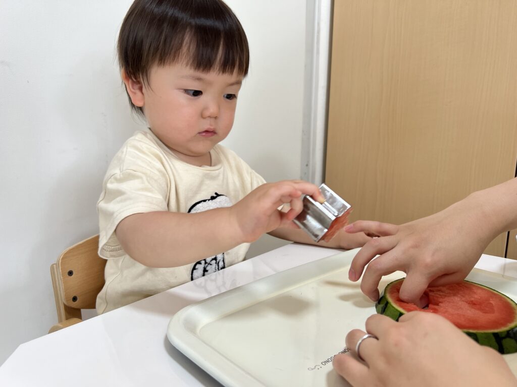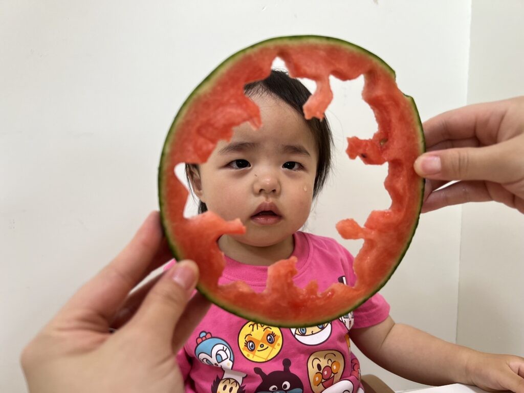 スイカを見せると「え!スイカだ!すごーい!」「触りたーい!」と興味津々だった子ども達⭐︎