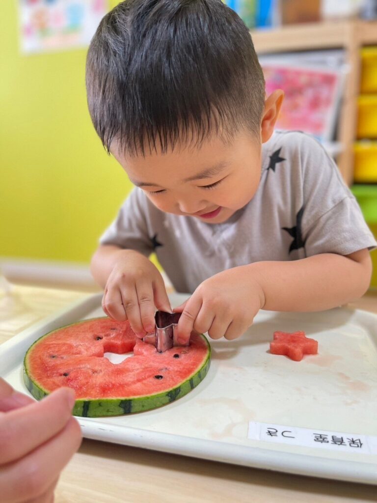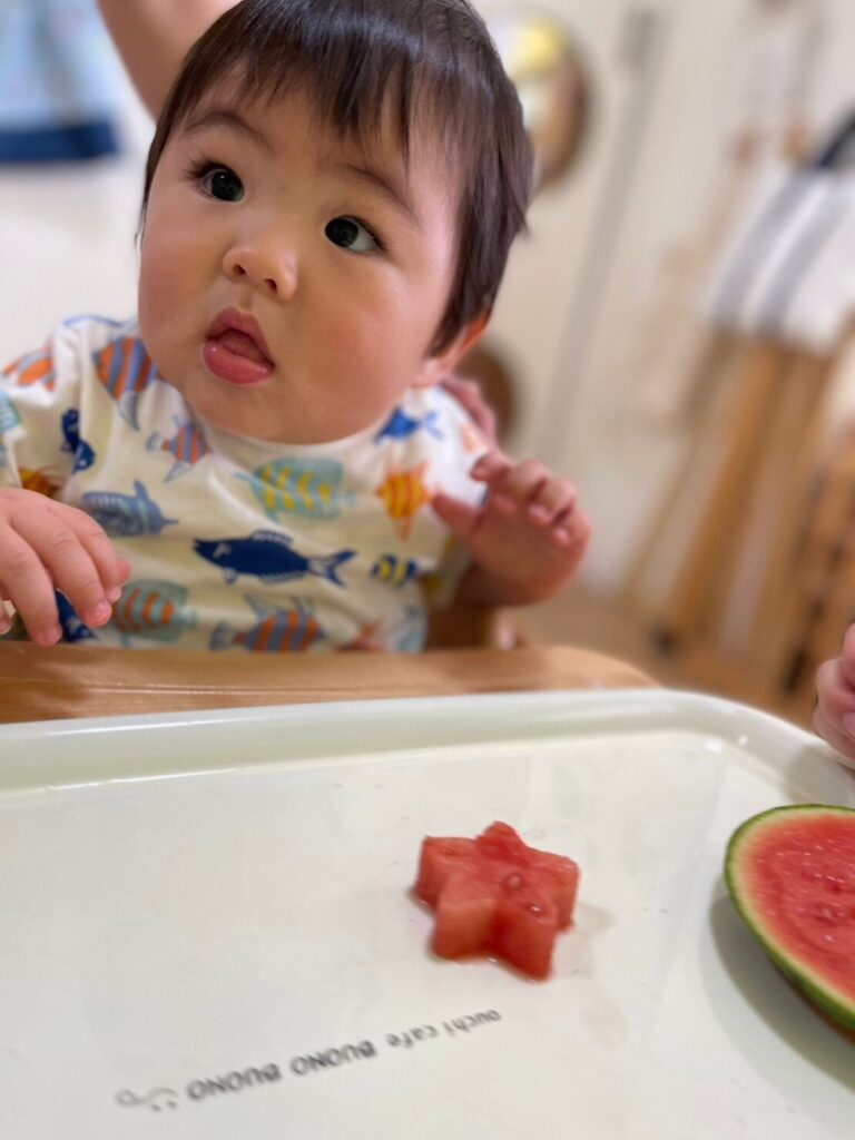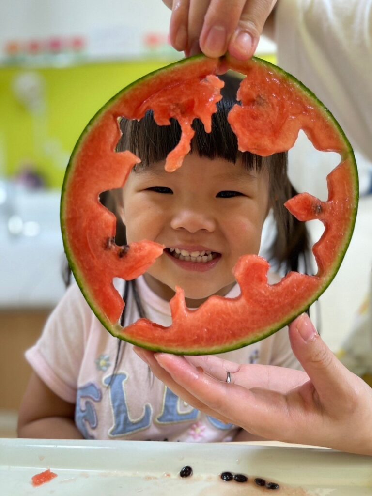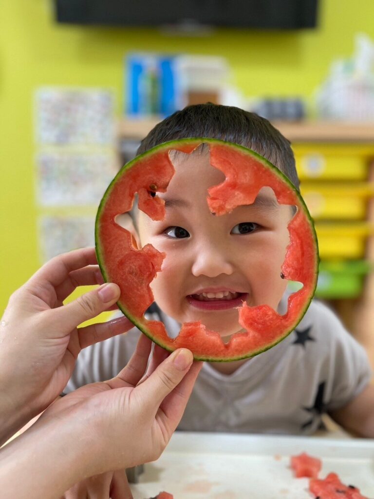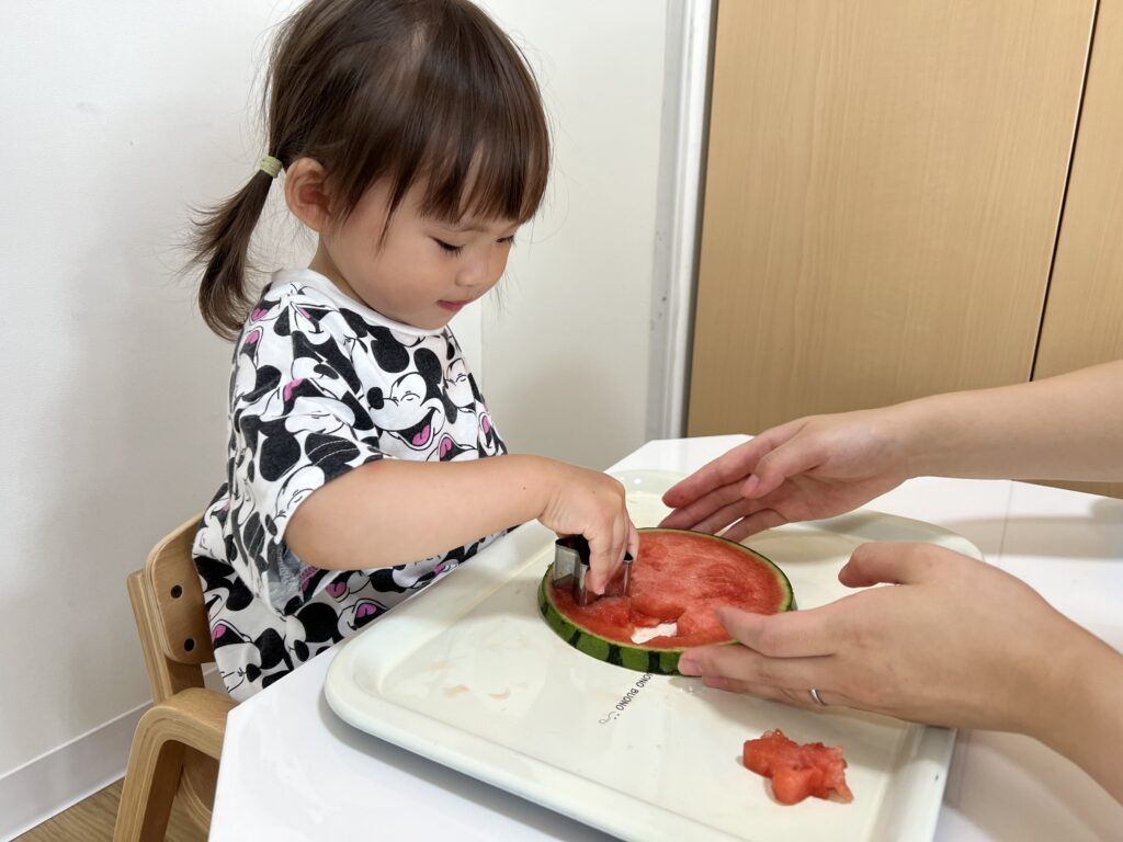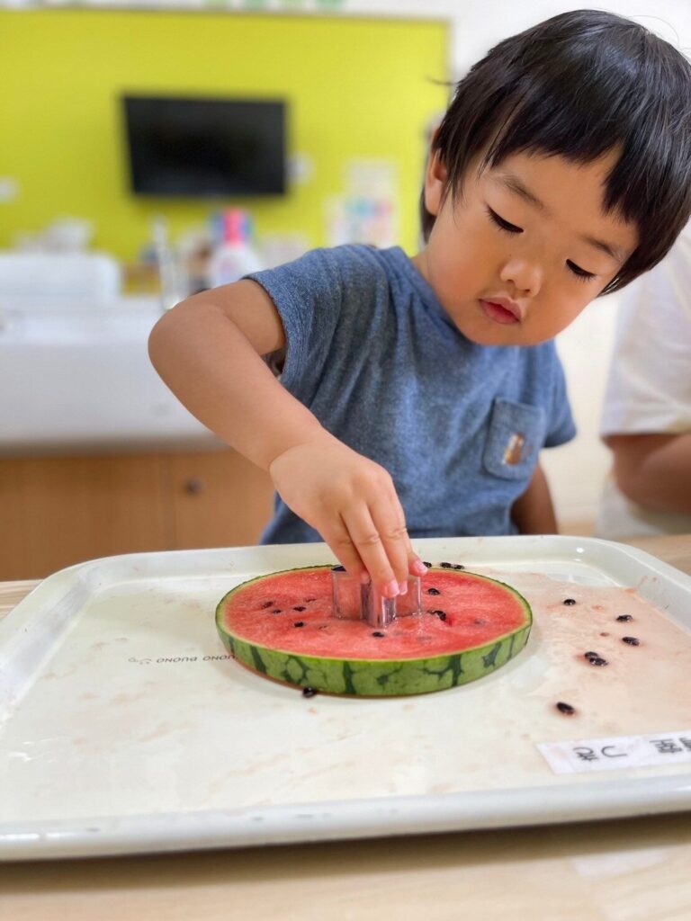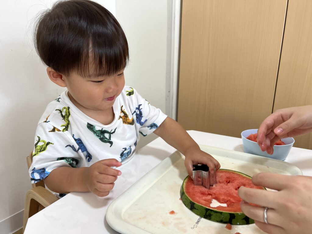 スイカを見せると「え!スイカだ!すごーい!」「触りたーい!」と興味津々だった子ども達⭐︎