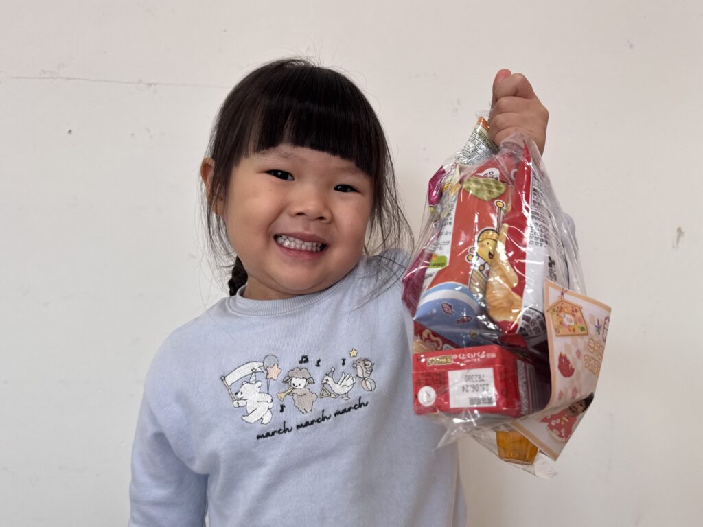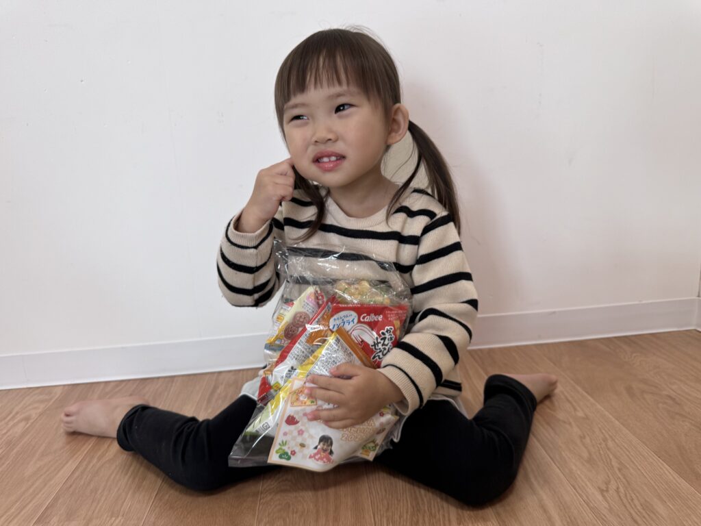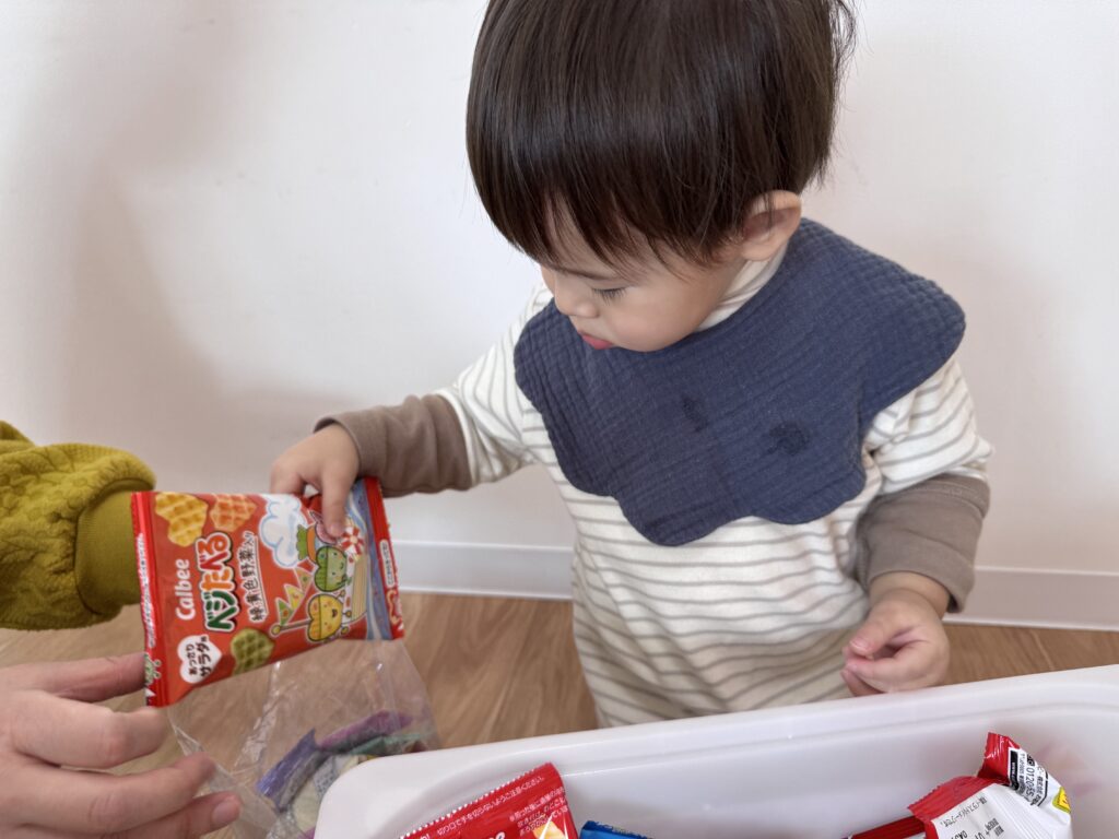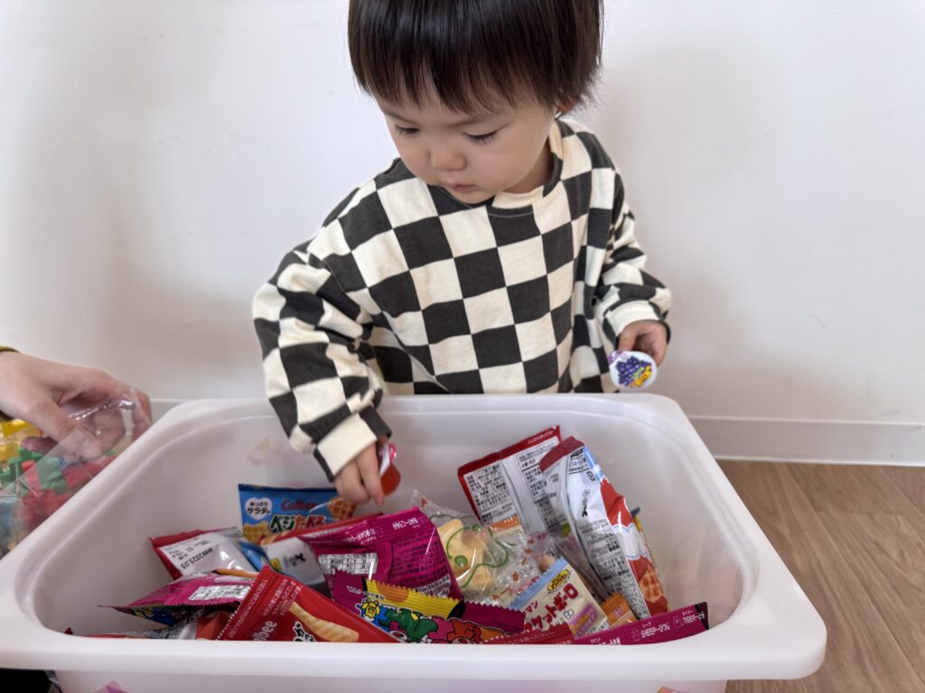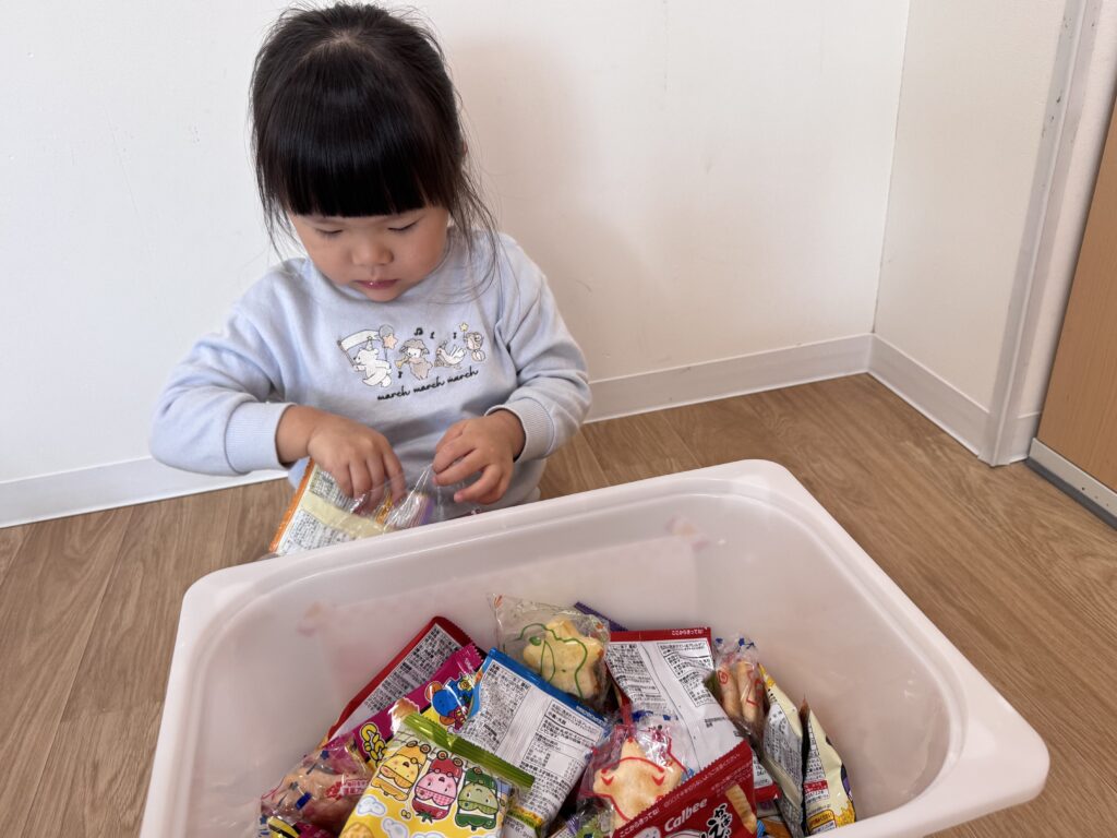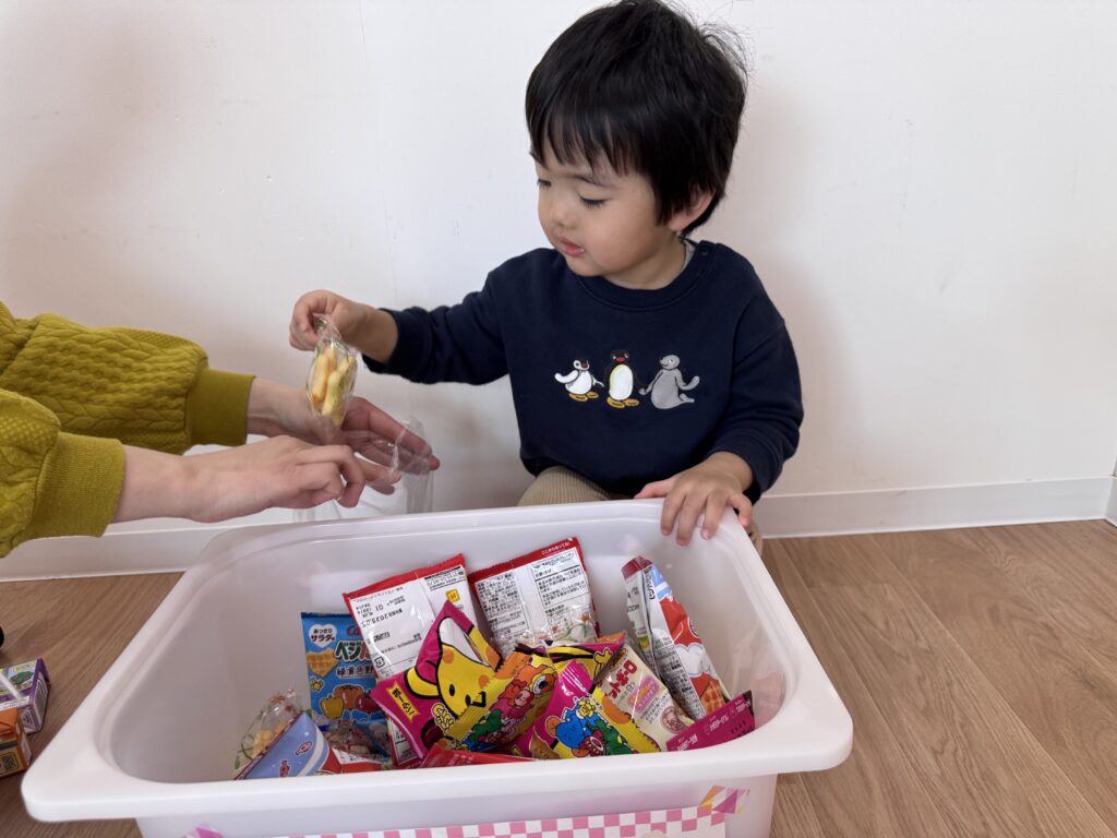 こちらのRくんも早くお菓子が欲しい様子ではありましたが、いざ詰め放題をしてみると、ゆ〜っくりとお菓子を詰めています(笑)お目当てはめんこちゃんですが、保育士が提案したお菓子も律儀に袋に入れてくれます(笑)