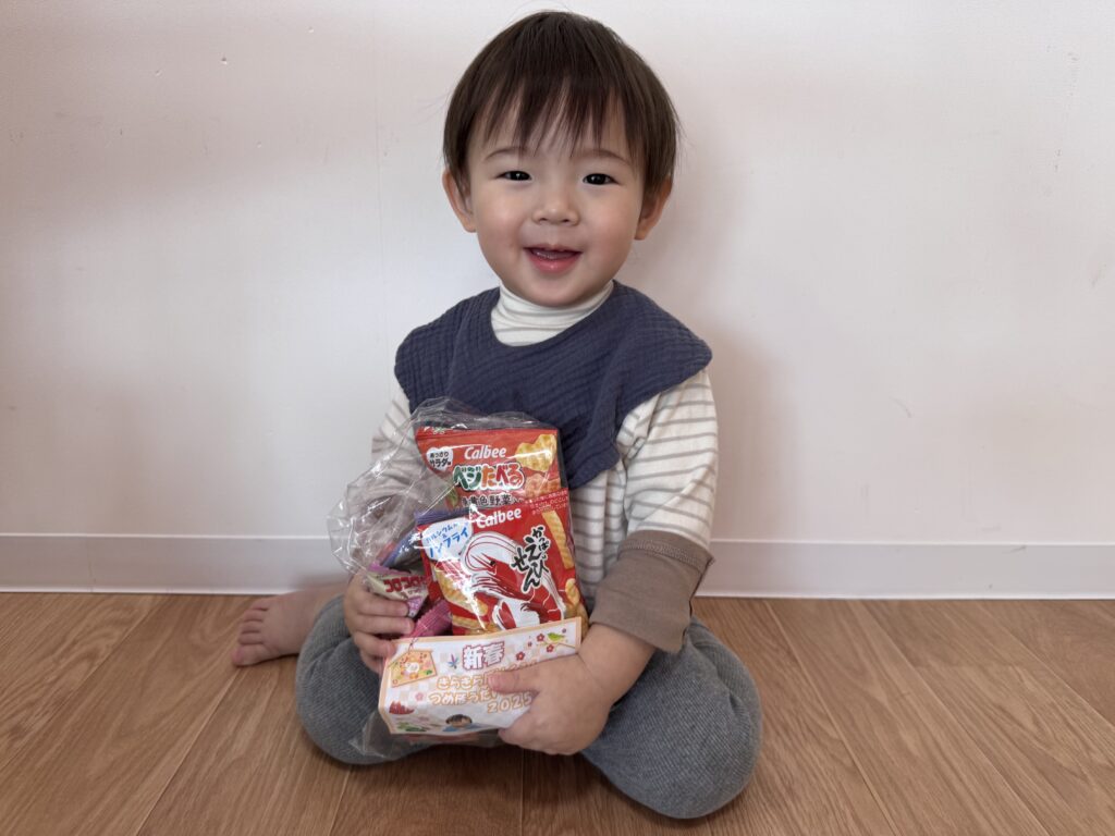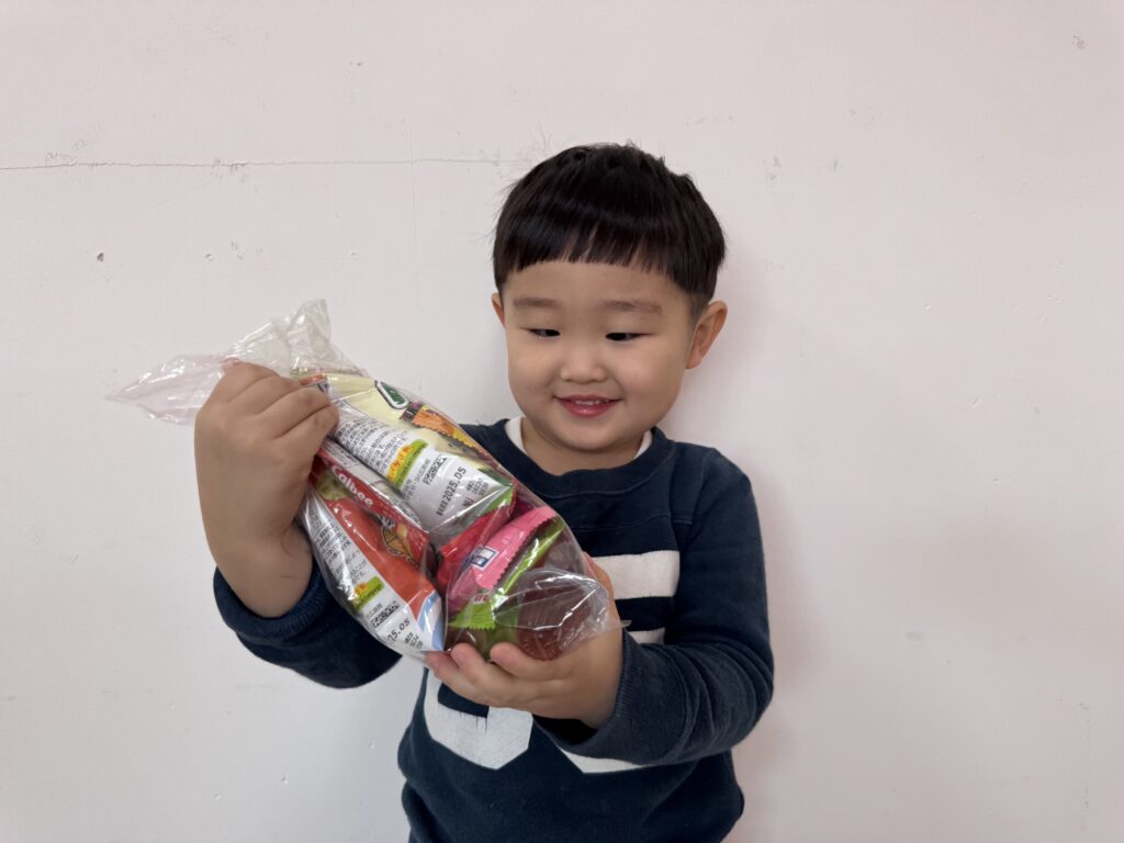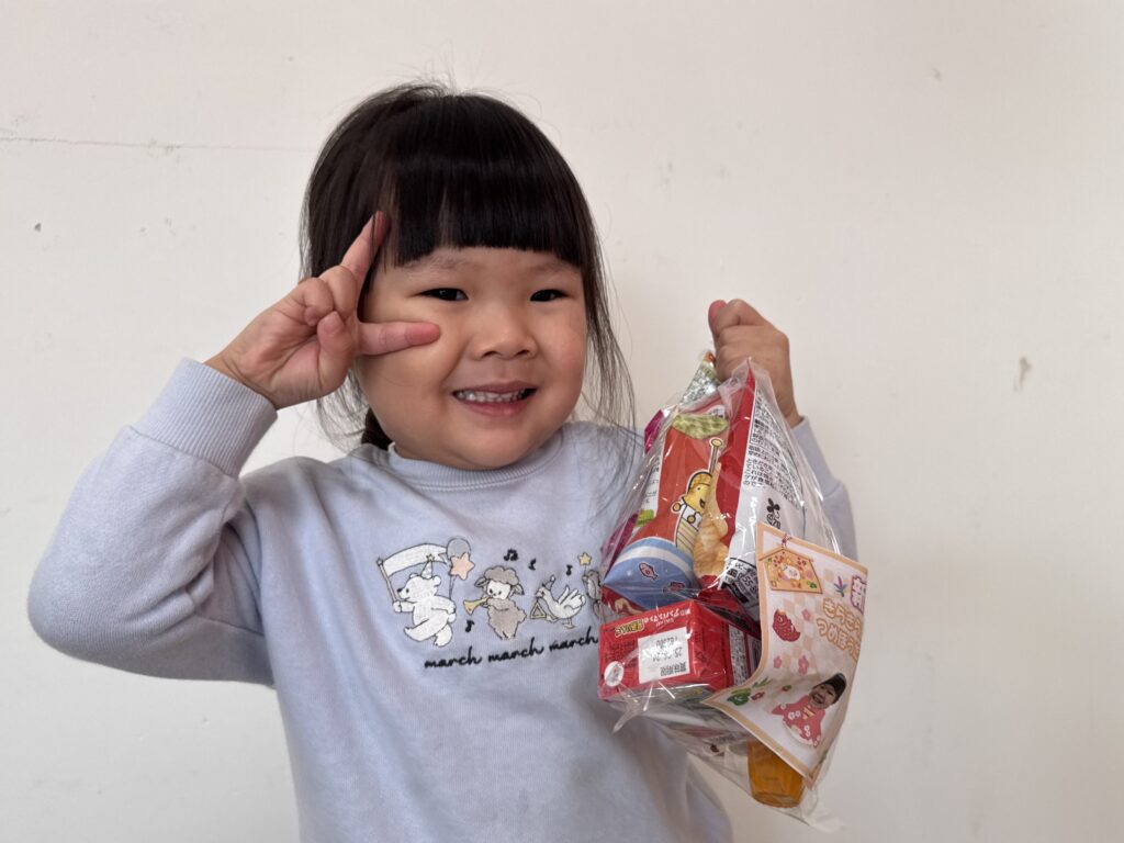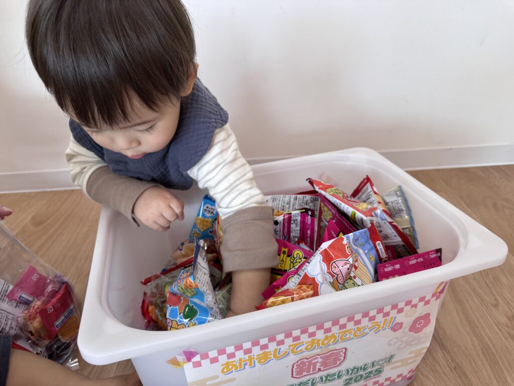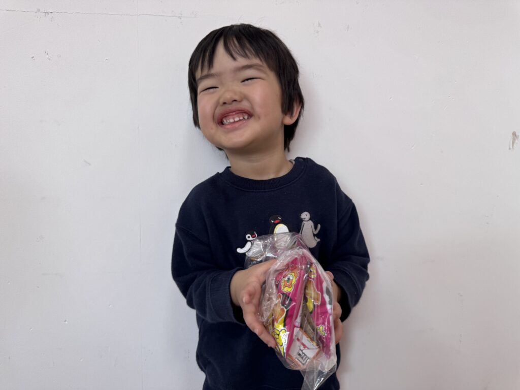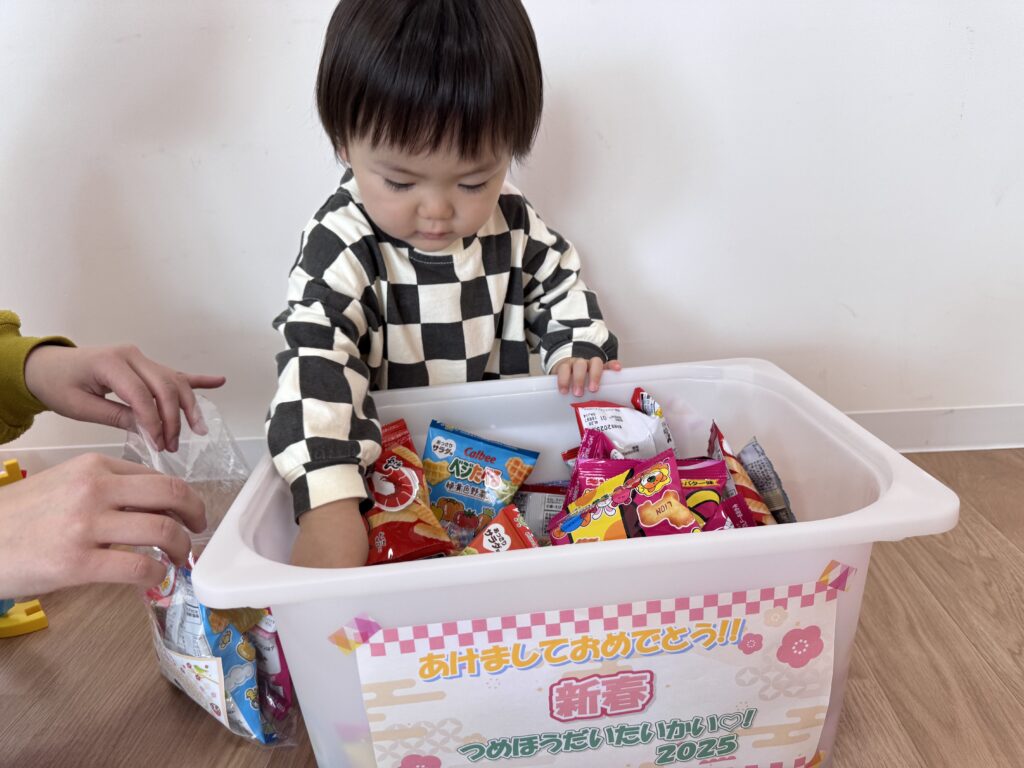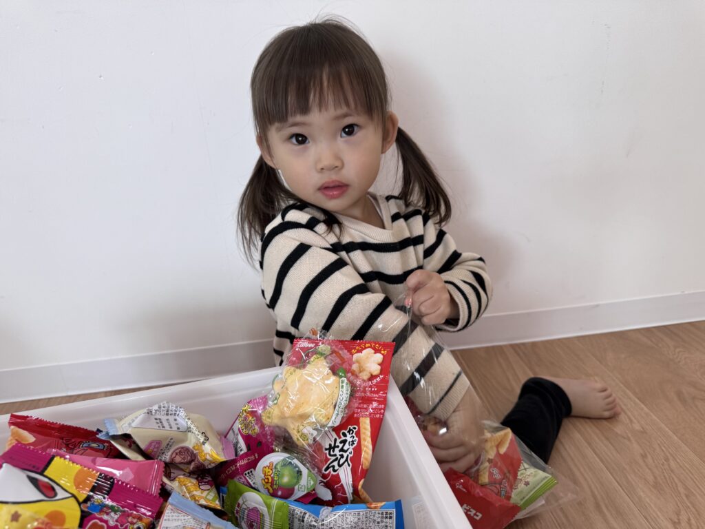こちらのRくんも早くお菓子が欲しい様子ではありましたが、いざ詰め放題をしてみると、ゆ〜っくりとお菓子を詰めています(笑)お目当てはめんこちゃんですが、保育士が提案したお菓子も律儀に袋に入れてくれます(笑)