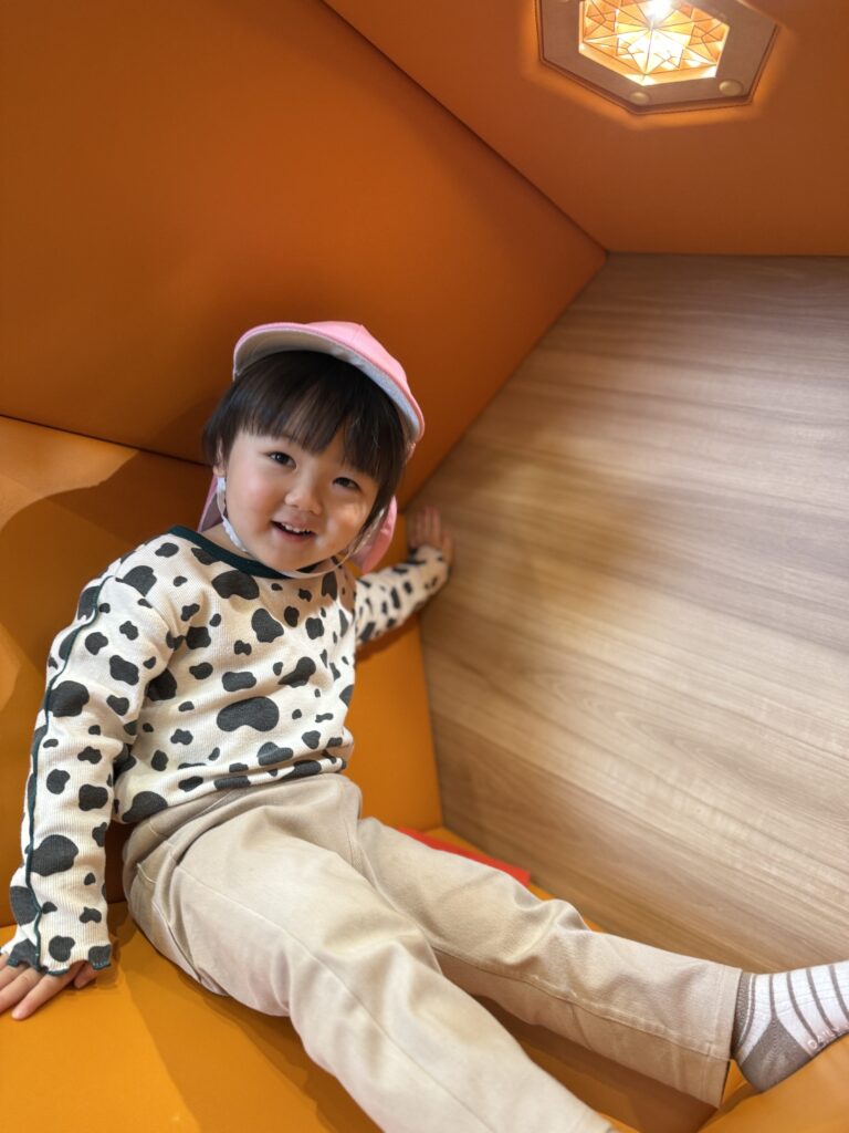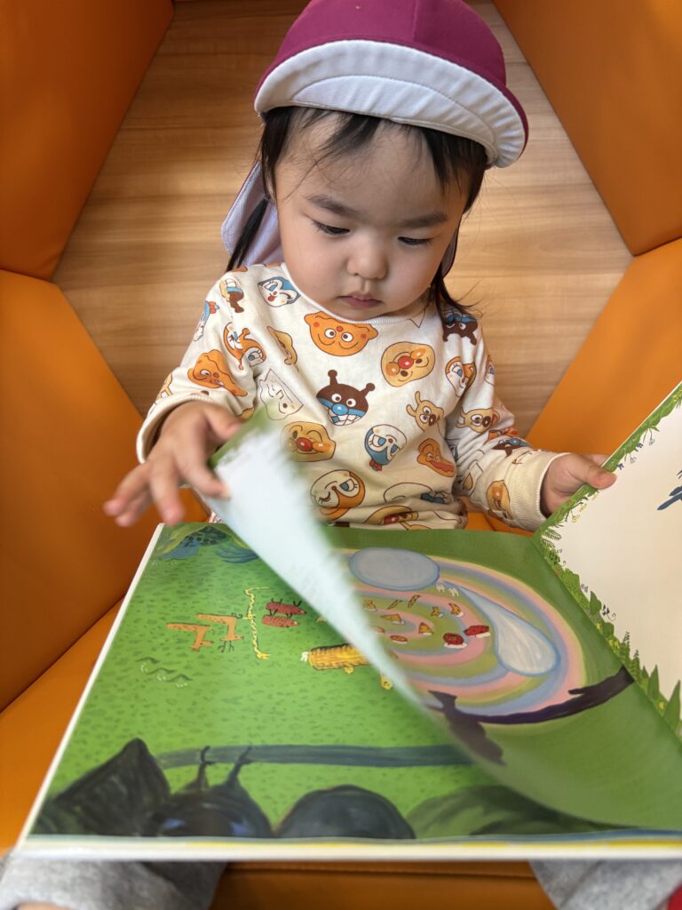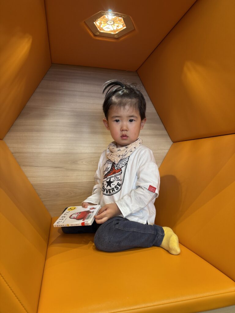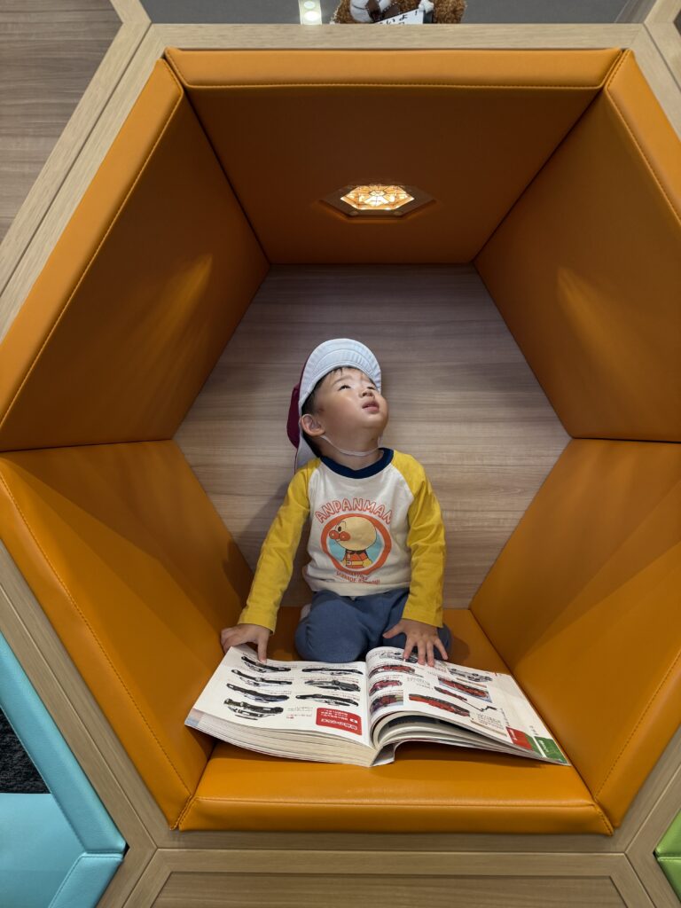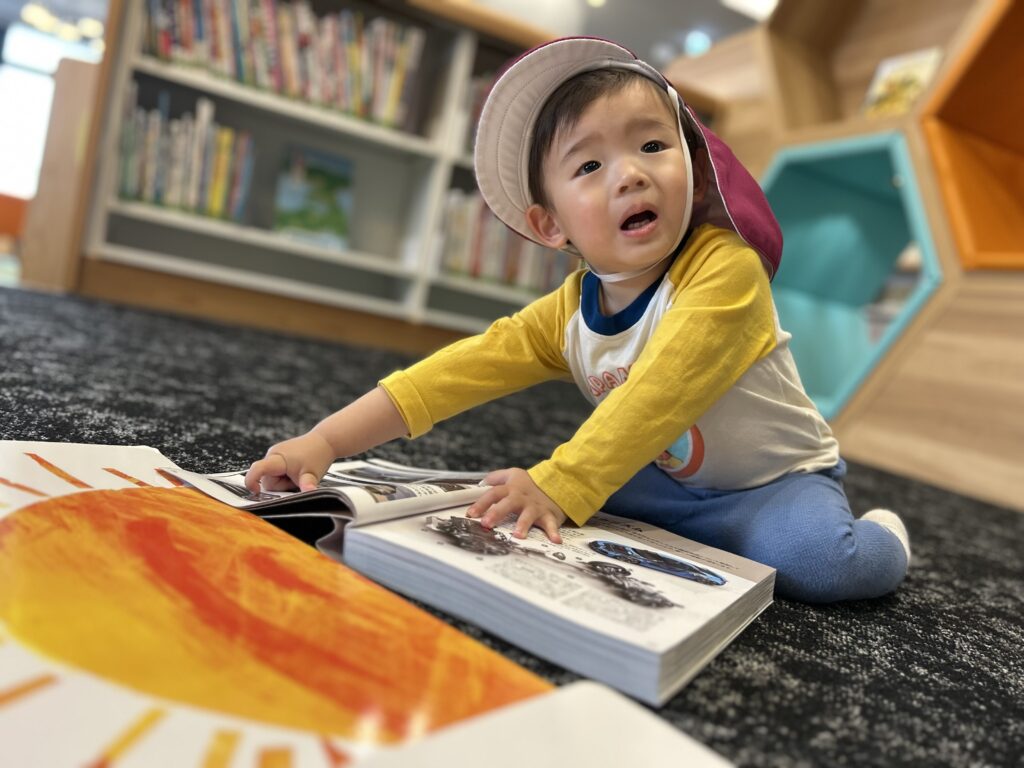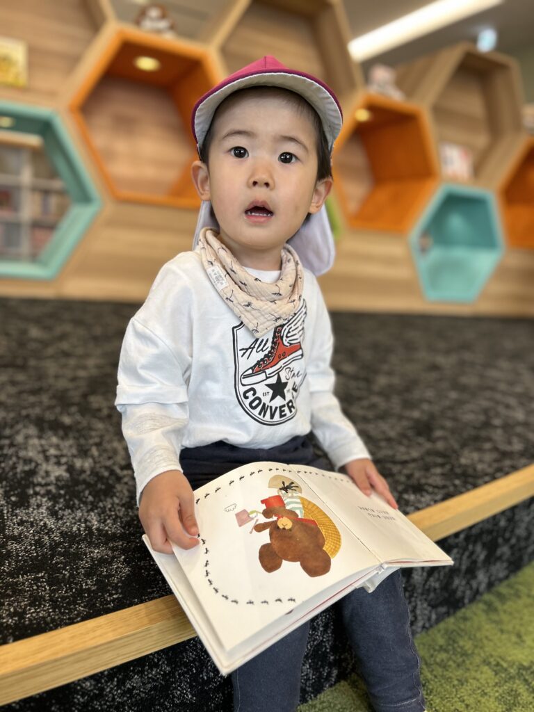 エレベーターに乗り、3階に着くと幼児向けの絵本がたくさんっ✨早く絵本が見たいという気持ちが強く普段は脱がせてもらっている靴も一人でササっと脱ぎ、気になる絵本を手に取っている姿がありました(笑)