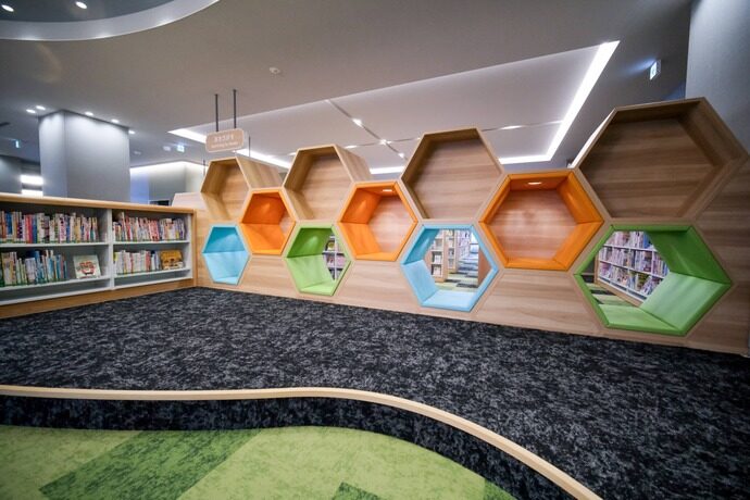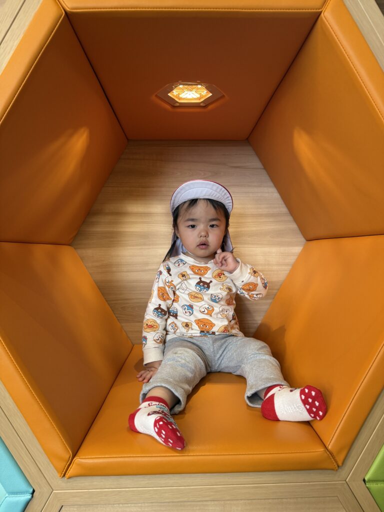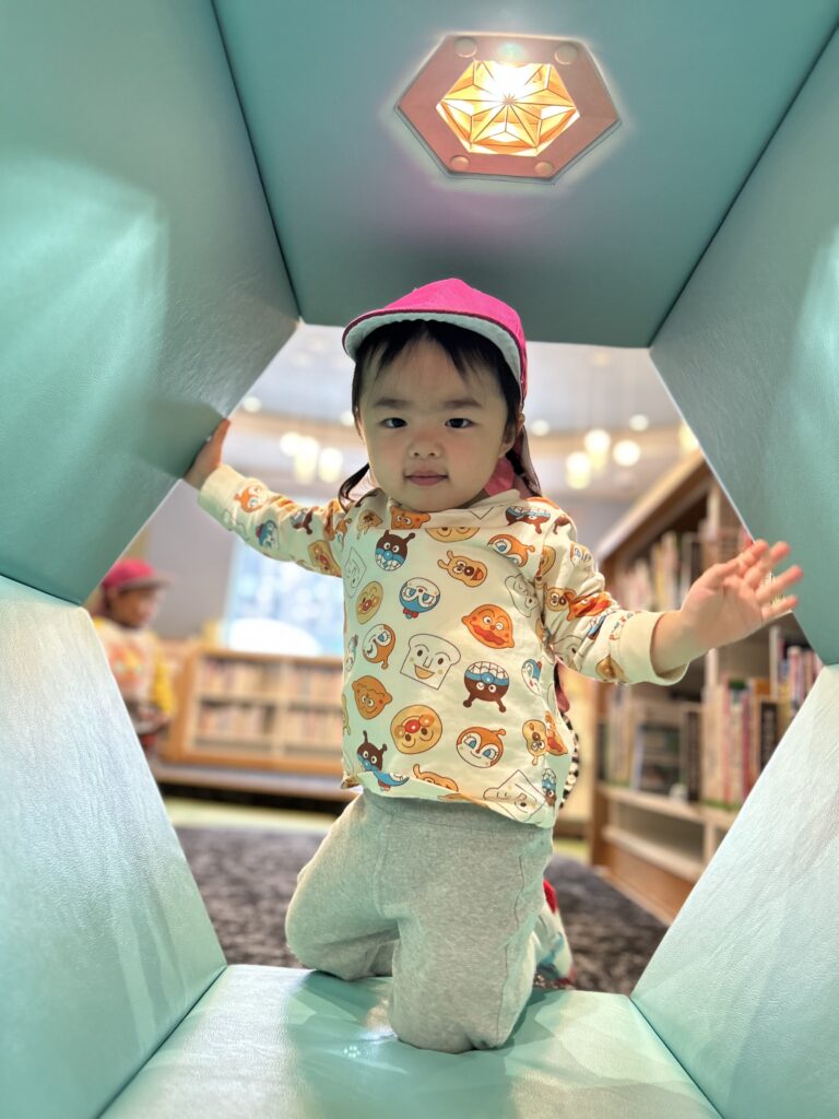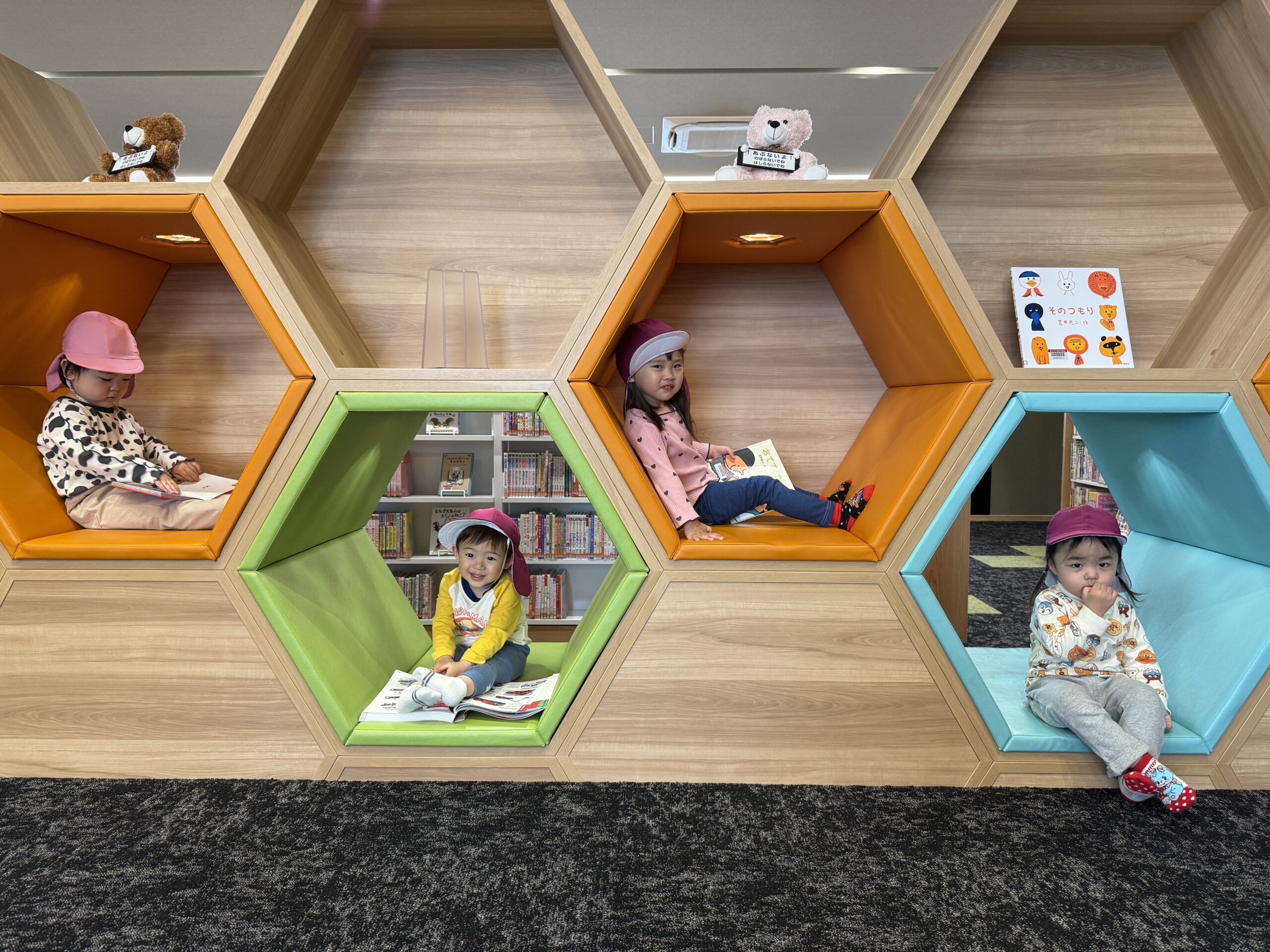 クッションが付いて柔らかい六角形に造作された棚の中を通り抜けたり、その中で本を読んだりできるスペースなんです!子どもたちもお気に入りの場所でゆっくりと絵本を見ていましたよ👀