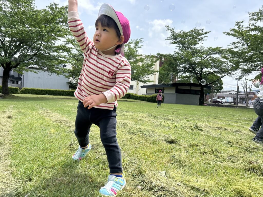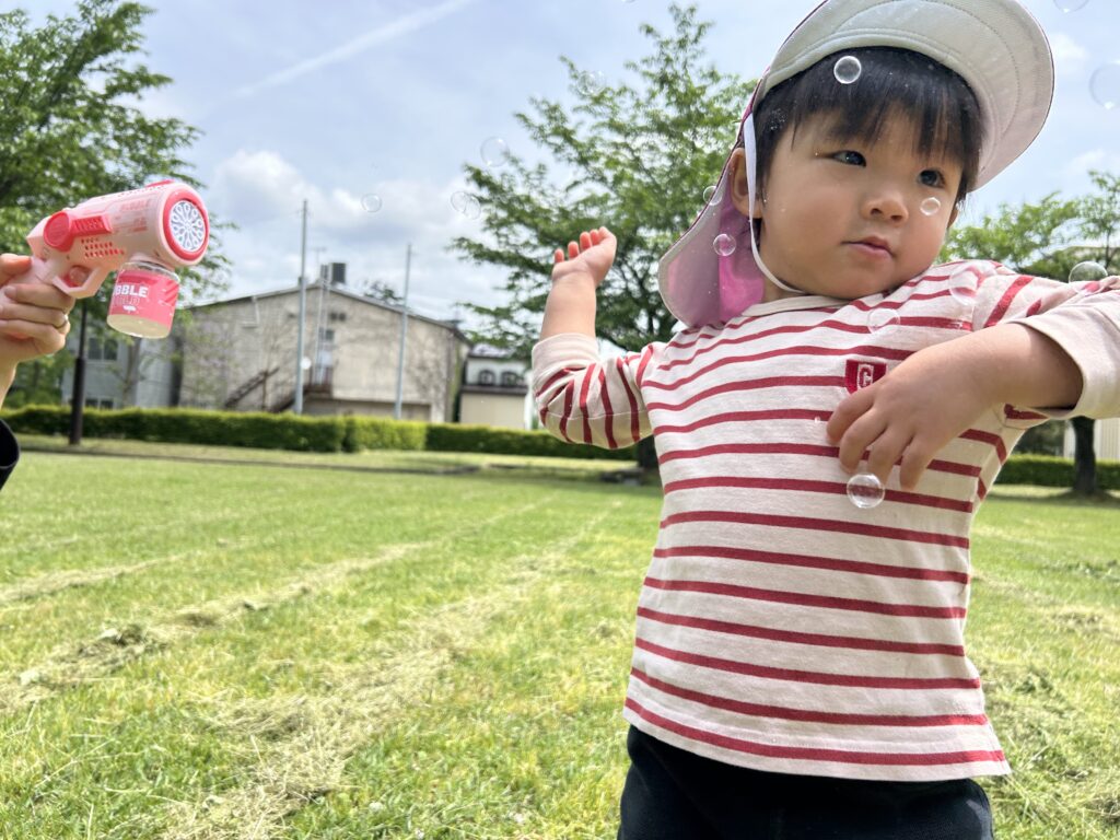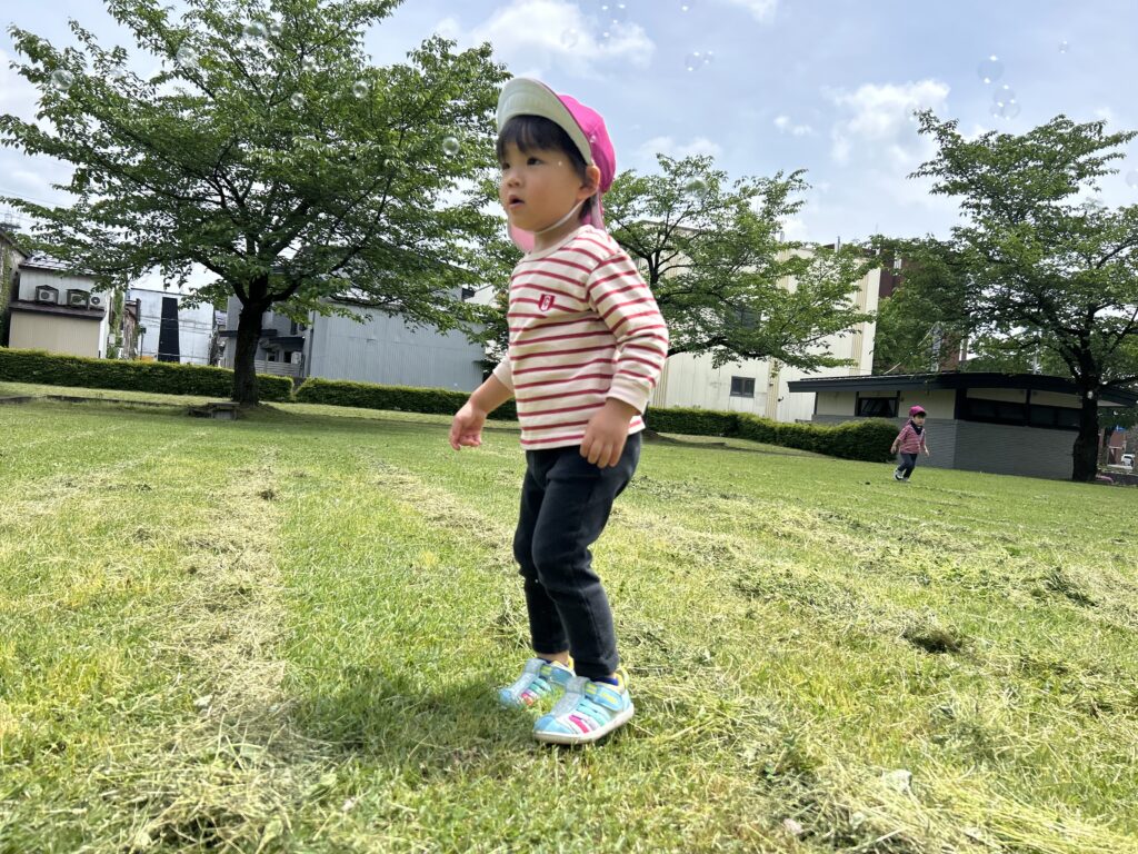 バブルガンから次々に出てくるしゃぼん玉を『まって〜』と追いかけたり、捕まえようとしたり…