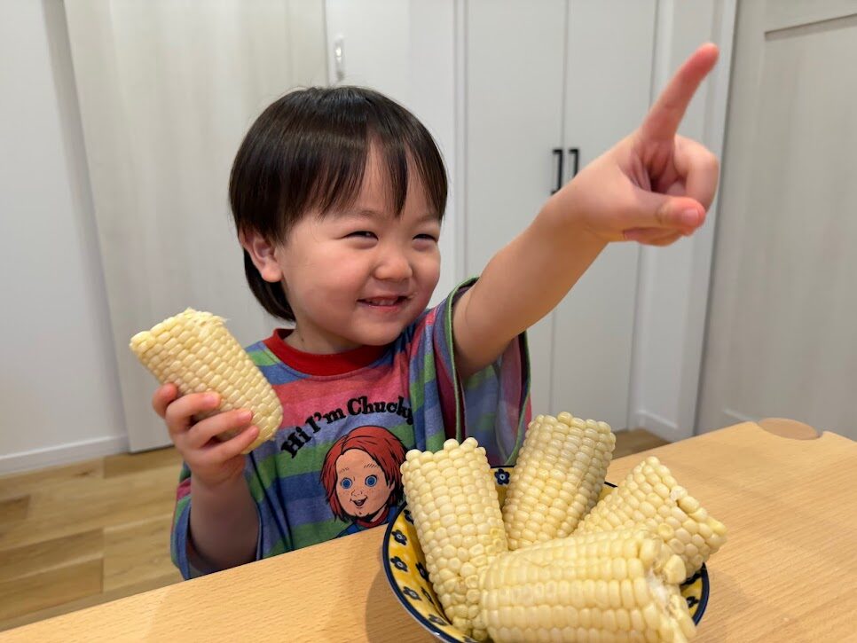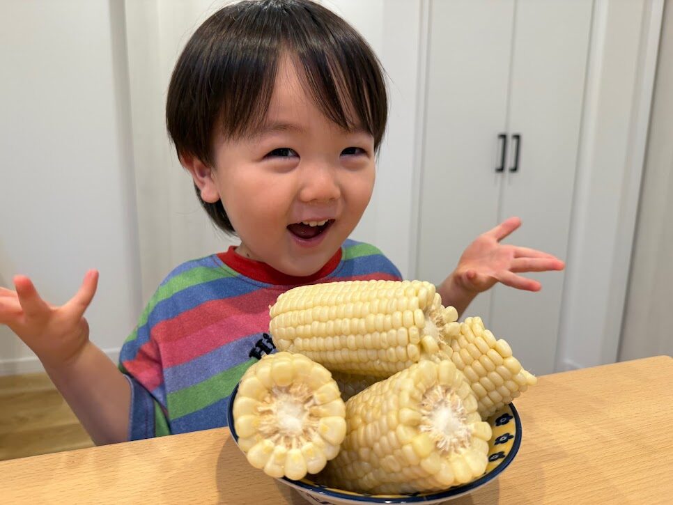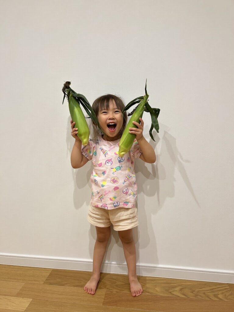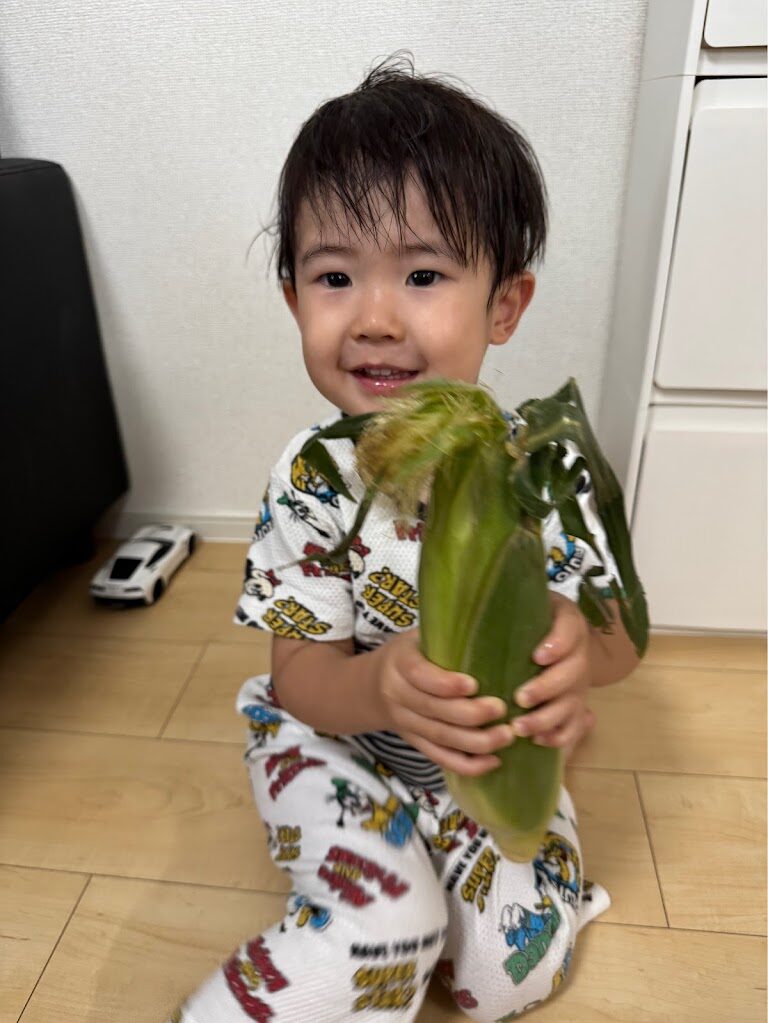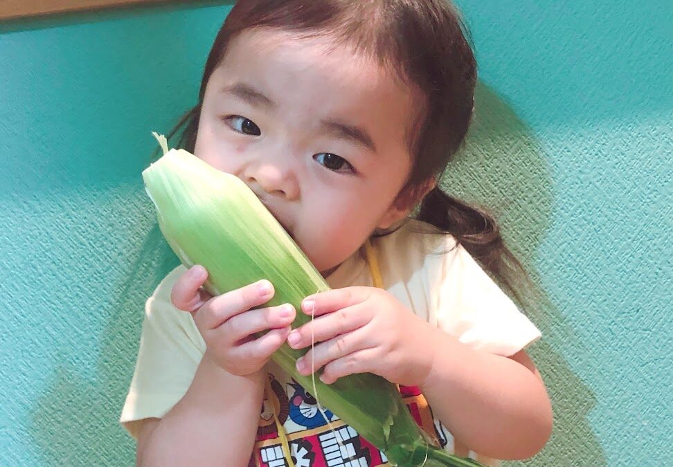 皮付きのとうもろこしを初めて見る子いたので、皮をむいて白いとうもろこしが出てきてこれまたビックリ😯⁉️