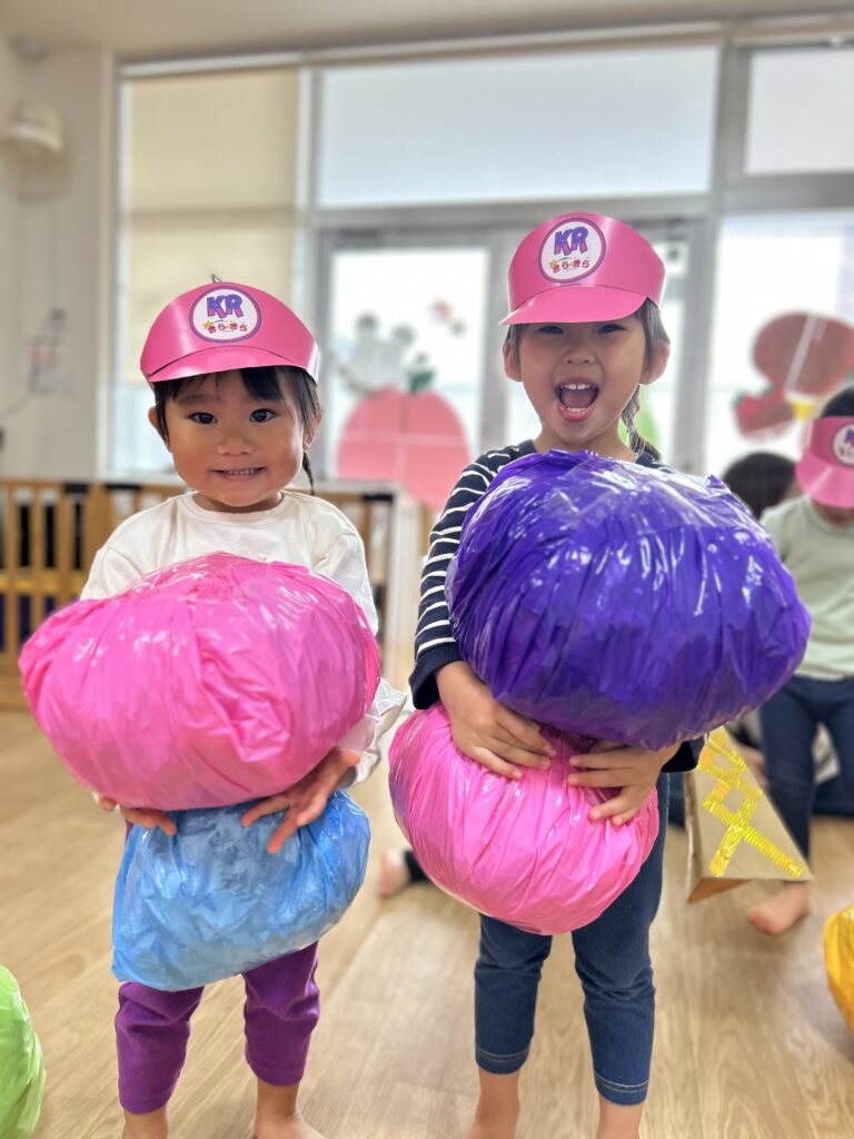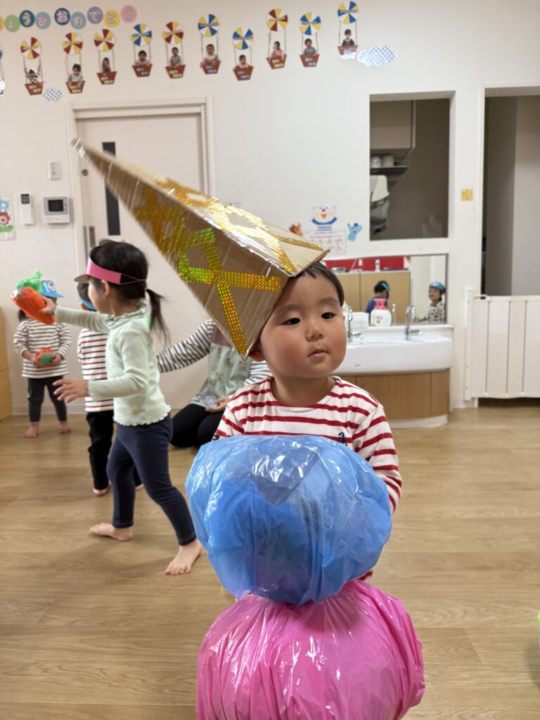 中には頭の上に乗せ、歌『♫北風小僧の寒太郎』を流してもらいながら保育者と一緒に北風小僧の寒太郎ごっこを楽しむなど様々な遊び方でバランスストーンを楽しみました♡