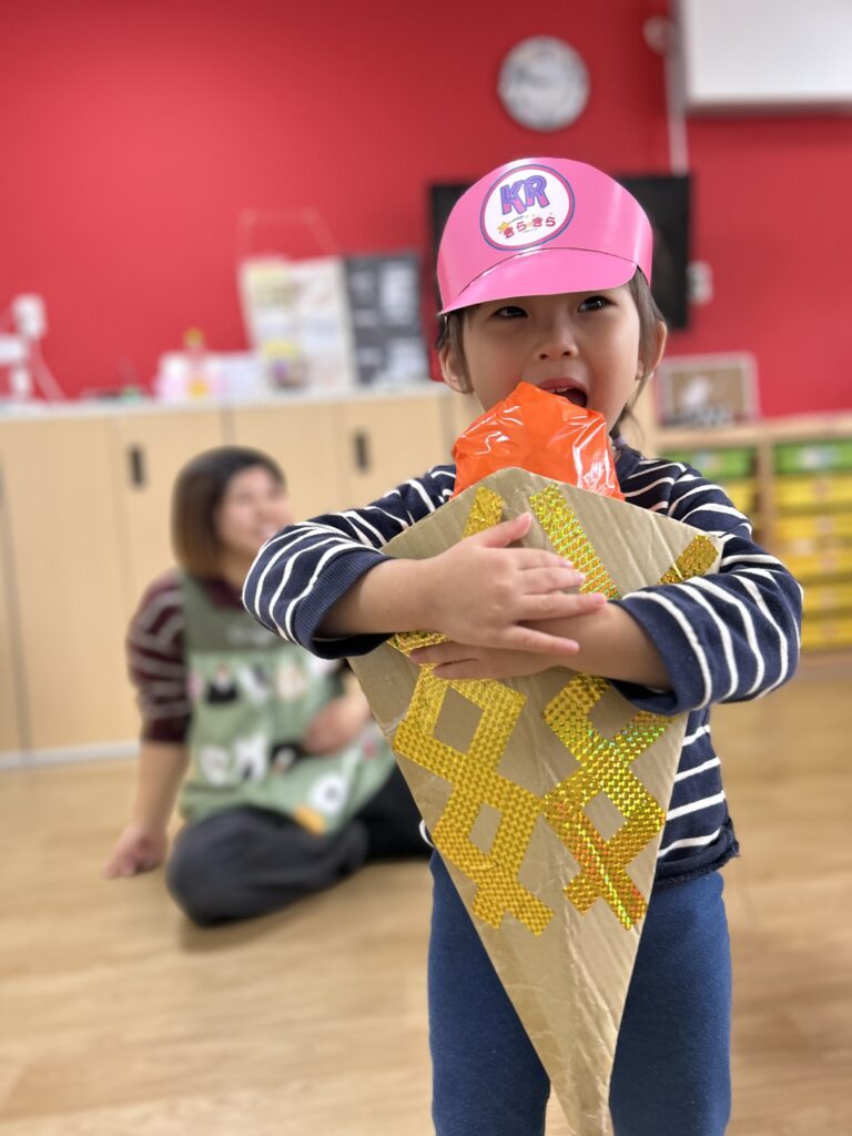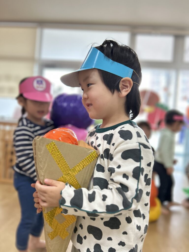 ダブルのアイスを作ったり、0歳児さんが使ったニンジンやりんごを使わせてもらいコーンの中に入れたりしながらいろいろなアイスクリームを作って楽しみました♡