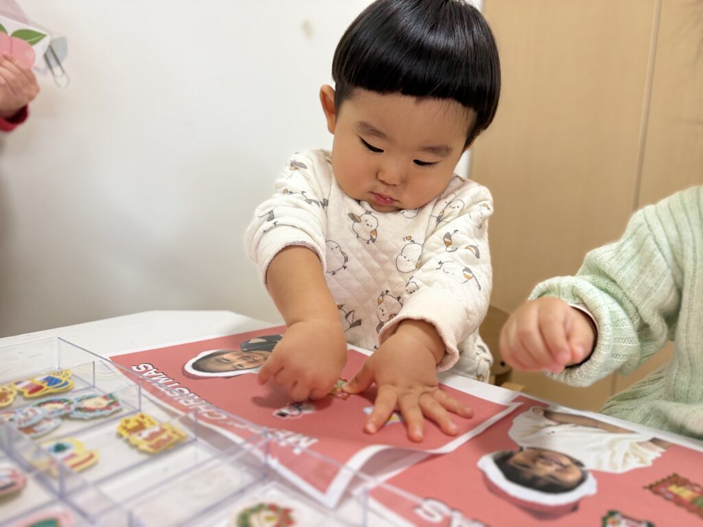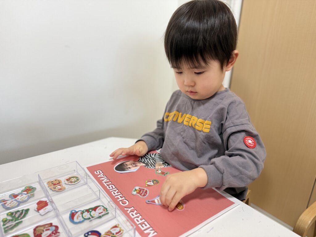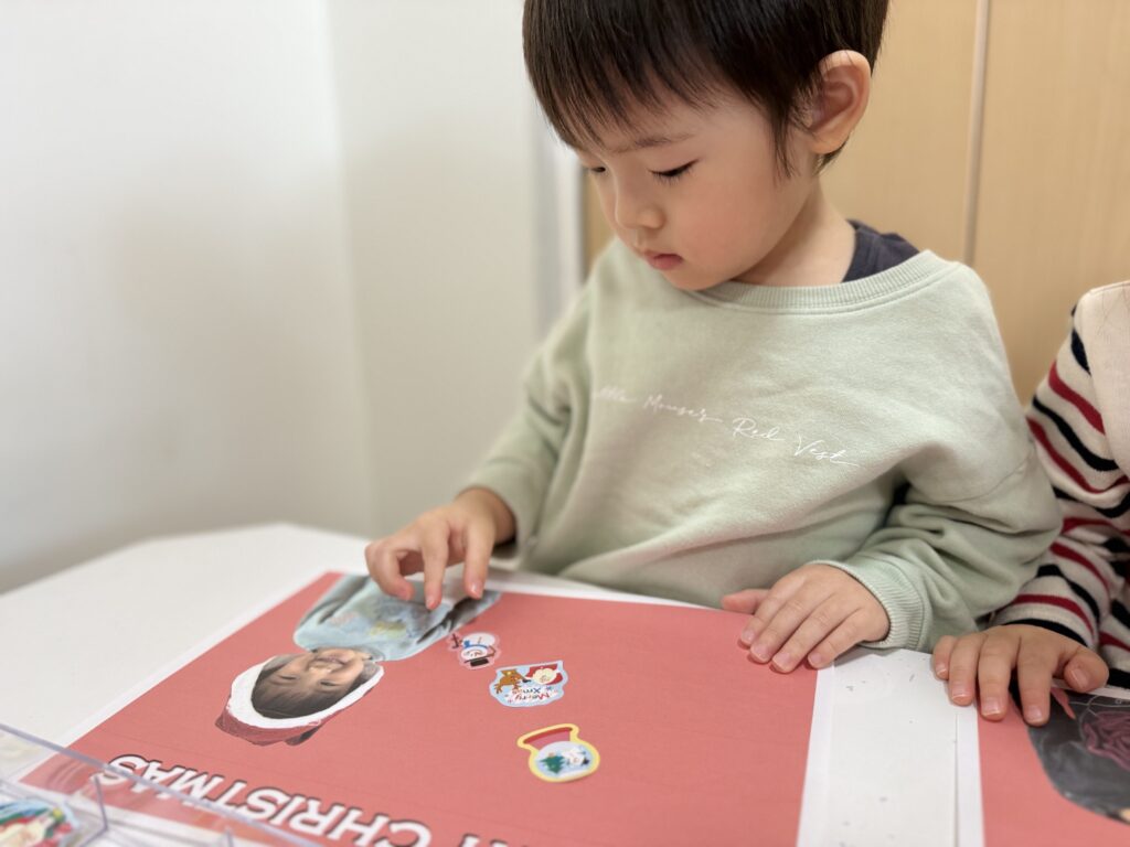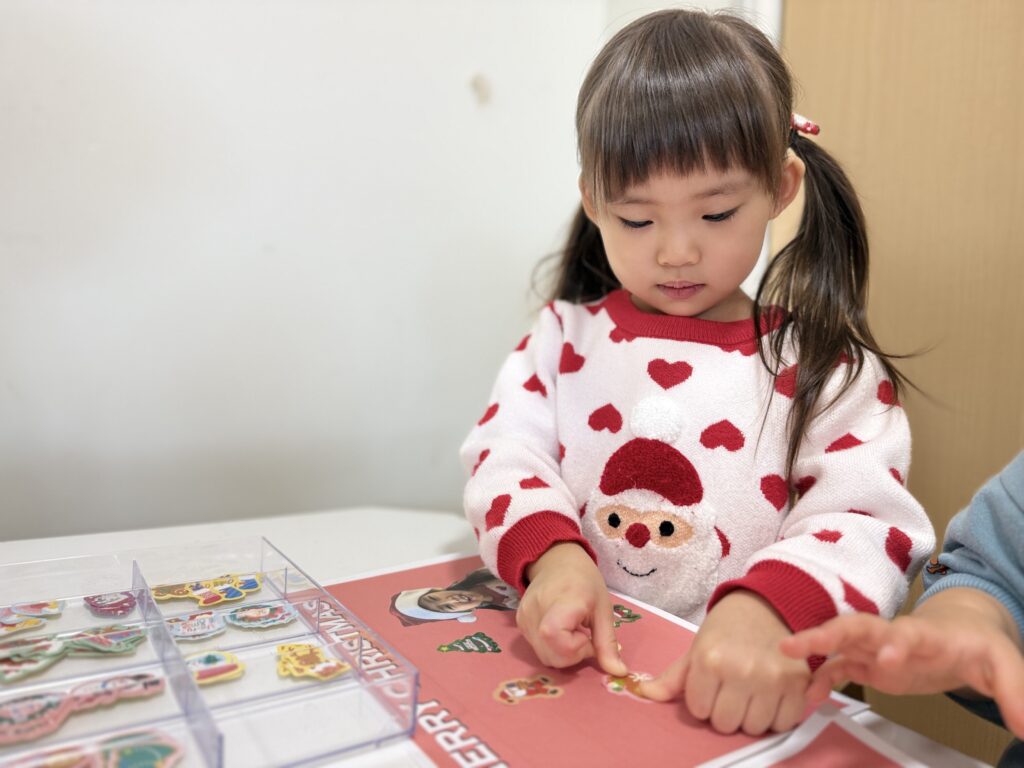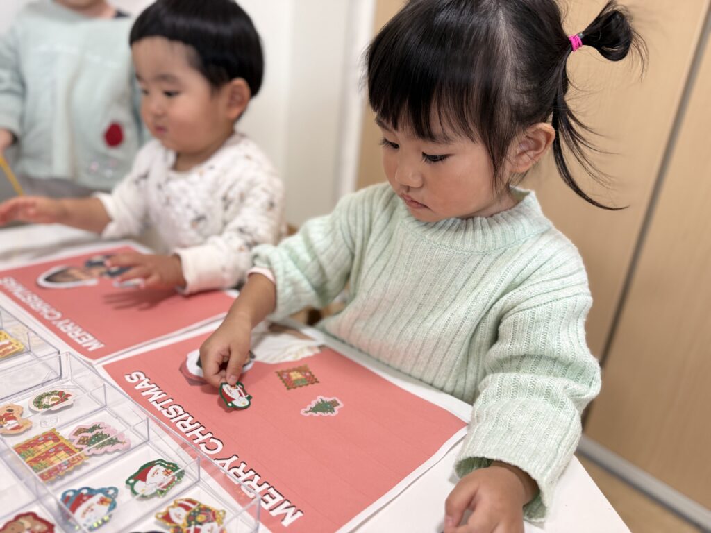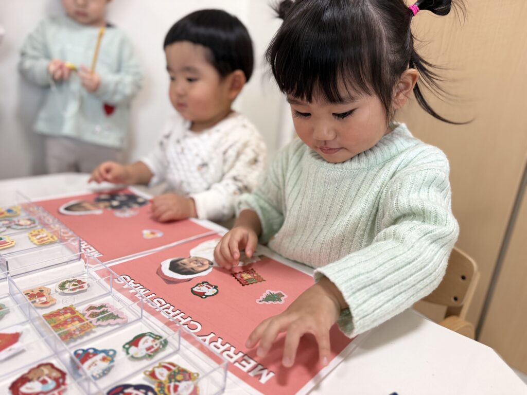 一人ひとり、『これー!』『サンタさん』と自分の好きなシールを選んで貼ったり、中には選ぶシールは全てサンタさんなどサンタ推しのお友だちも🤭❤️
