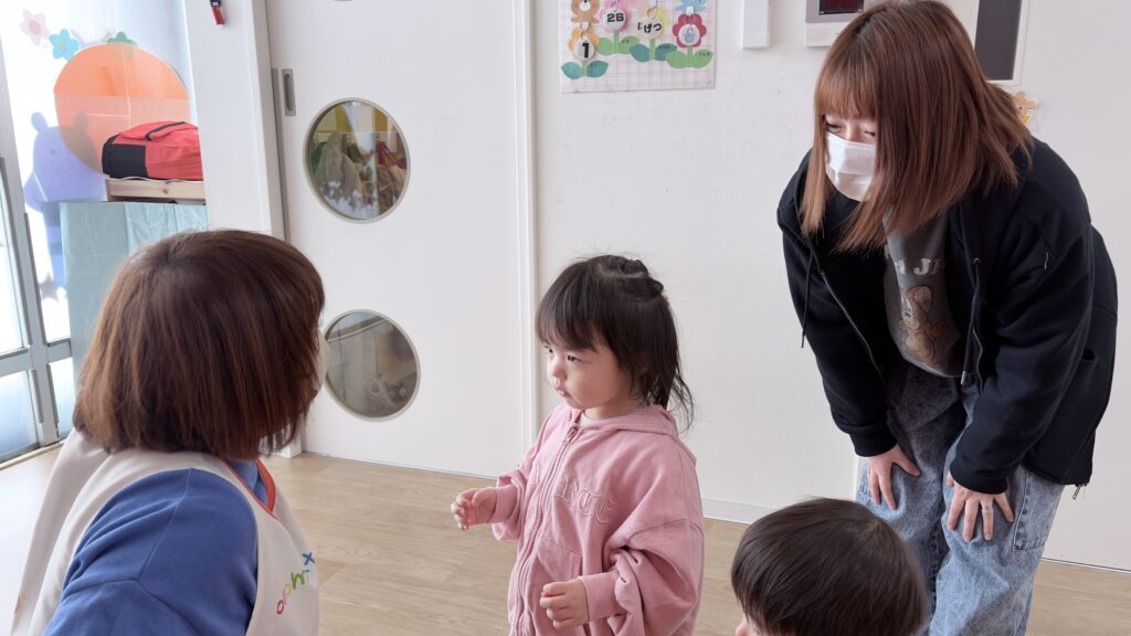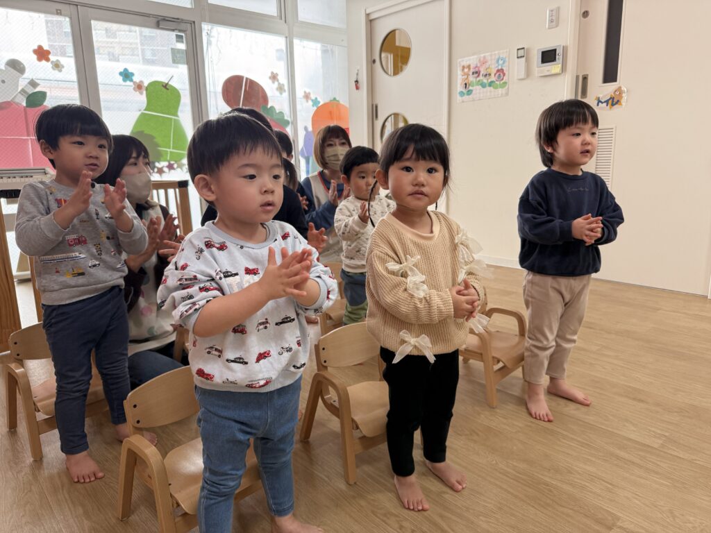 4月からお姉さんになり、笑顔はもちろんですが、声を出して笑ったり、お友だちや保育者の名前を呼んだり、お話したりと1年前とは違うUちゃんの姿を見ることができ、その成長がとっても嬉しいです♡お家の方とお話するとお家の姿と保育園での姿がぐるっと違うことに驚きつつ、少〜しずつ園でもちらっと見える時も…🤭♫