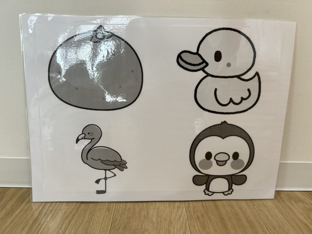 絵本『ぞうくんのさんぽ』を見ながら好きな遊びに丸をつけてもらったり、ケーキにロウソクシールを貼ったりしながら完成させてもらいました🖍️
