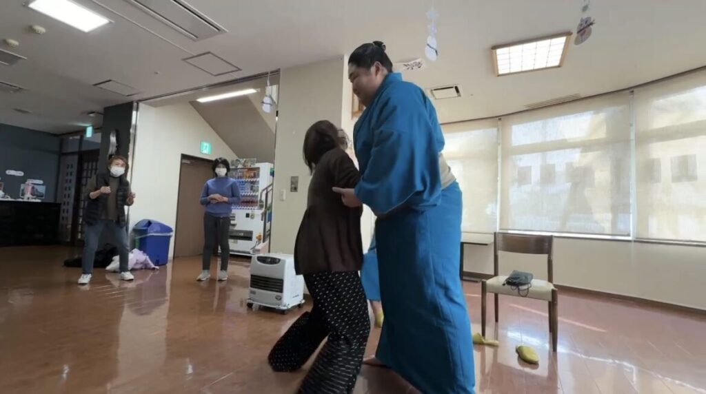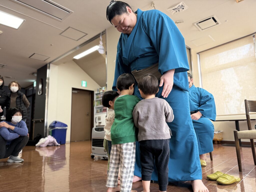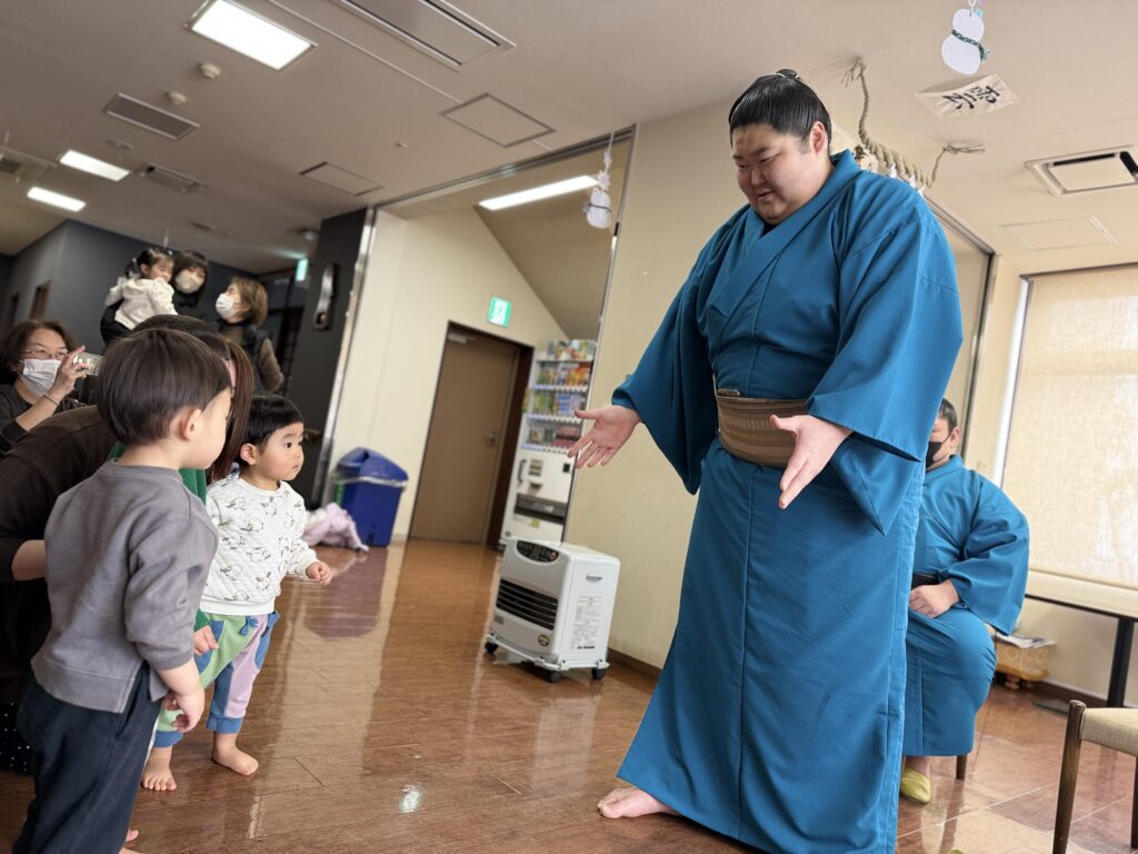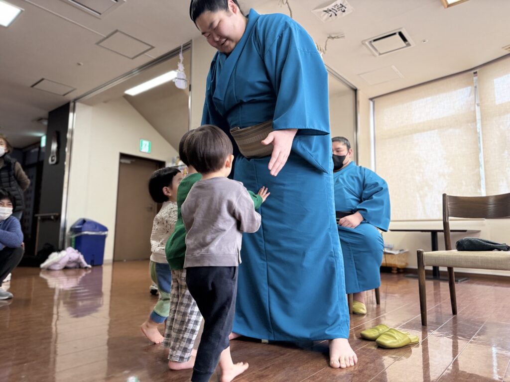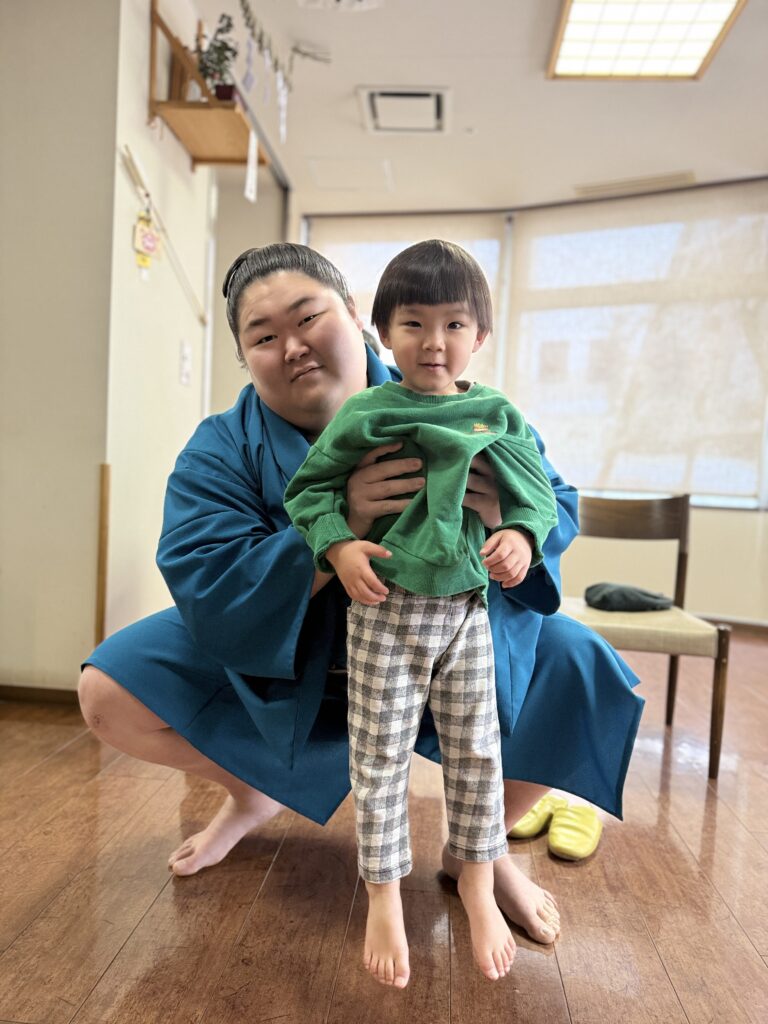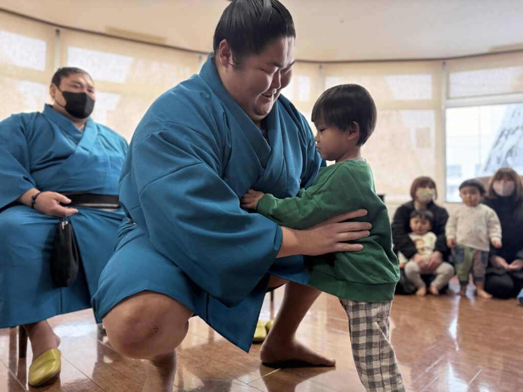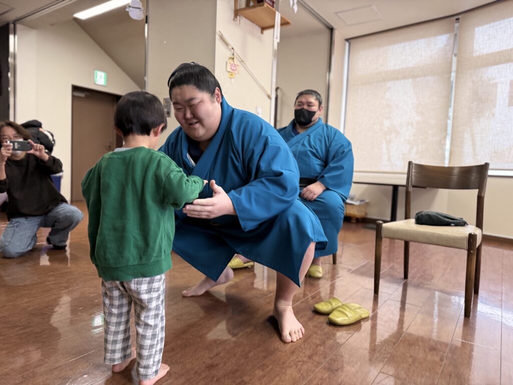 中に入ると早速、力士さんとお相撲をしてもらえることに…🇯🇵✨