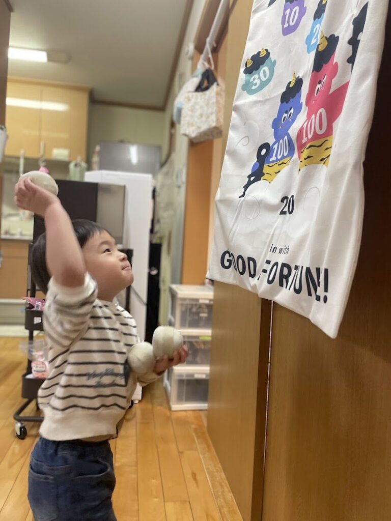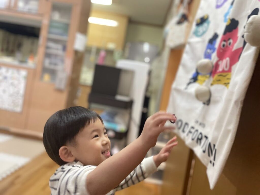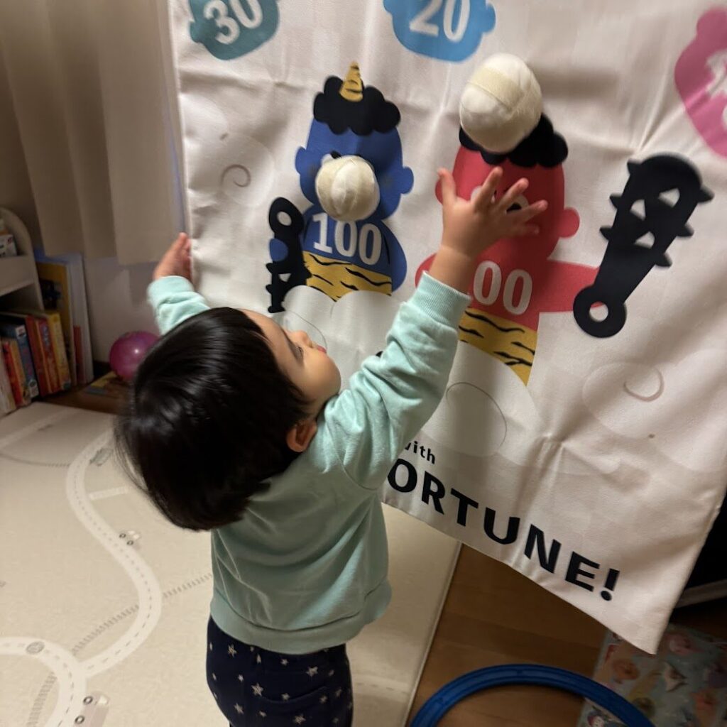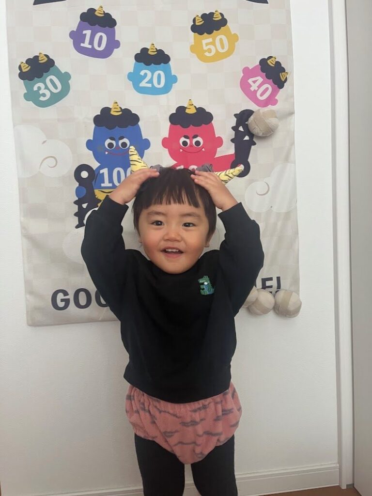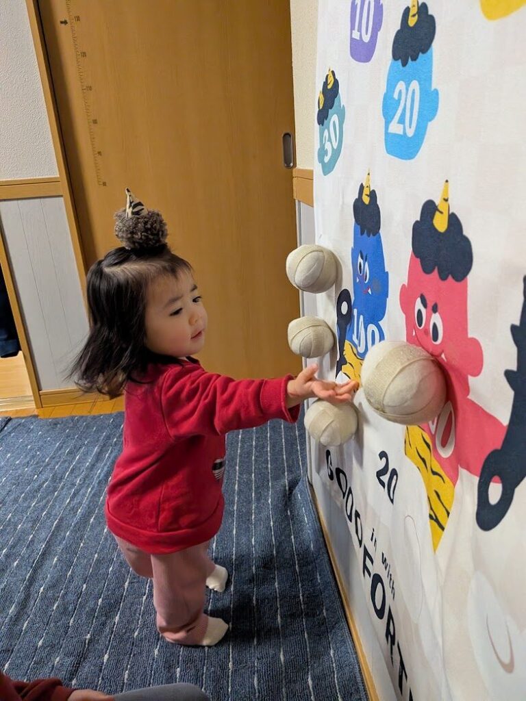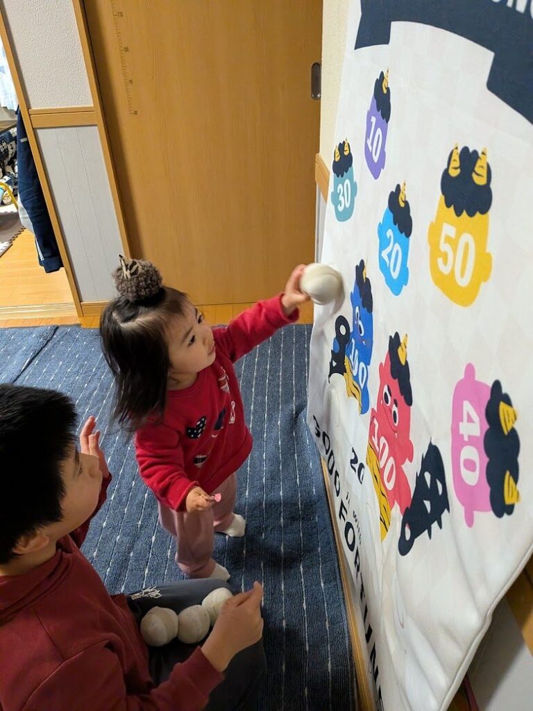 さて、今月のぎゅっdayは、節分行事に合わせて豆まきタペストリーをプレゼントさせていただきました😊🫘タペストリーは、可愛い鬼のイラストに点数がついており、豆に見立てたボールを使って的あてゲームを楽しめるようになっていました👹♪
