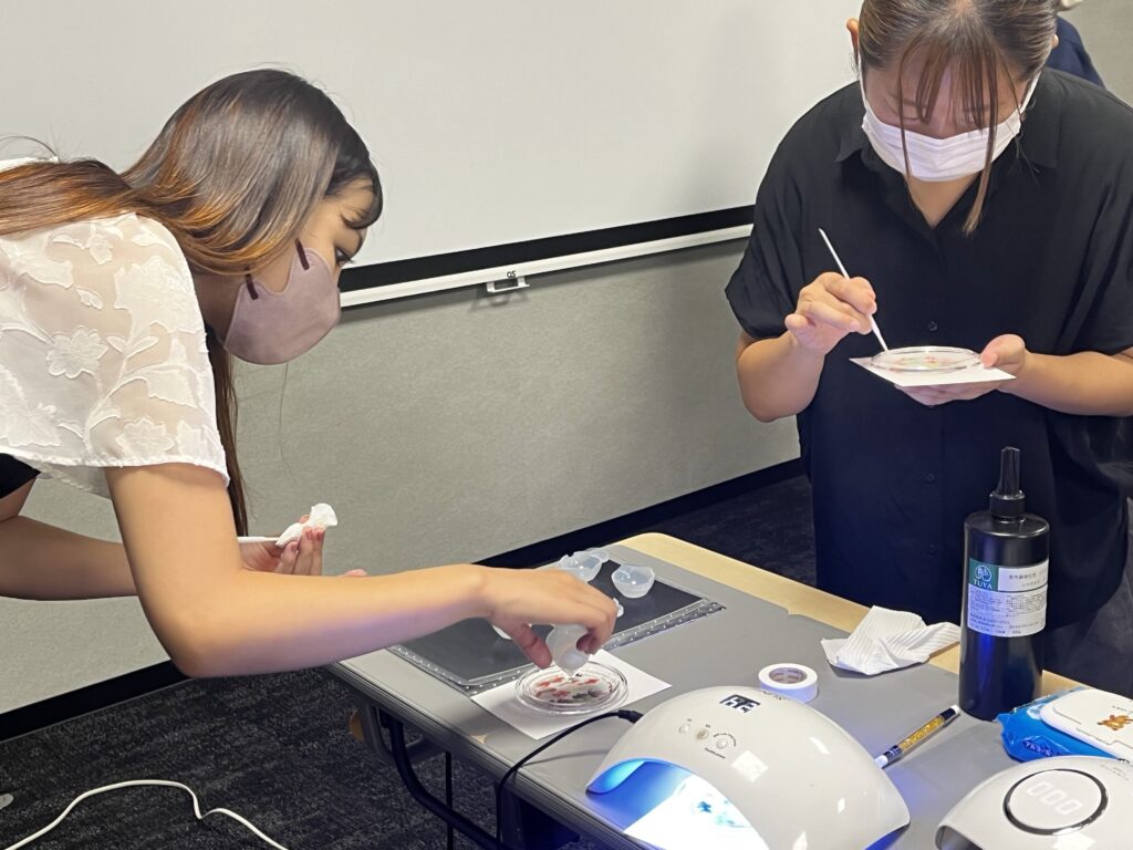 土台となるコースターにシールを貼り、レジンを流して固めるそうです!