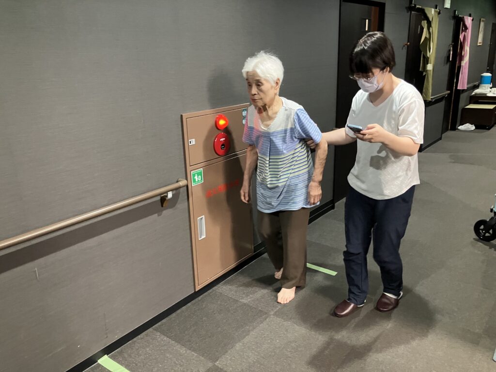 握力測定をして、腕を組んだままの立ち上がりと歩行のタイムを計ります。