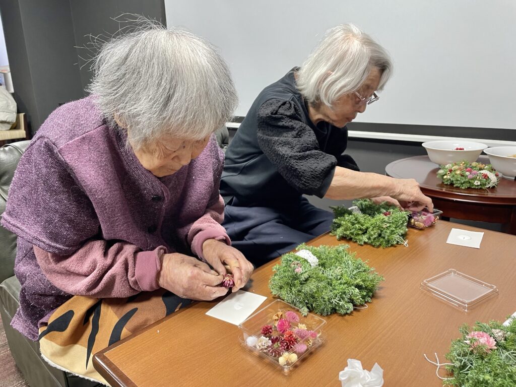 クリスマスの思い出話に花を咲かせながら、あっという間にクリスマスリースの完成です🎄