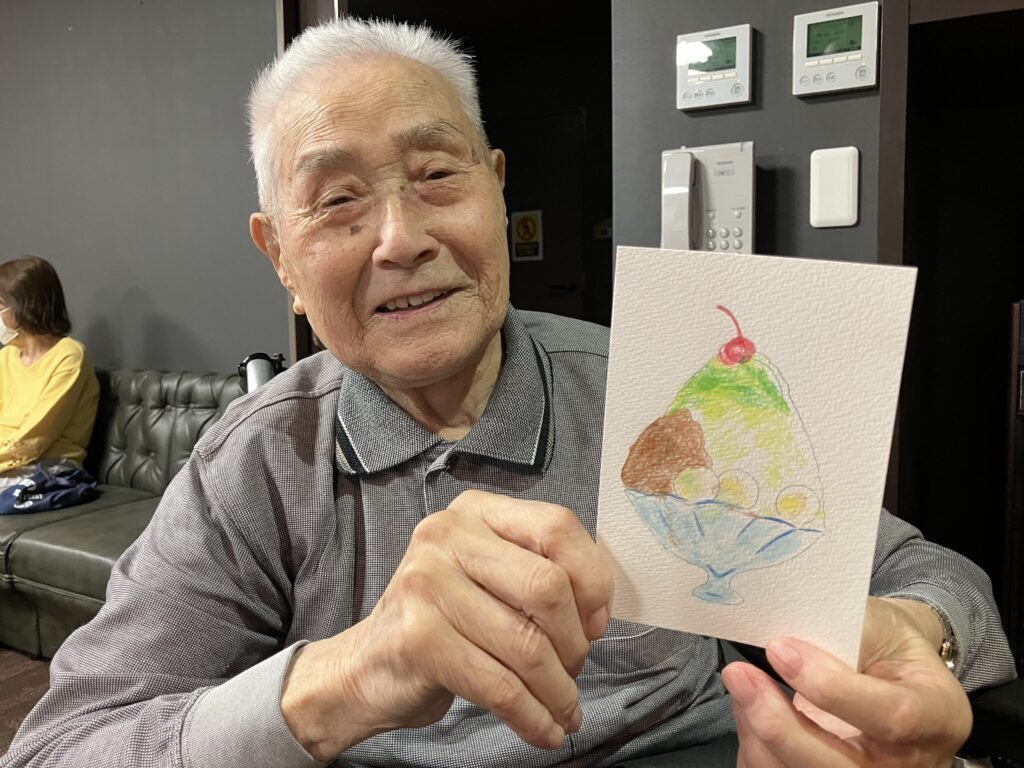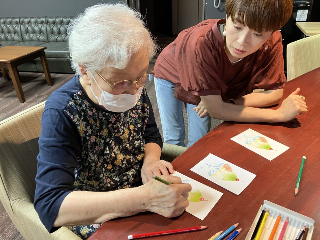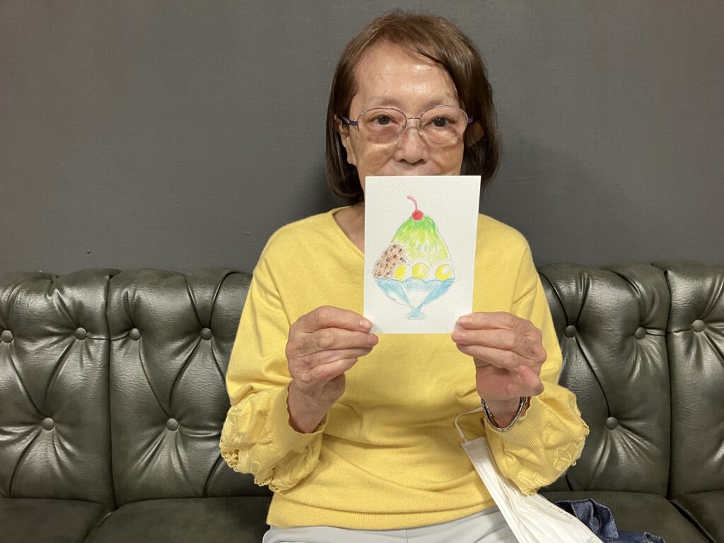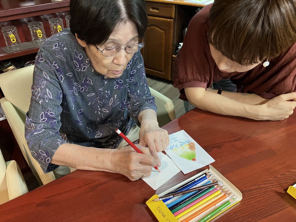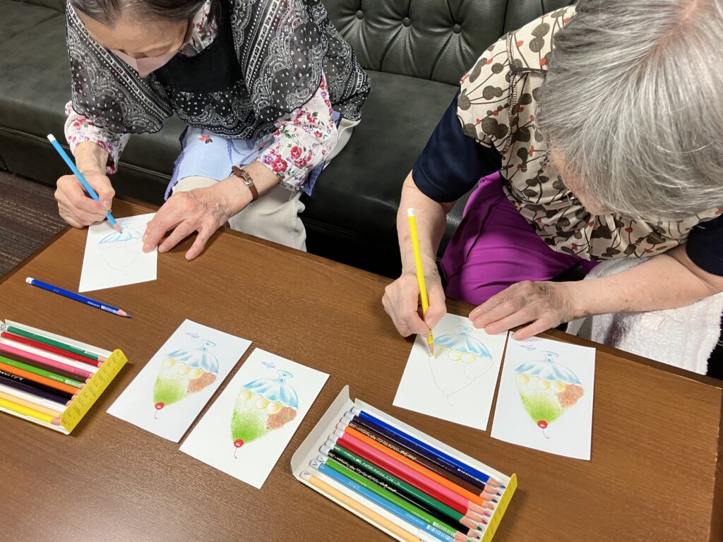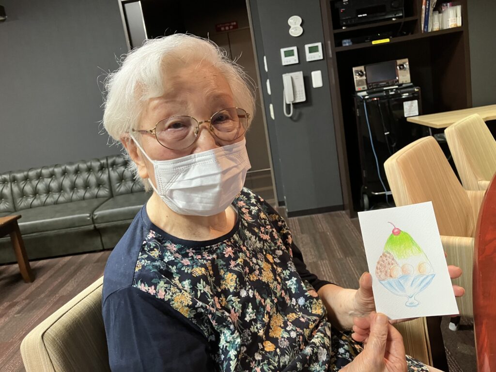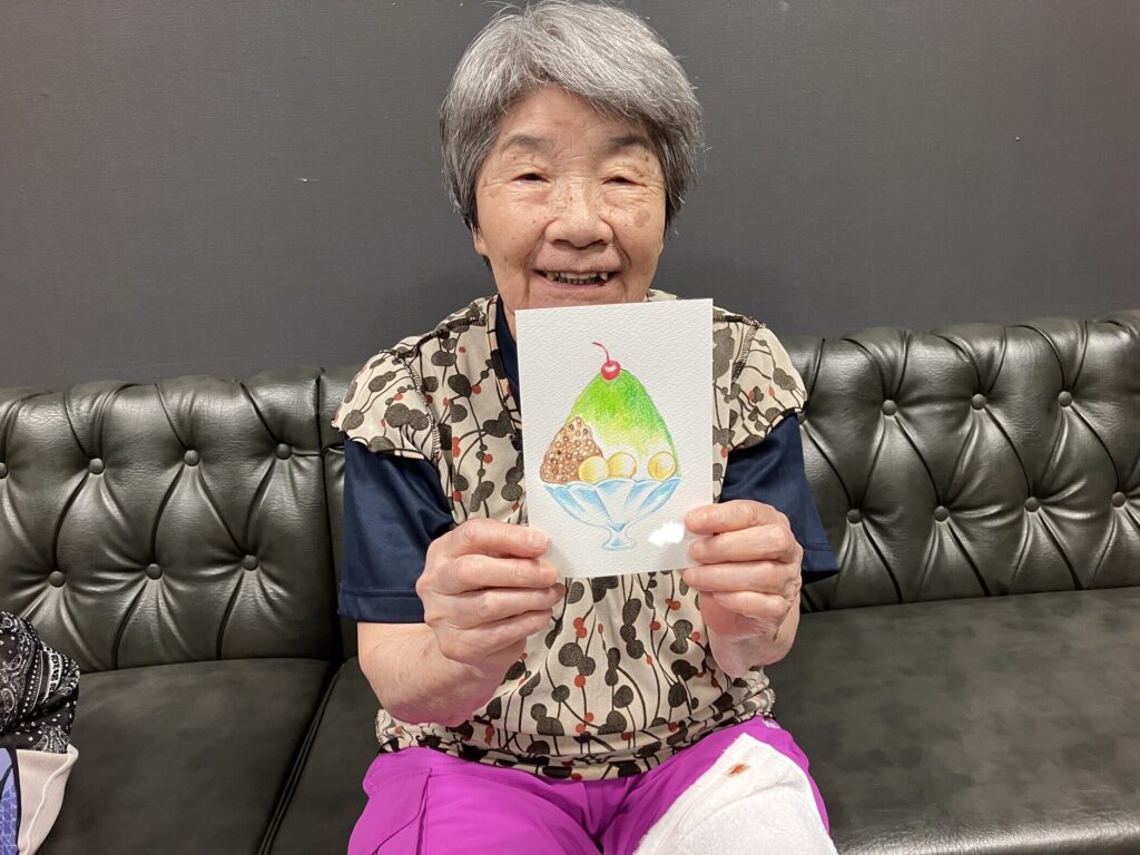 「かき氷って今どれくらいするのかな?」「抹茶ミルク大好きなのよ😍」とかき氷トークで盛り上がりながらも塗り絵の完成です♡👏👏