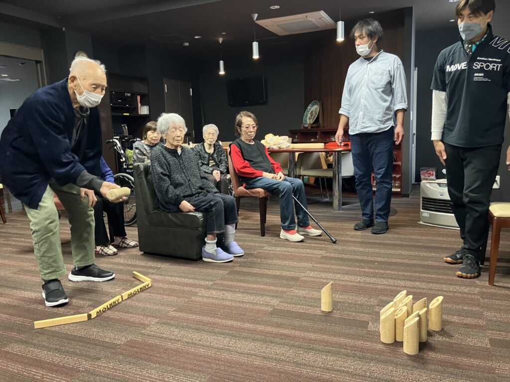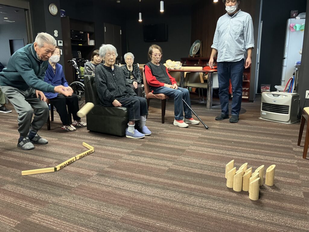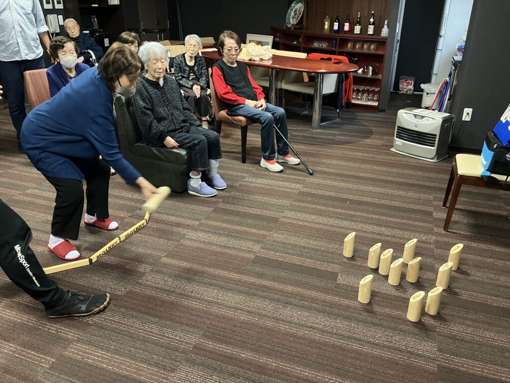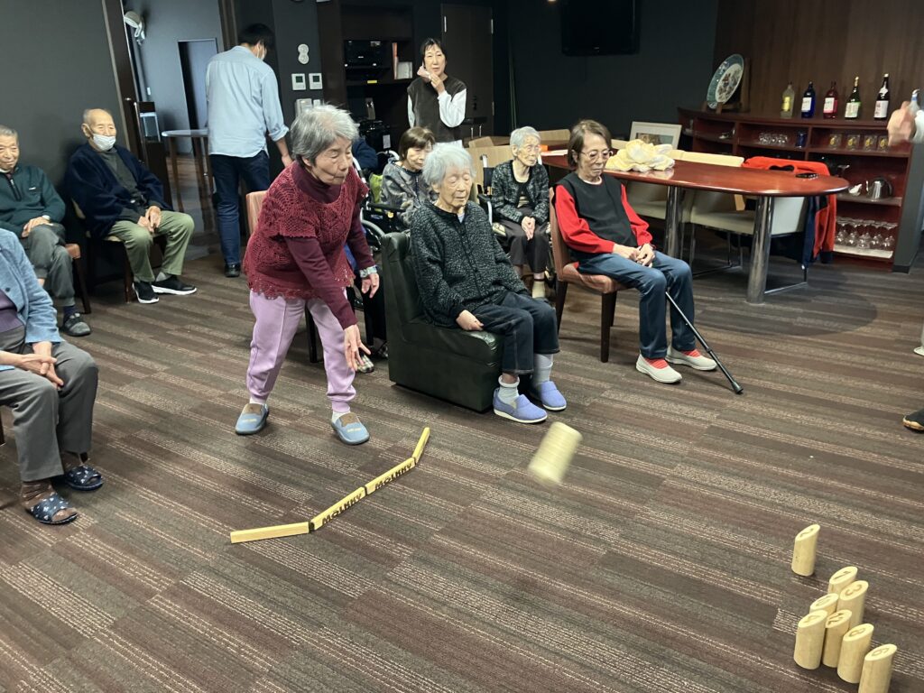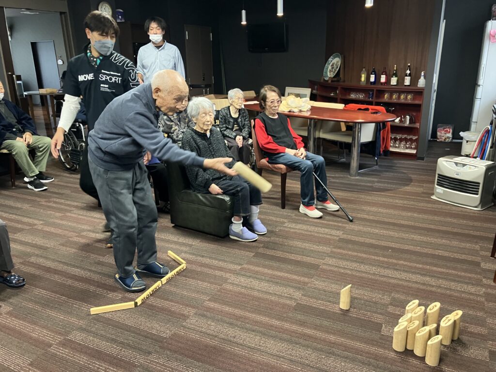 フィンランド発祥のスポーツで、木の棒を投げて数字の書かれた木製のピンを倒し、合計得点をきそいます‼︎