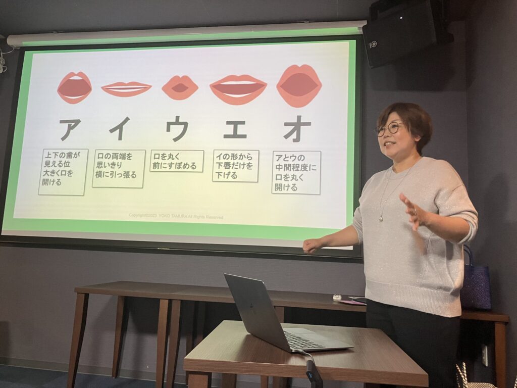 『では、正しいお口の形であ、い、う、え、おと発声していきましょう❗️』と、配布された資料やモニターに映るイラスト、田村先生の口の動きを皆さんそれぞれ確認されながら発声です!