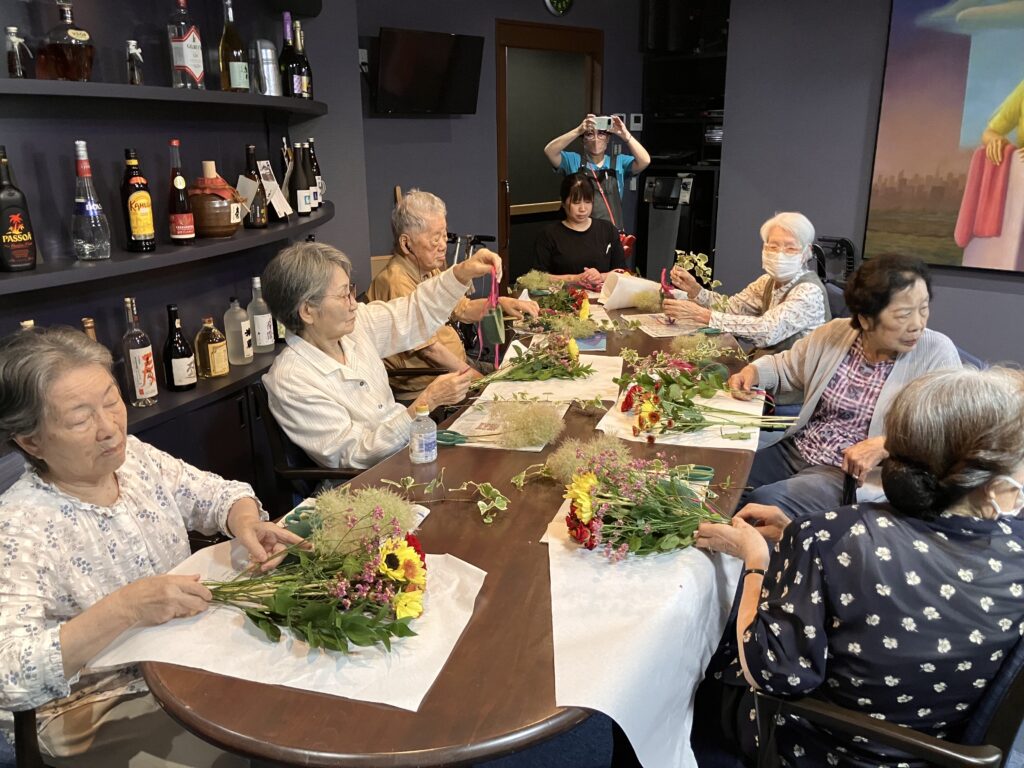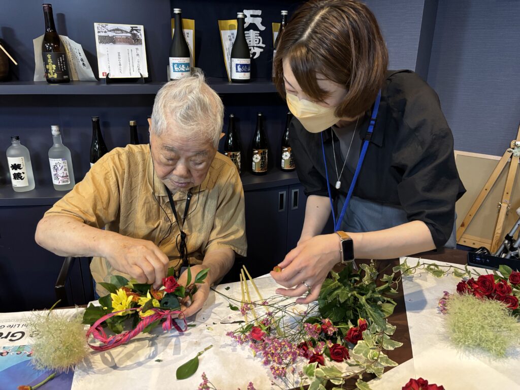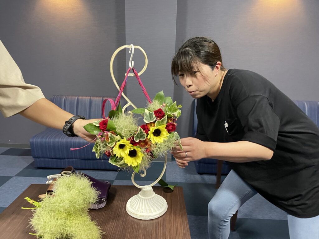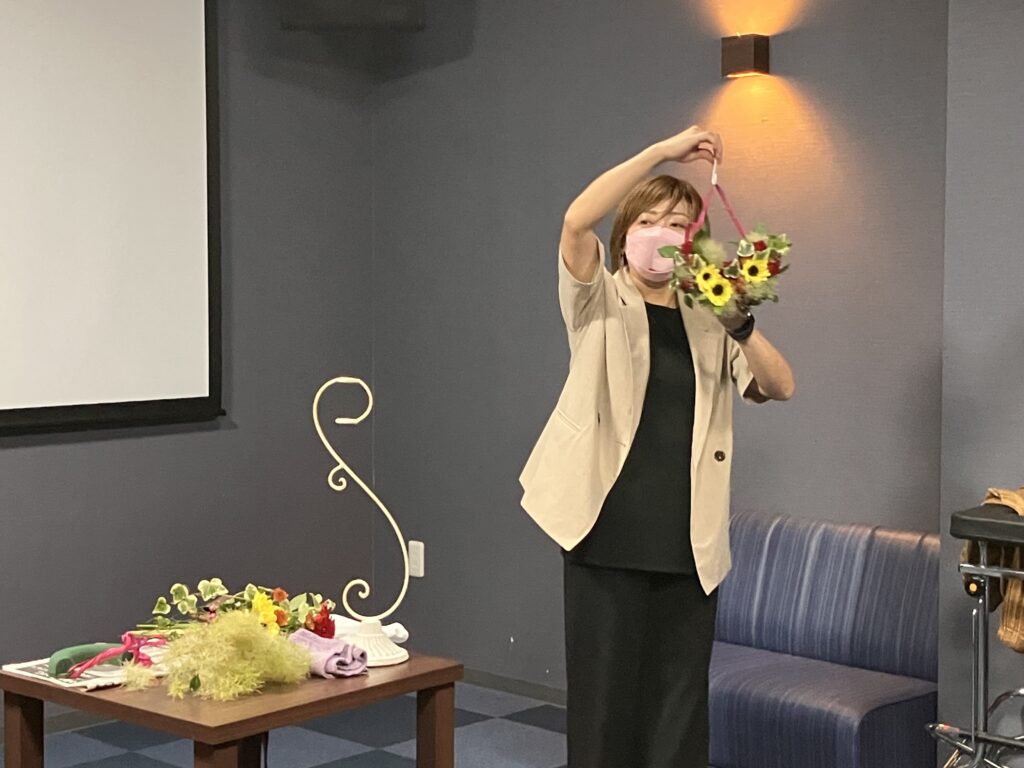 今日は由利本荘の花屋さん「フラワーショップ牧野」さんに来て頂き、フラワーアレンジメント体験を皆さんに楽しんでいただきました!