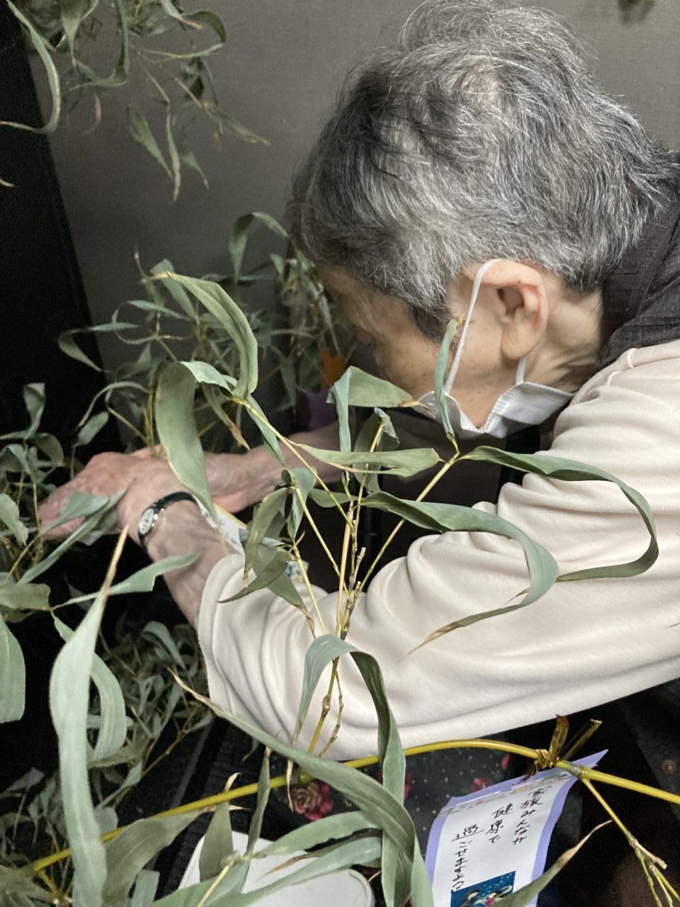 「これでいいの?」「昨日短冊書いたわよ、これが私のよ。どこに飾ろうかな・・」などにぎやかに、思い思いの短冊や飾りをつけました。