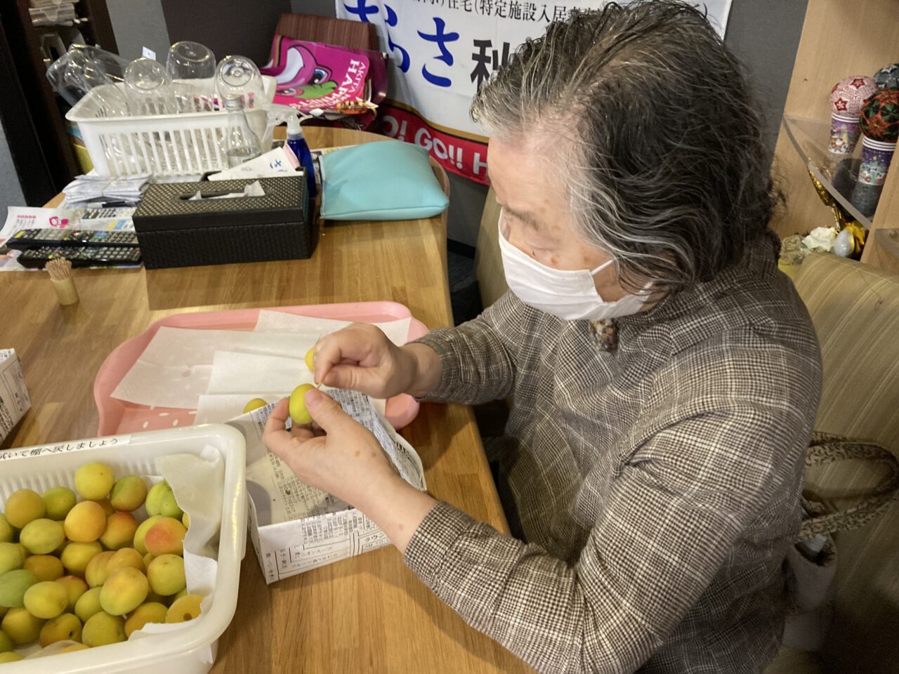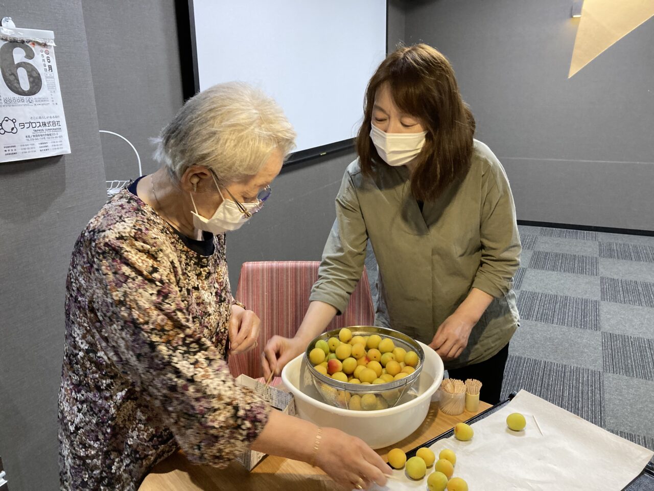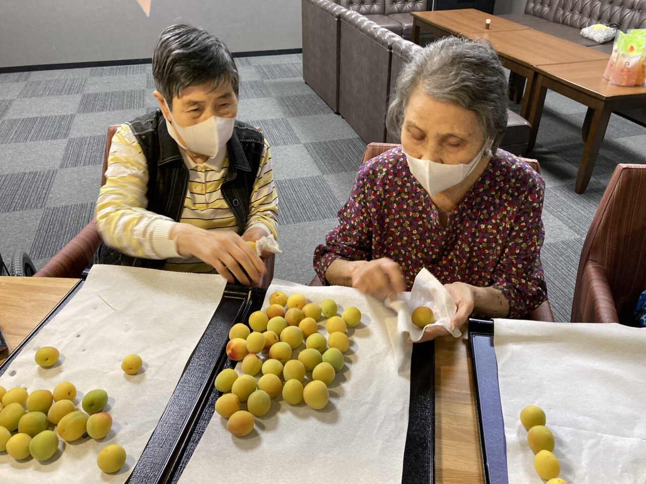 次に、洗った梅のへたを取る係と水分を拭きとる係に分かれ、皆さんで下準備が着々と進みます?