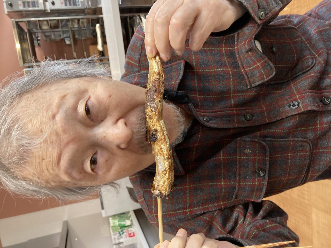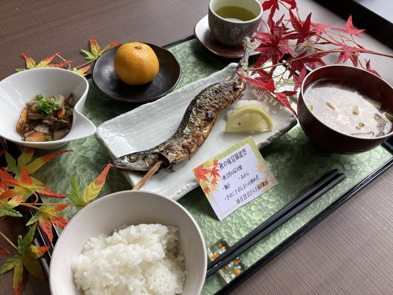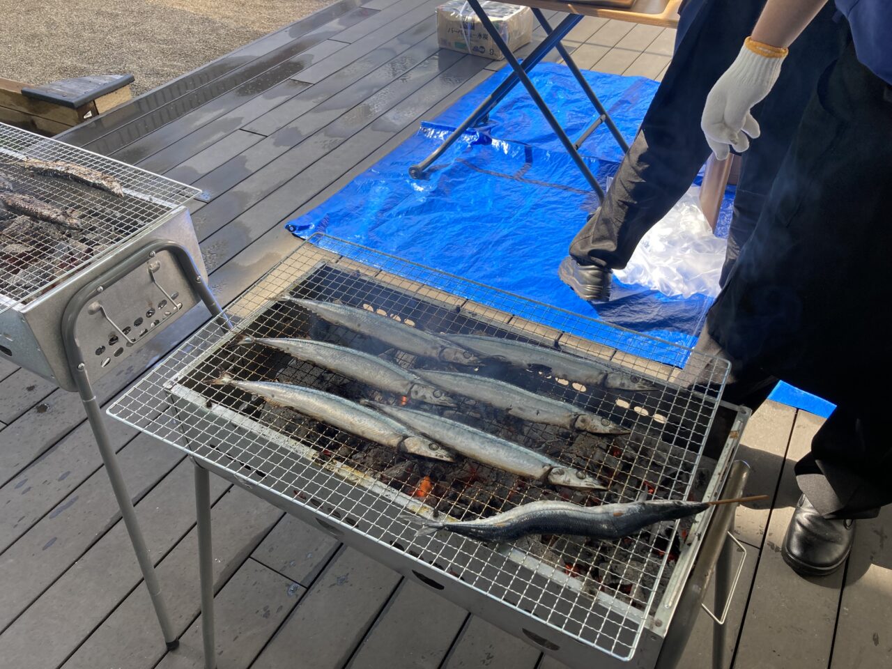 テラスで佑平パートナーと一富士さんで炭火で焼いた秋刀魚の良い臭いが館内まで?